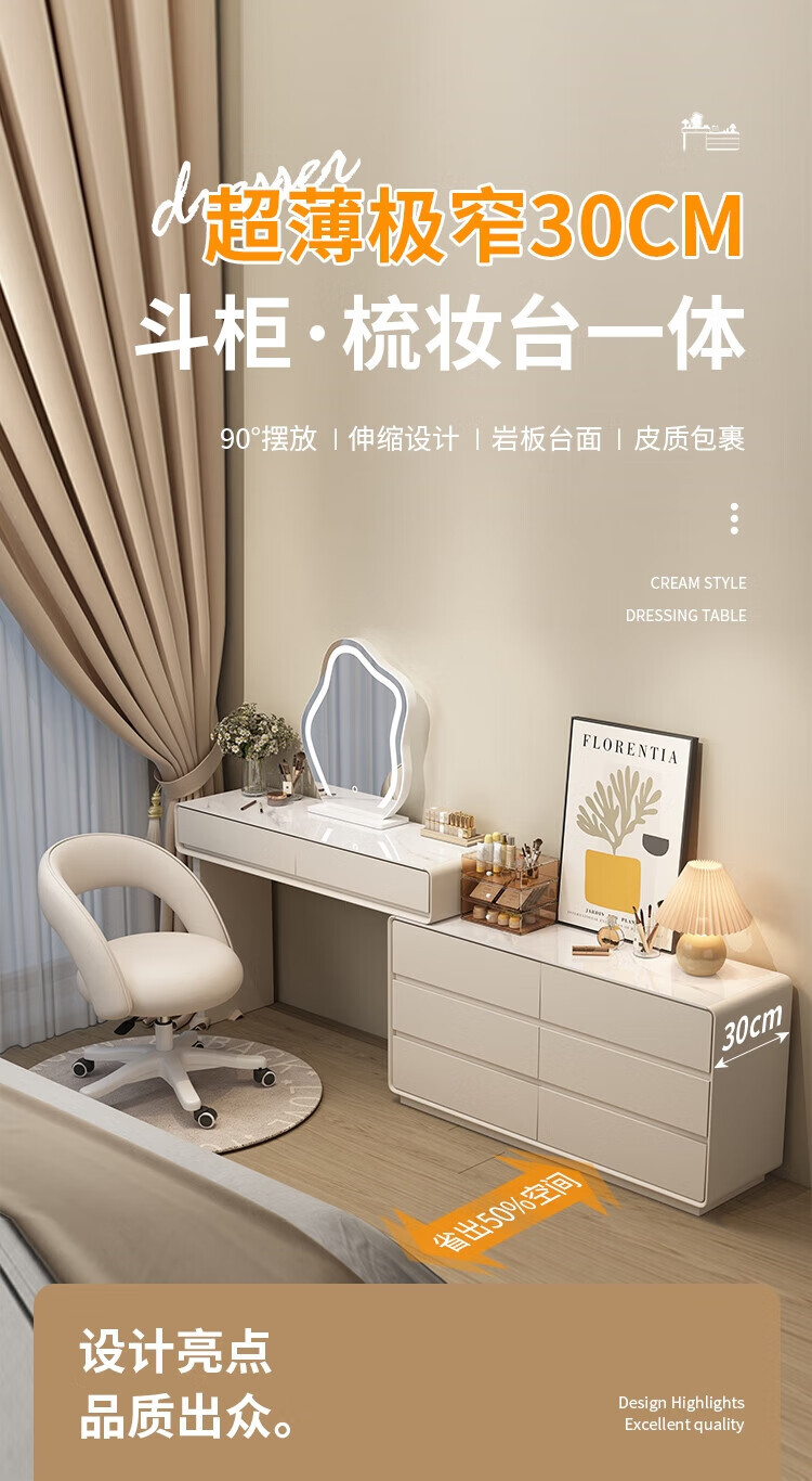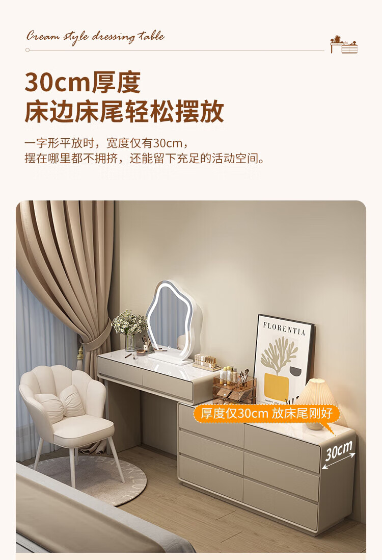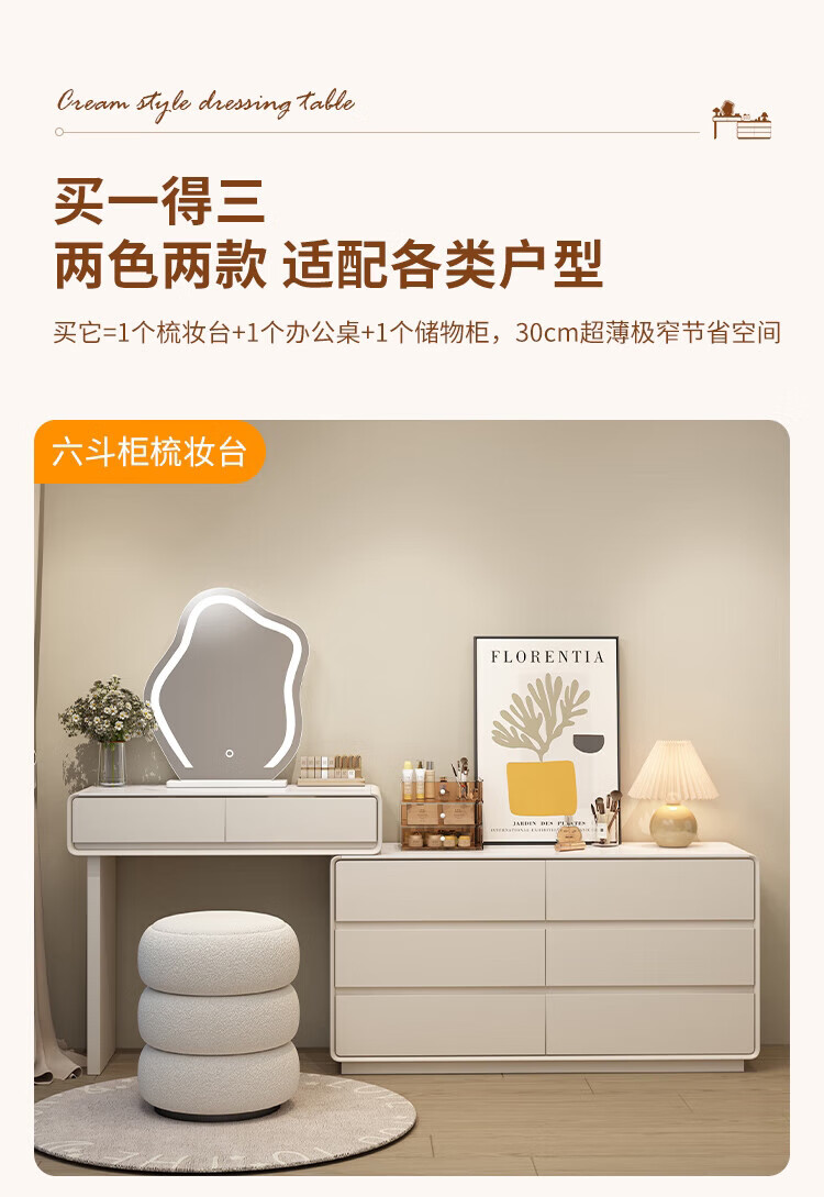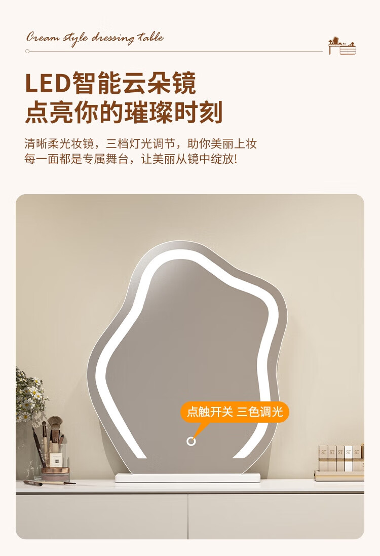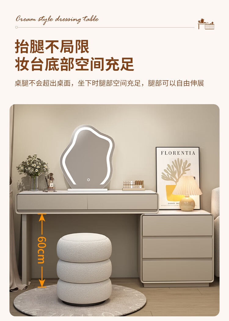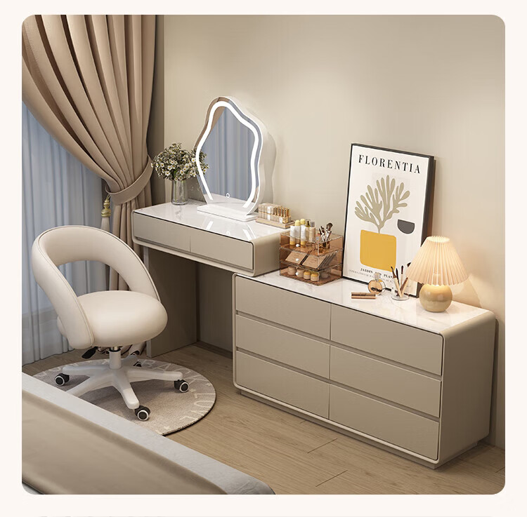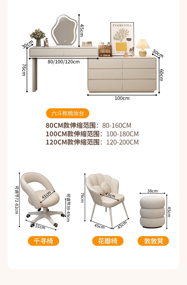 Xinang Dressing Table Modern 2025 Cream Style Slate Bedroom Simple New Light Luxurious Style Solid Wood Dressing Table and Cabinet In One 80cm White + Three Drawer Cabinet + Cloud Mirror + Petal Chair
