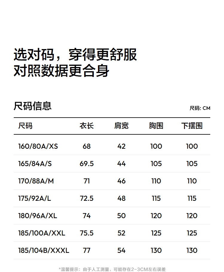 China (cm) 160-165/84-86 165-170 / 88-90 167-172 / 92-96 168-173 / 98-102 170-176 / 106-110