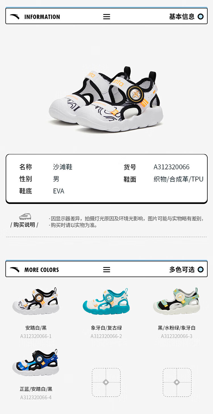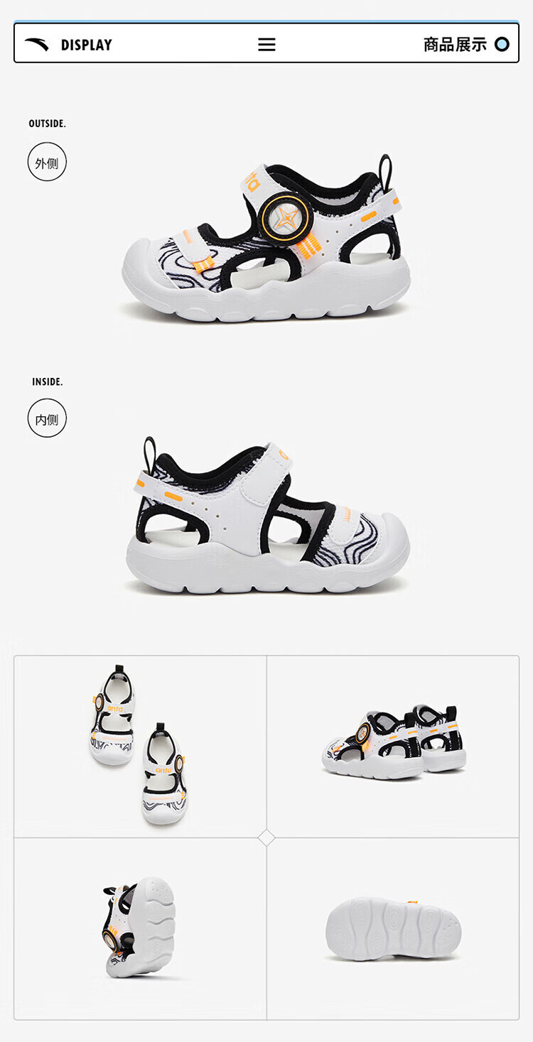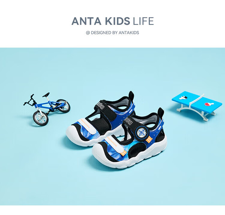 ANTA children's sandals, men's and women's baby shoes, 2025 summer new breathable Velcro octopus toe and foot protection beach shoes, men's model, pure blue/Anta white/black-4 21, shoe inner length 12.5cm