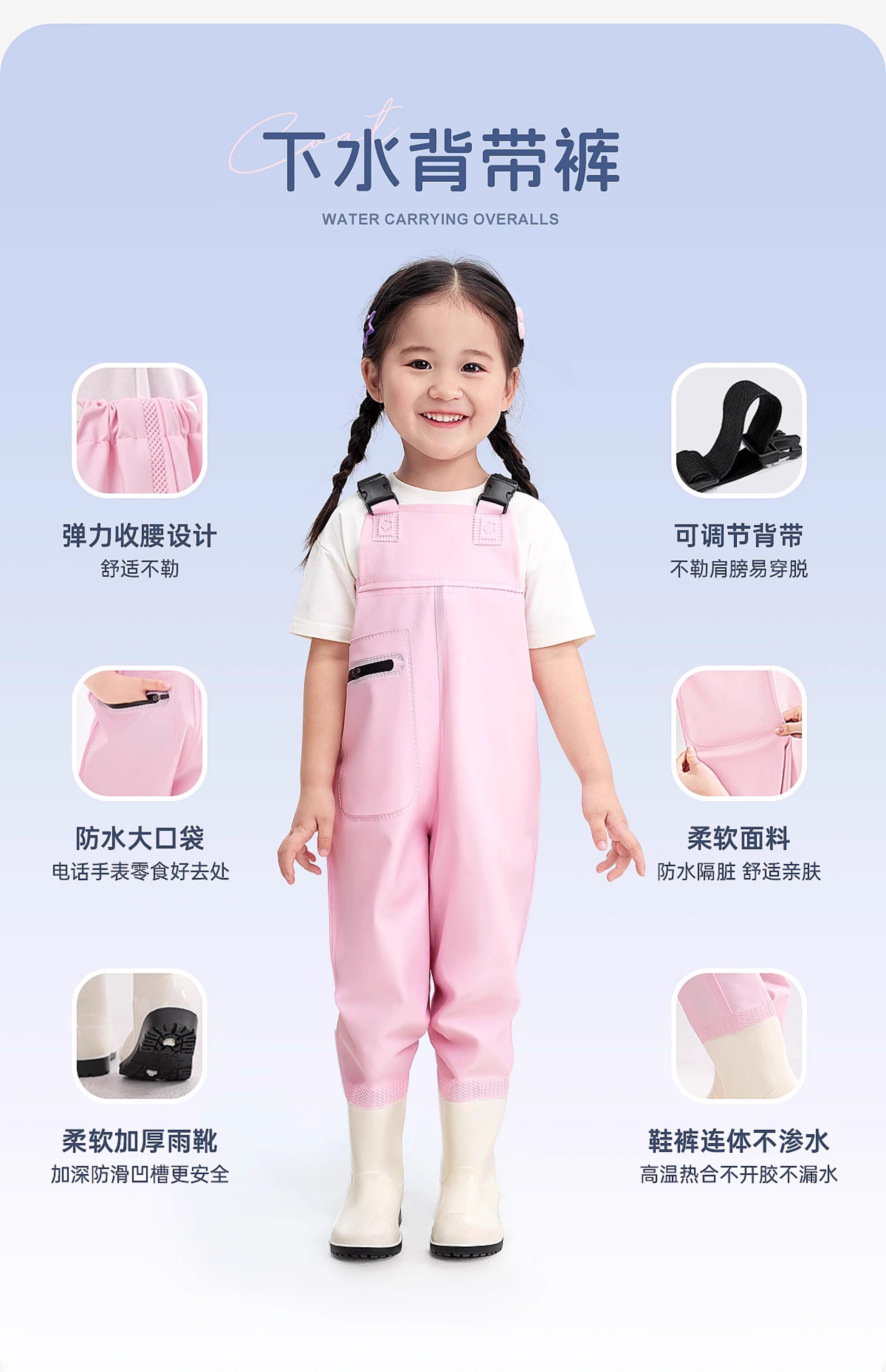 Jiangonggonghai clothing children's jumpsuit, outdoor children's waders, waterproof wading overalls and shoes to catch fish and catch the sea on the beach. Candy powder jacket + overalls / free storage bag 30 yards | It is recommended to take one size up for your daily shoe size