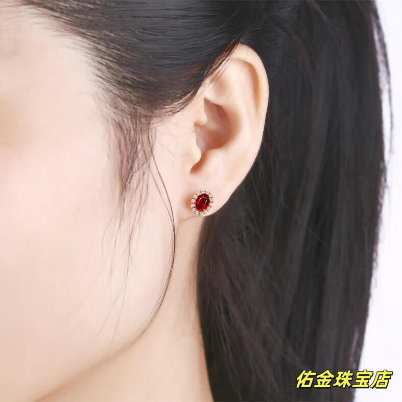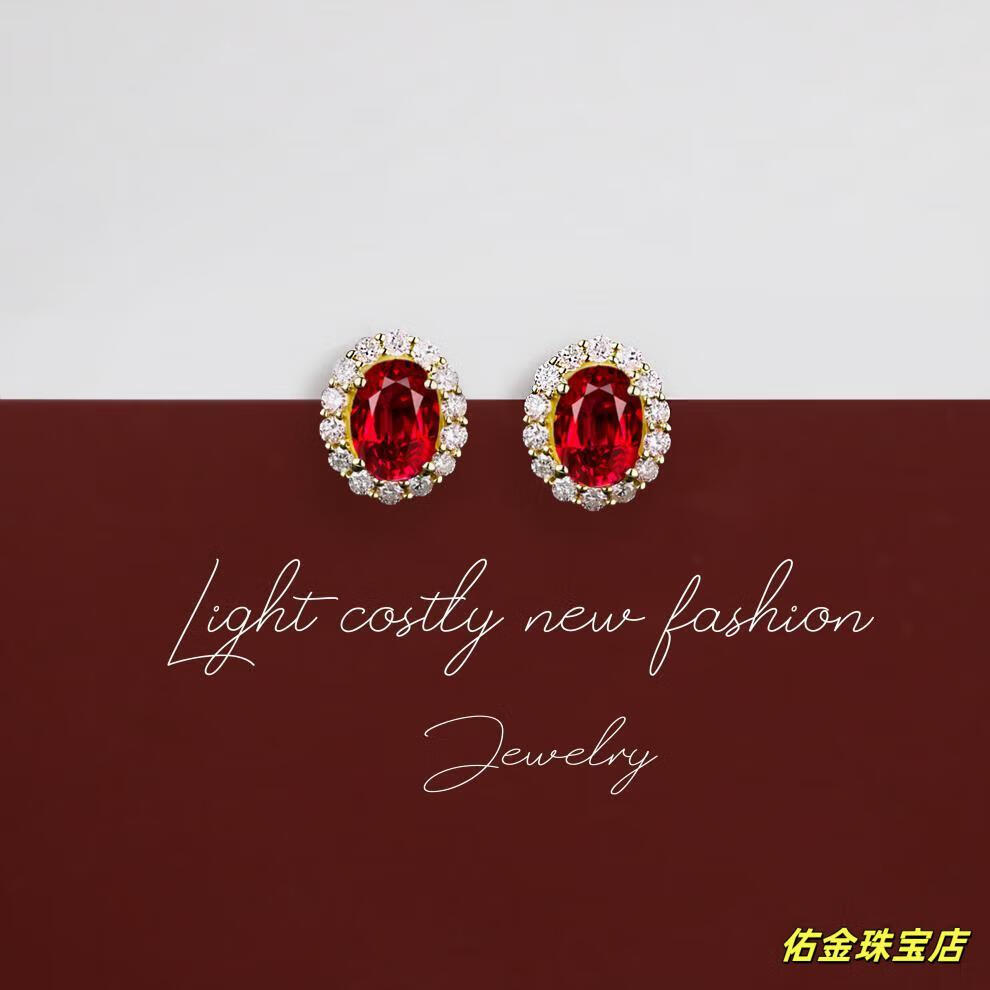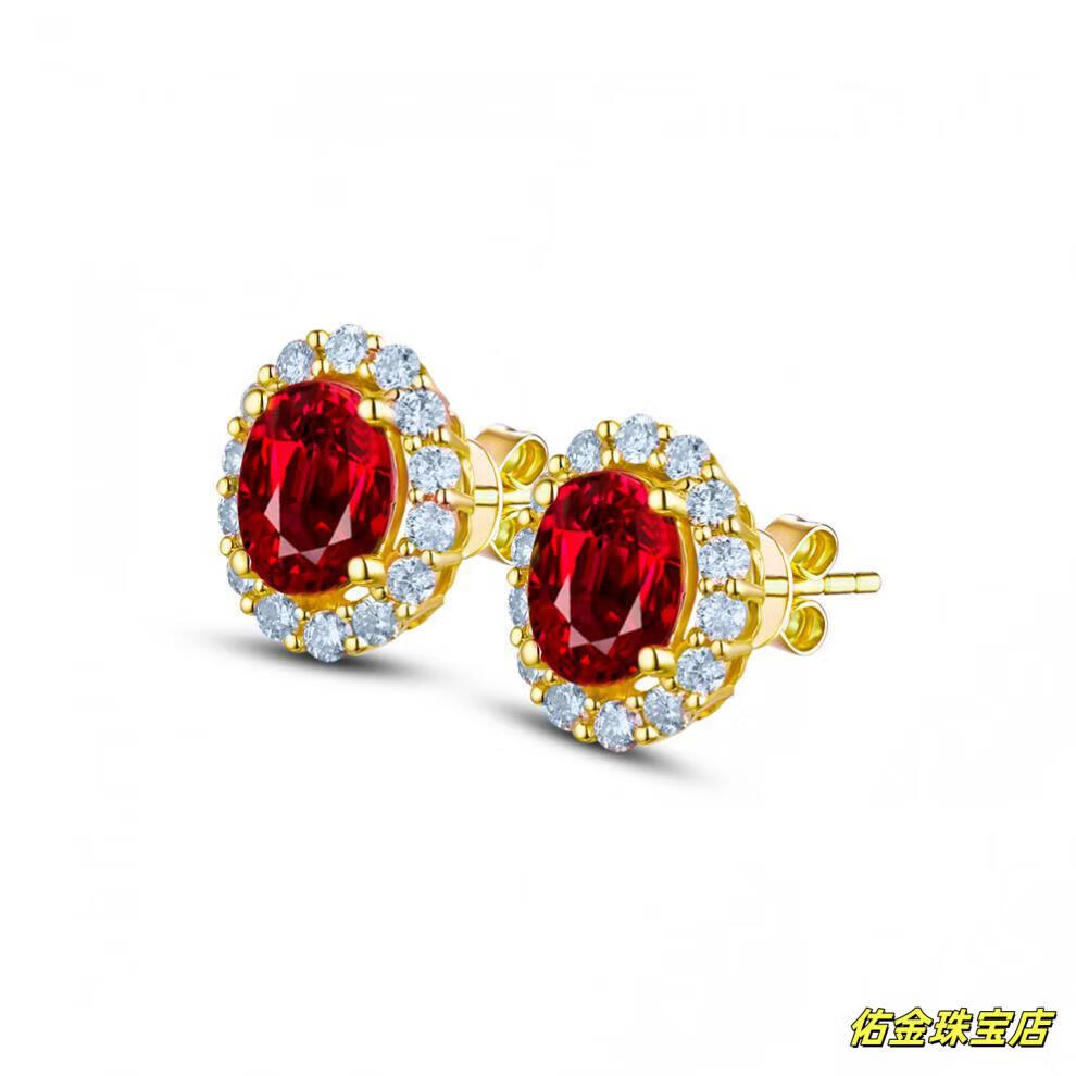 Feng Ruihuang Myanmar natural pigeon blood ruby earrings 18K gold inlaid diamond earrings sterling silver sweet colored treasure silver earrings pigeon blood ruby earrings oval size 8*9mm