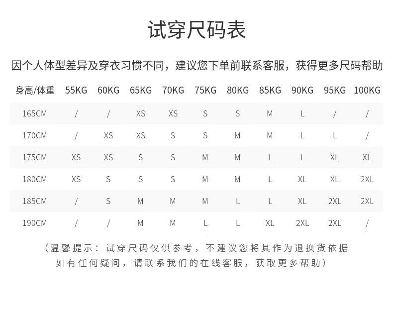 China (cm) 165 / 88-90 170 / 96-98 175 / 108-110 180 / 118-122 185 / 126-130
