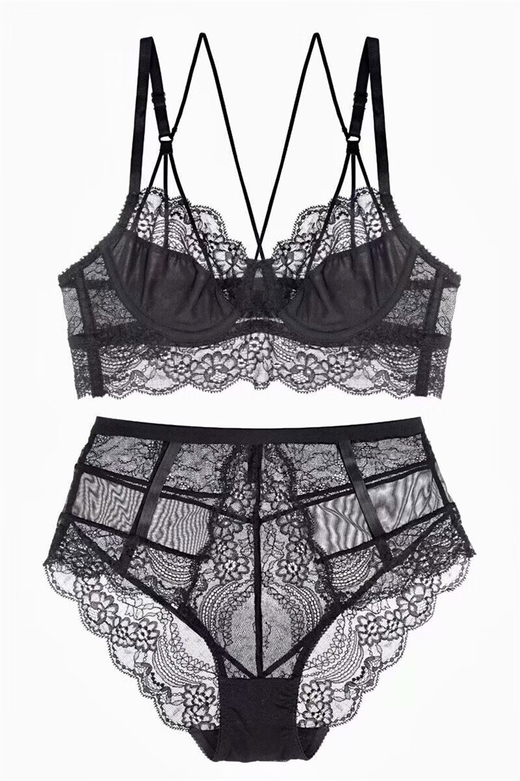 Victoria Palace large size underwear, beautiful back, big breasts and small underwear, ultra-thin sexy lace push-up, comfortable, breathable and sexy bra set, black 90C (with XXL size underwear)