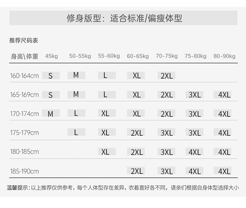 China (cm) 160-165/84-86 165-170 / 88-90 167-172 / 92-96 168-173 / 98-102 170-176 / 106-110