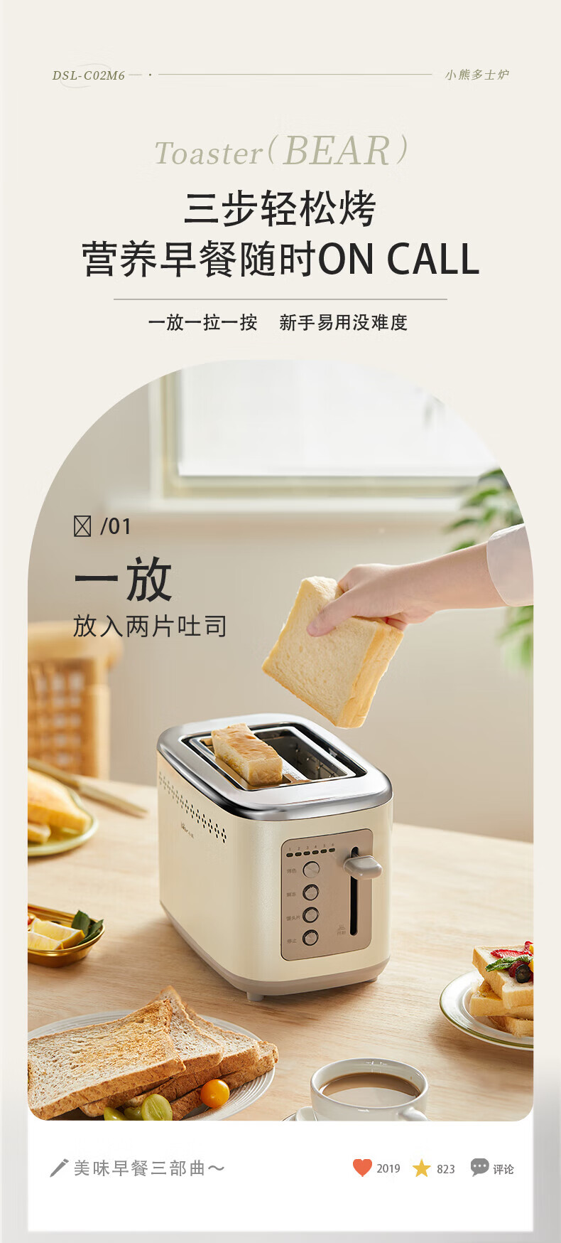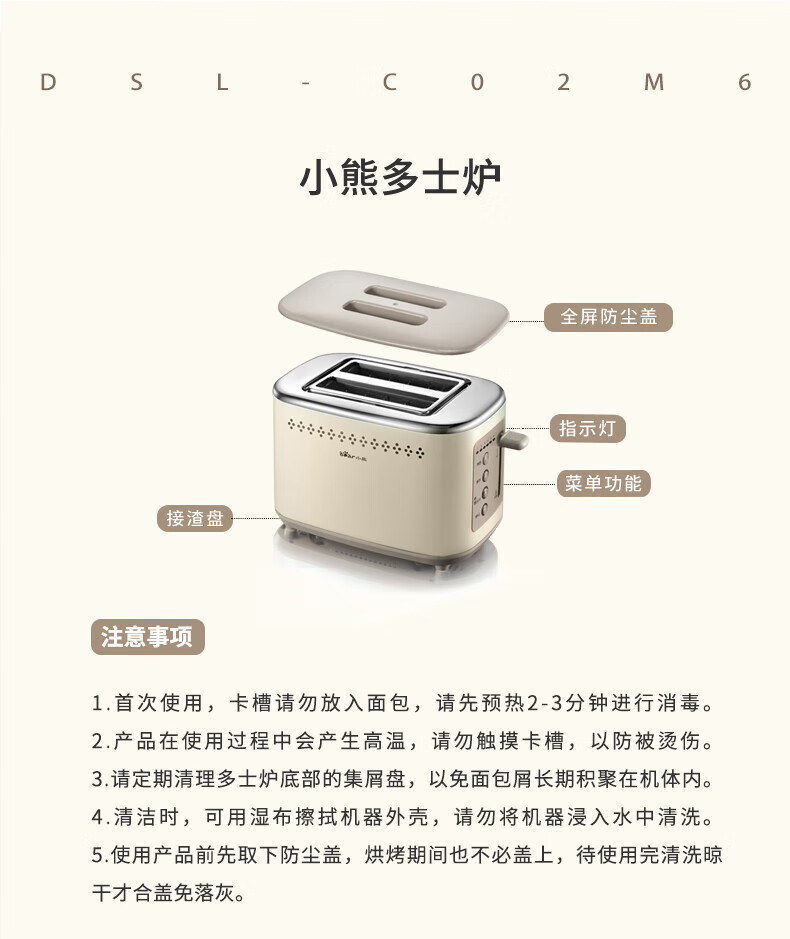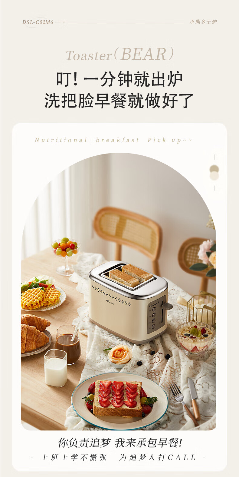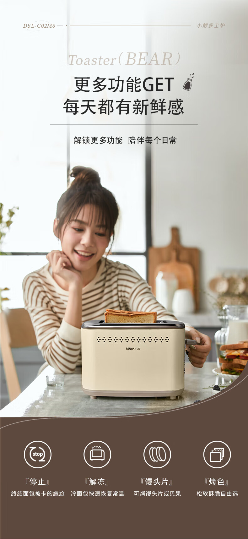 Bear Bread Machine Toaster Toaster Breakfast Automatic Household Small Toaster Steamed Bun Toaster Stainless Steel Toaster DSL-C02M6丨Stainless steel edging + 6-stop baking + with dust cover