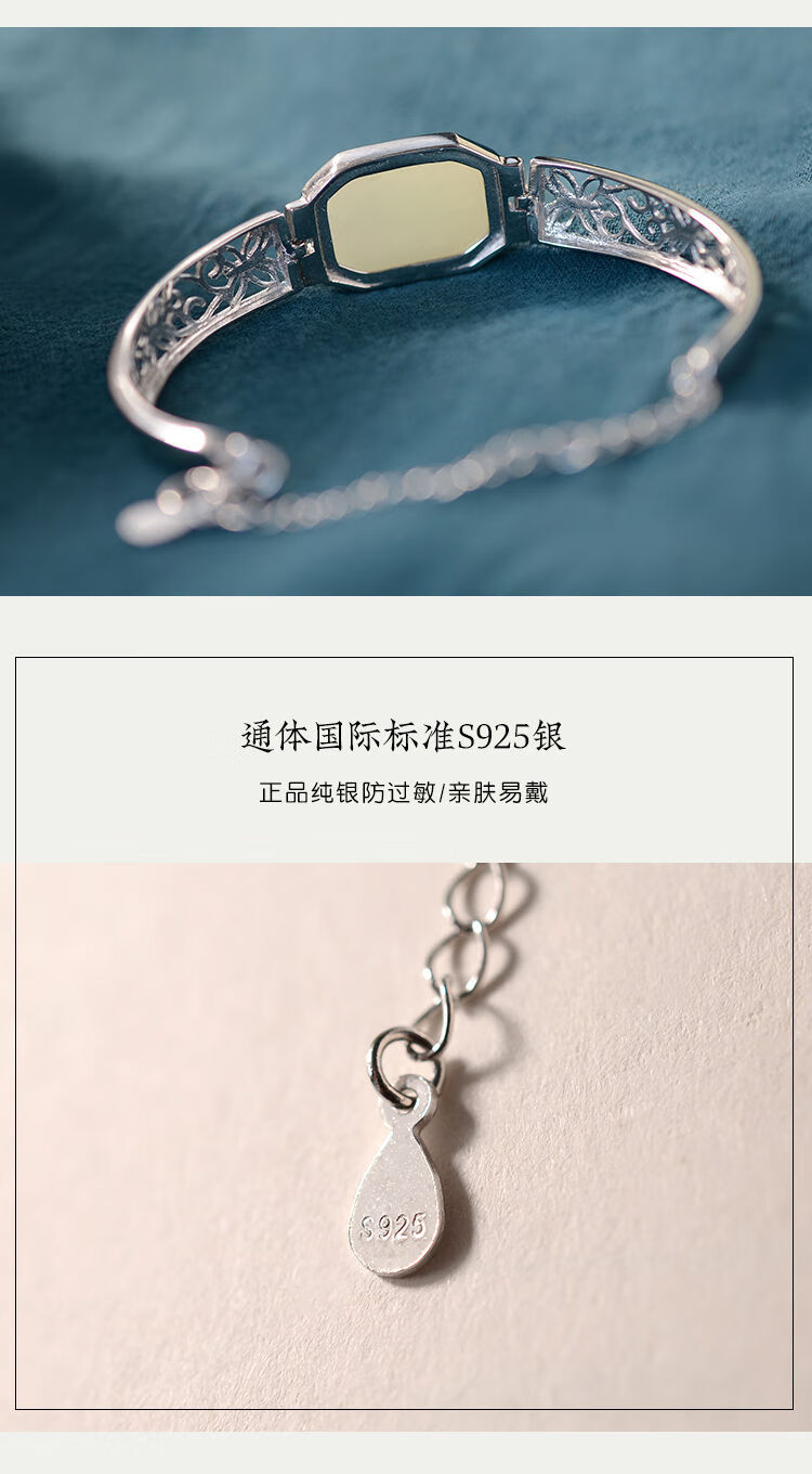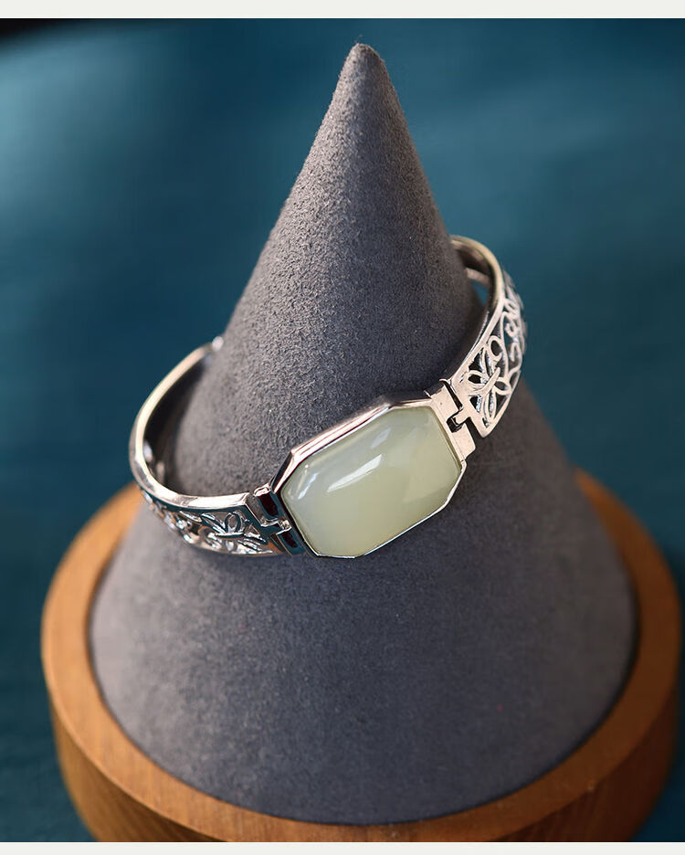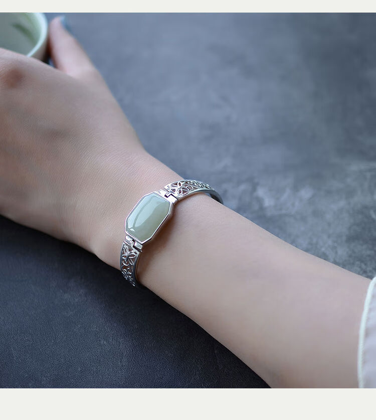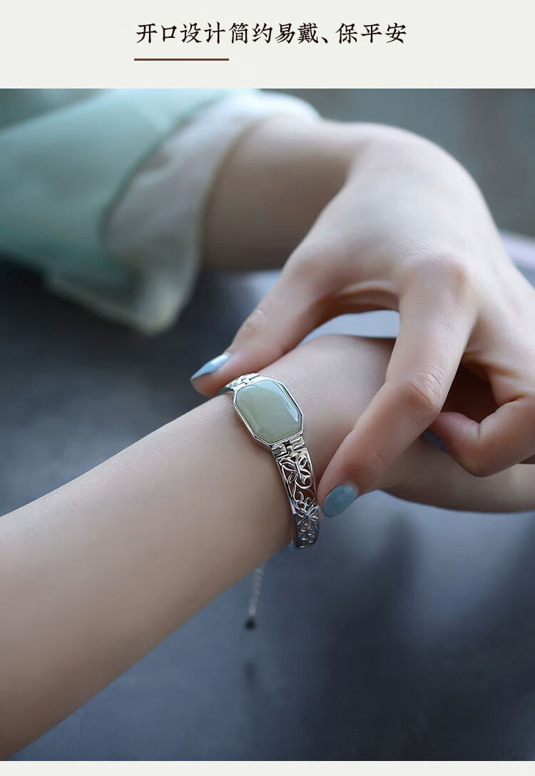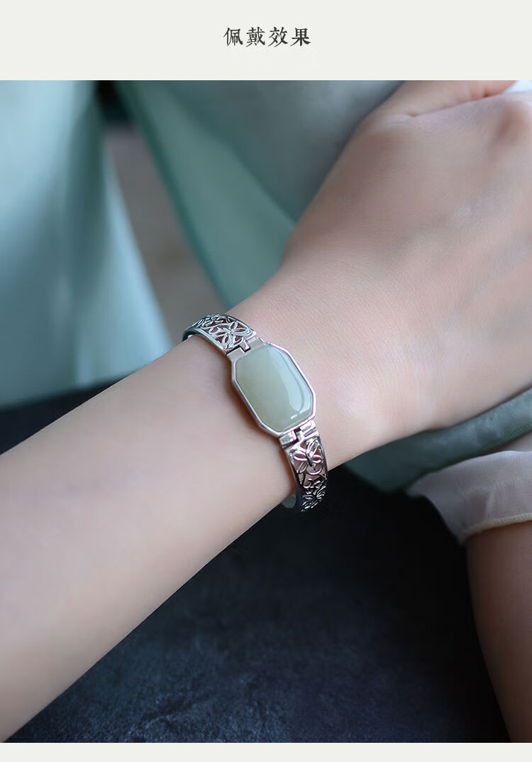 Mo Qianxue Ping An Wu Shi brand 925 silver hollow bracelet new Chinese style Hetian jade bracelet jade bracelet open Chinese style half bracelet for women hollow Hetian jade bracelet