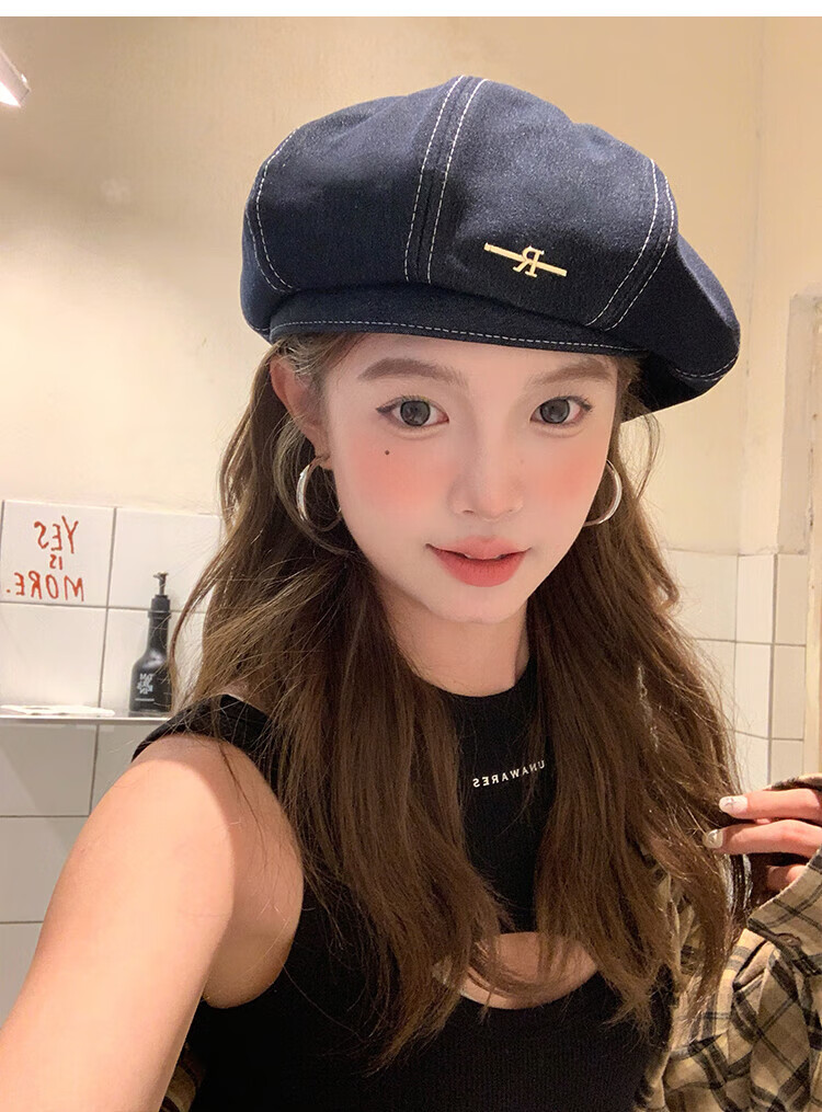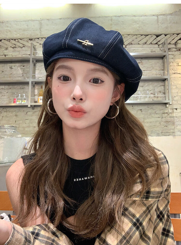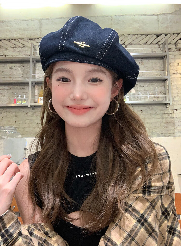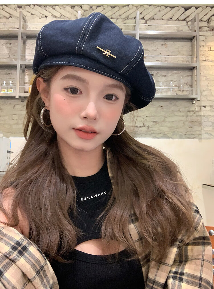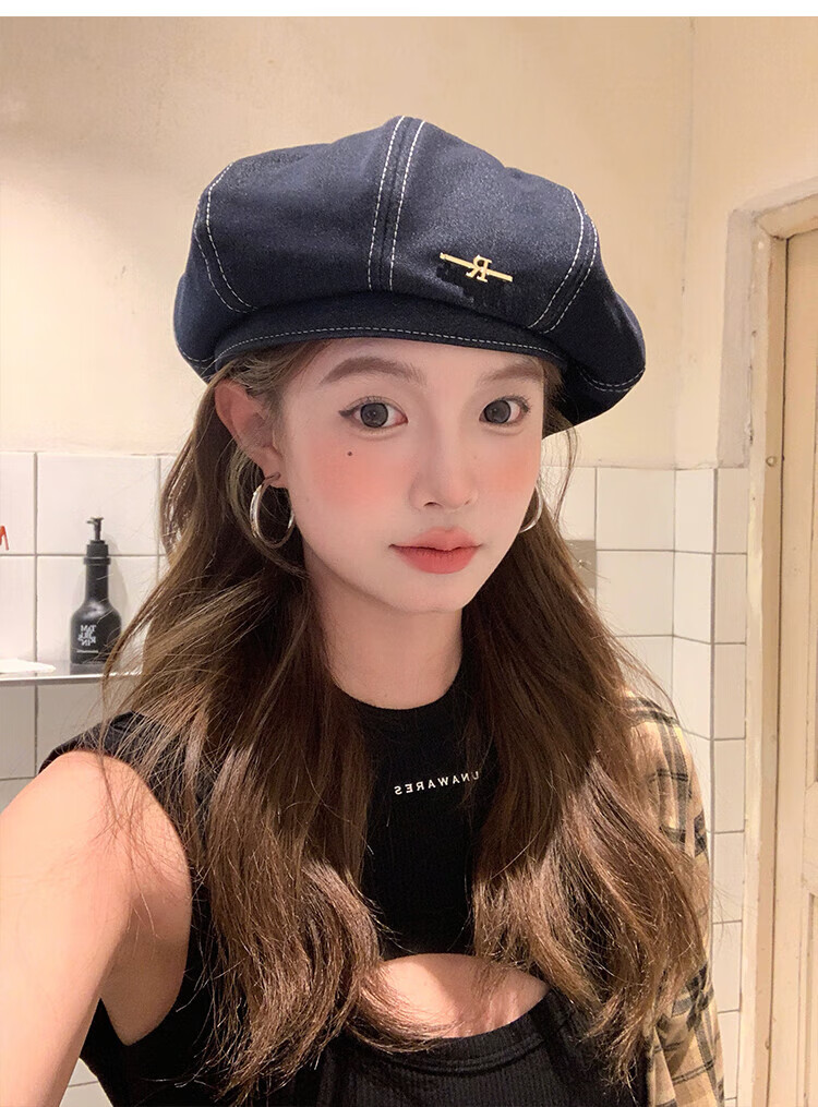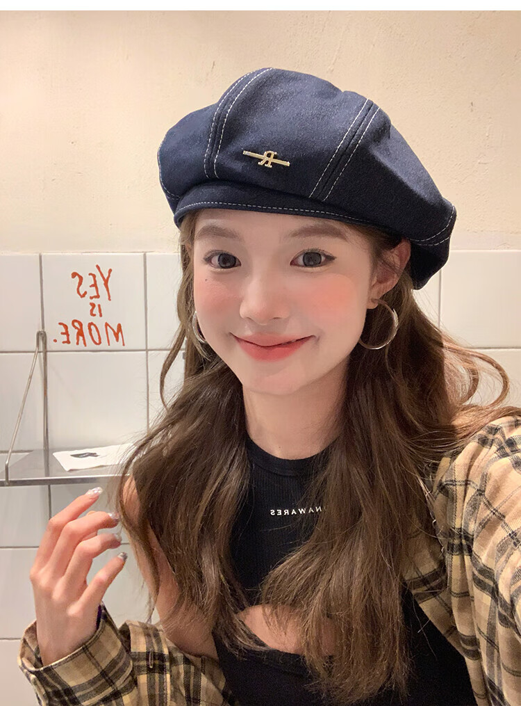 Wanjiazhen denim beret women's summer Korean style all-match beret hat Japanese style big head circumference slim octagonal hat painter hat metal R mark dark blue