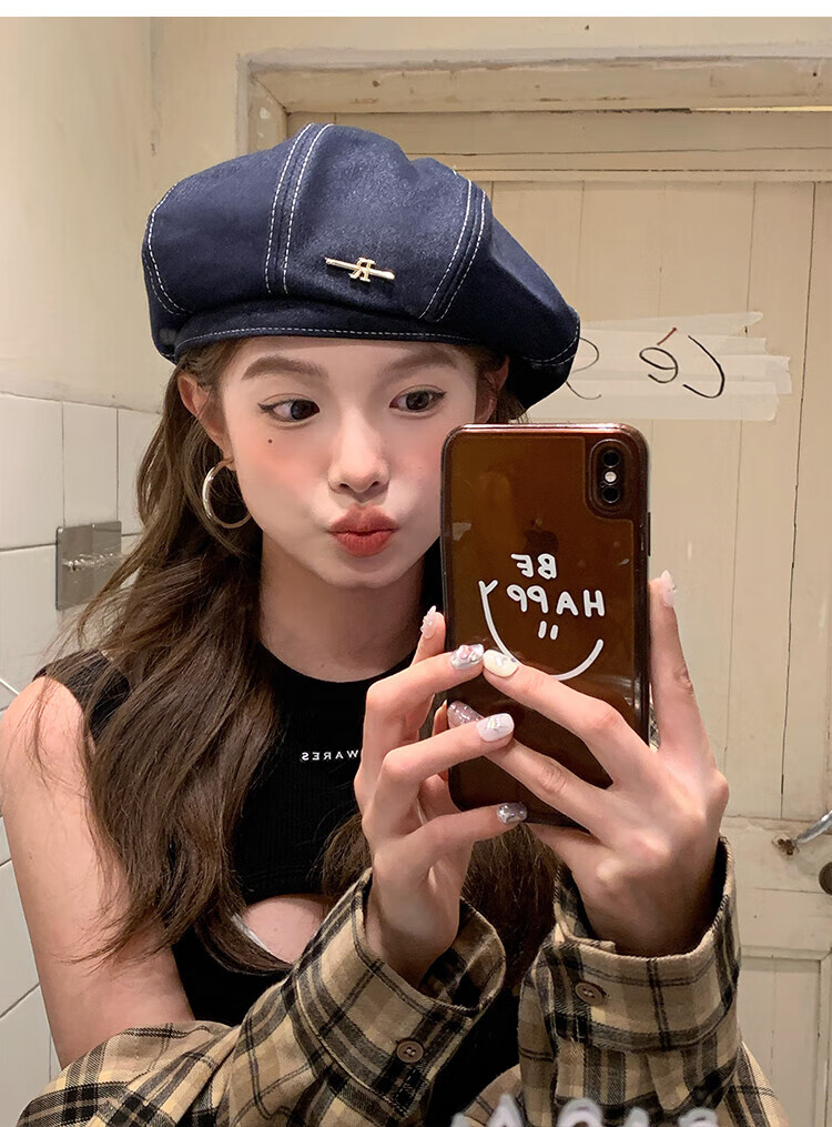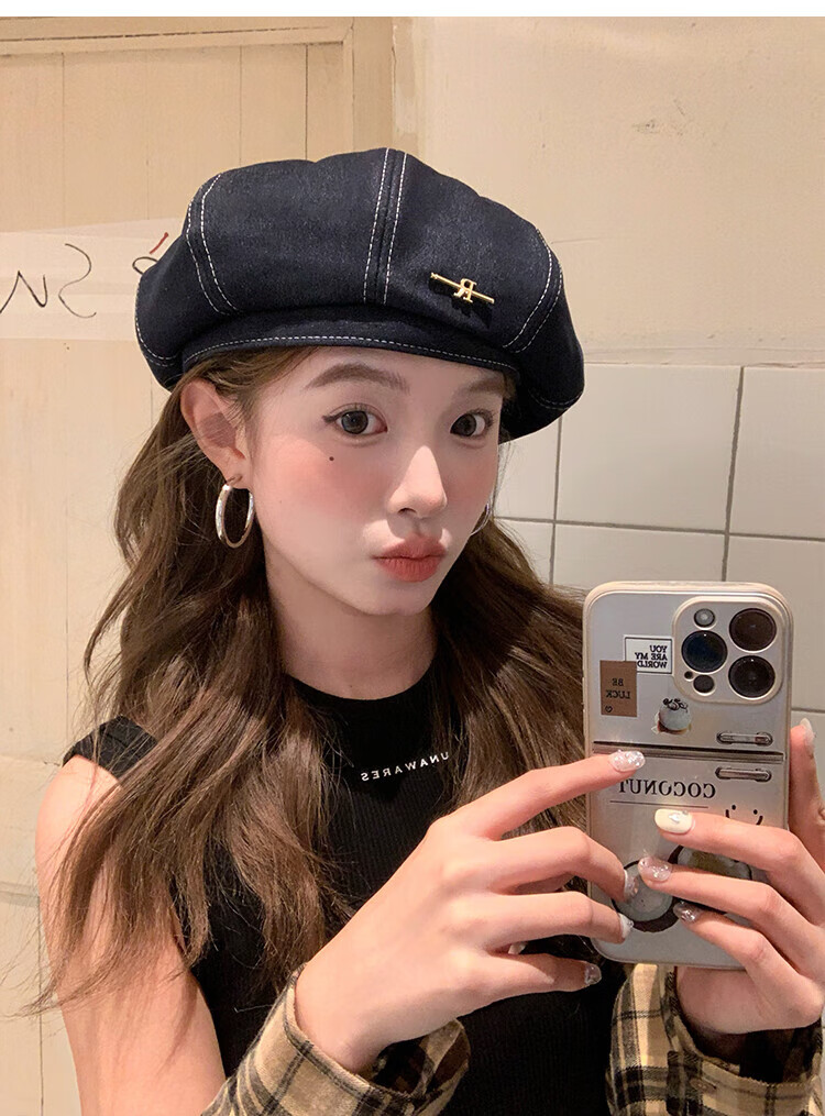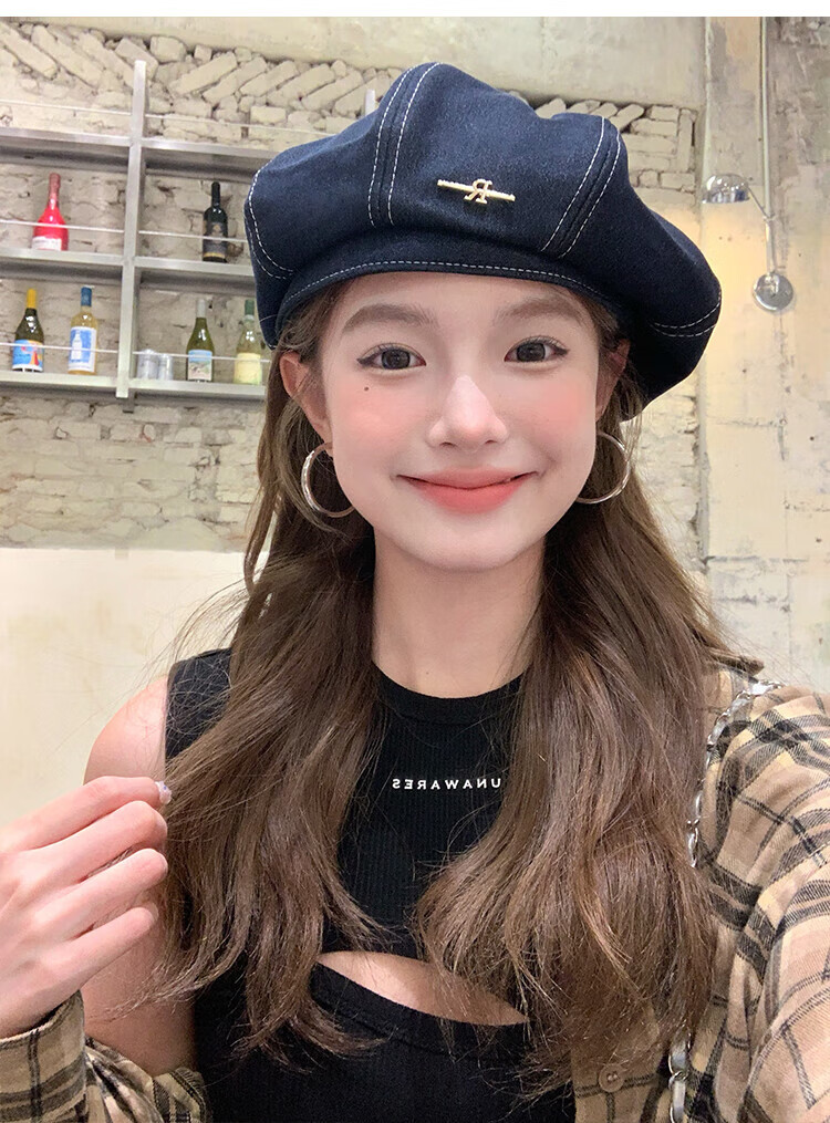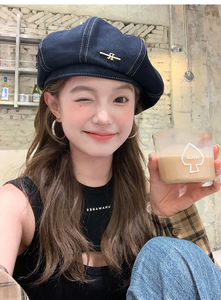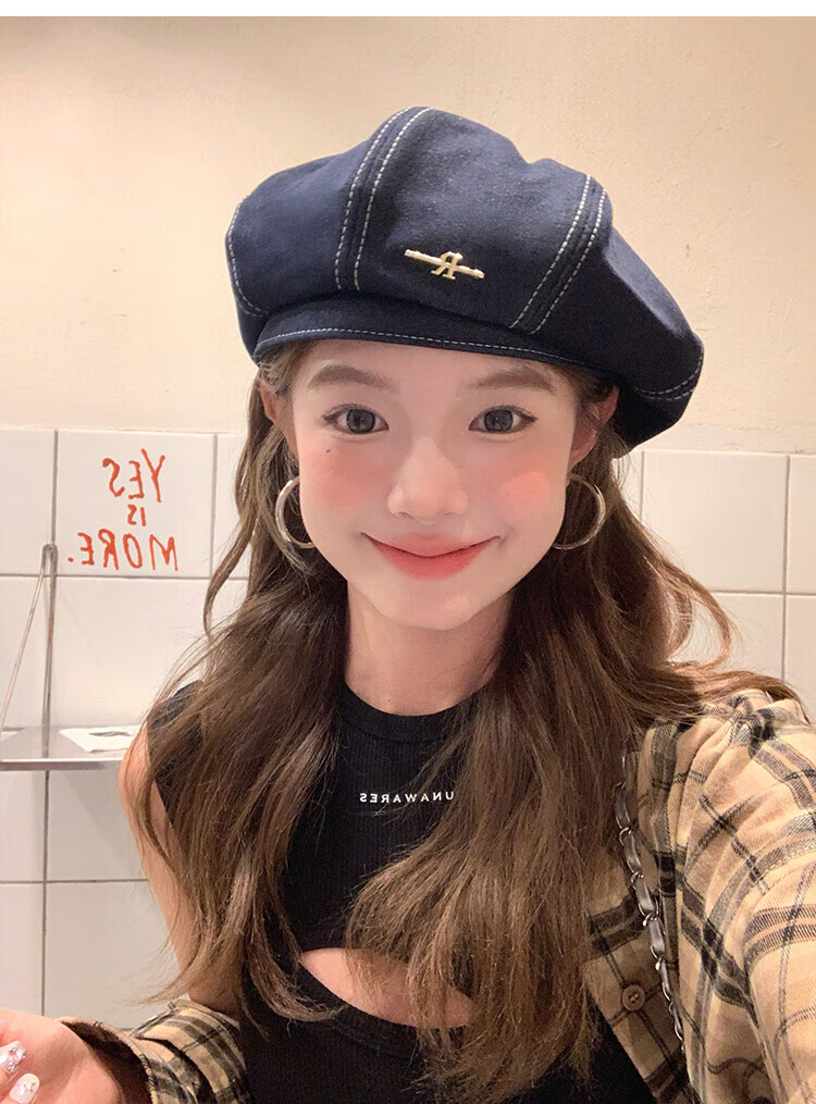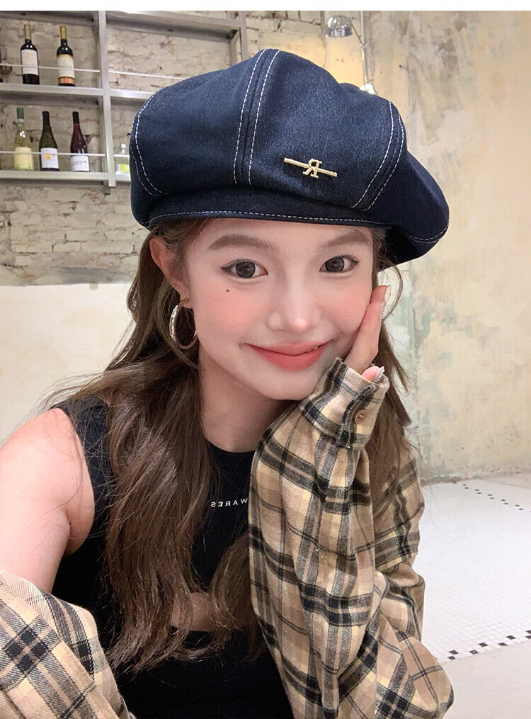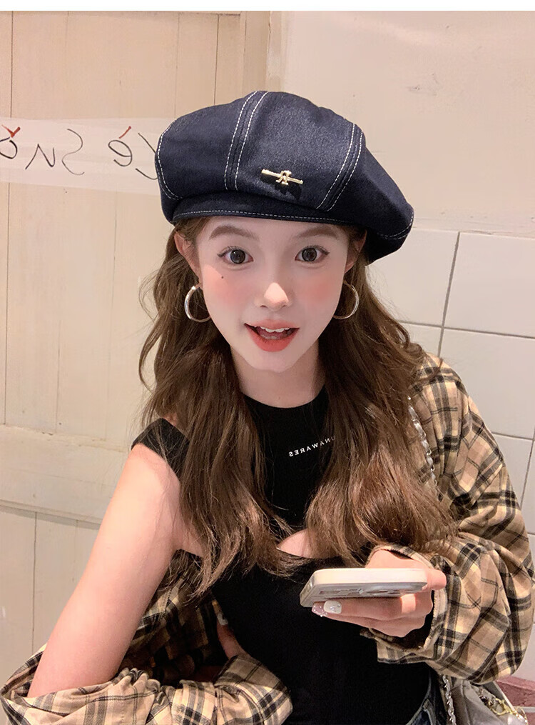 Wanjiazhen denim beret women's summer Korean style all-match beret hat Japanese style big head circumference slim octagonal hat painter hat metal R mark dark blue