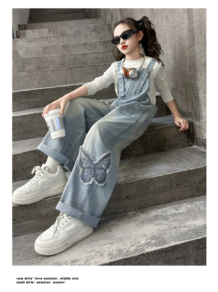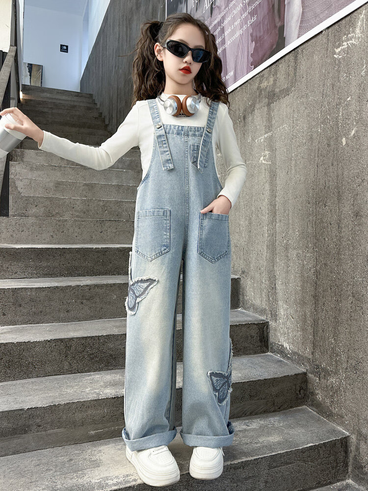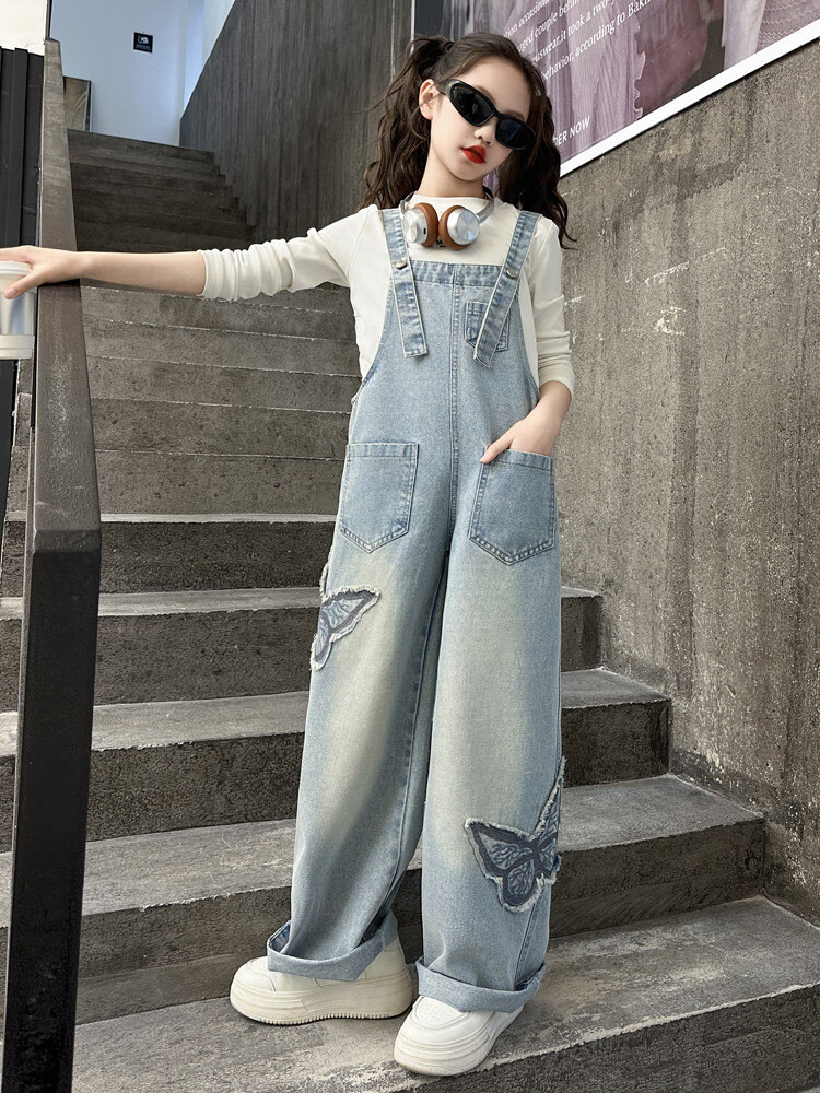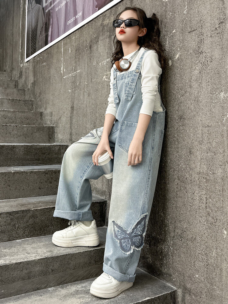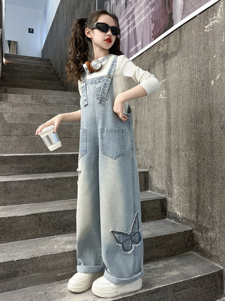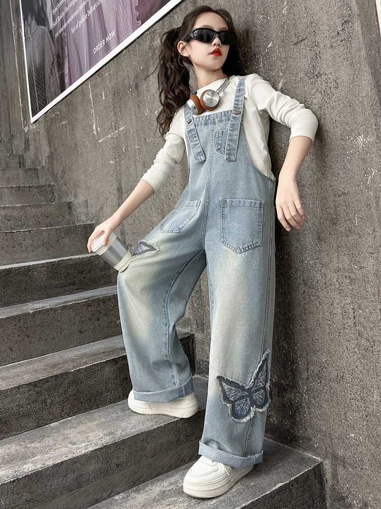 Disney (Disney) Girls Spring Pants 2025 New Style Wide Leg Pants Girls Straight Overalls Children's Clothing Spring Middle and Older Children Patch Butterfly Overalls 120 cm