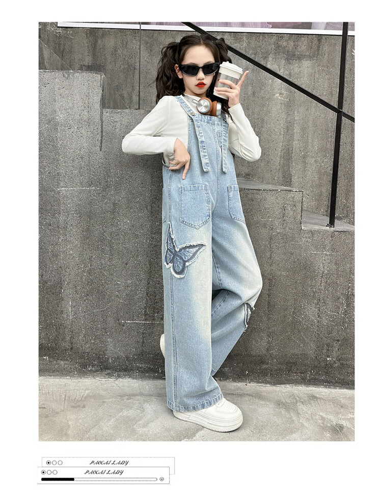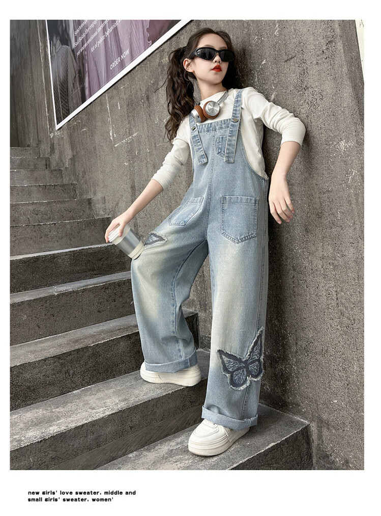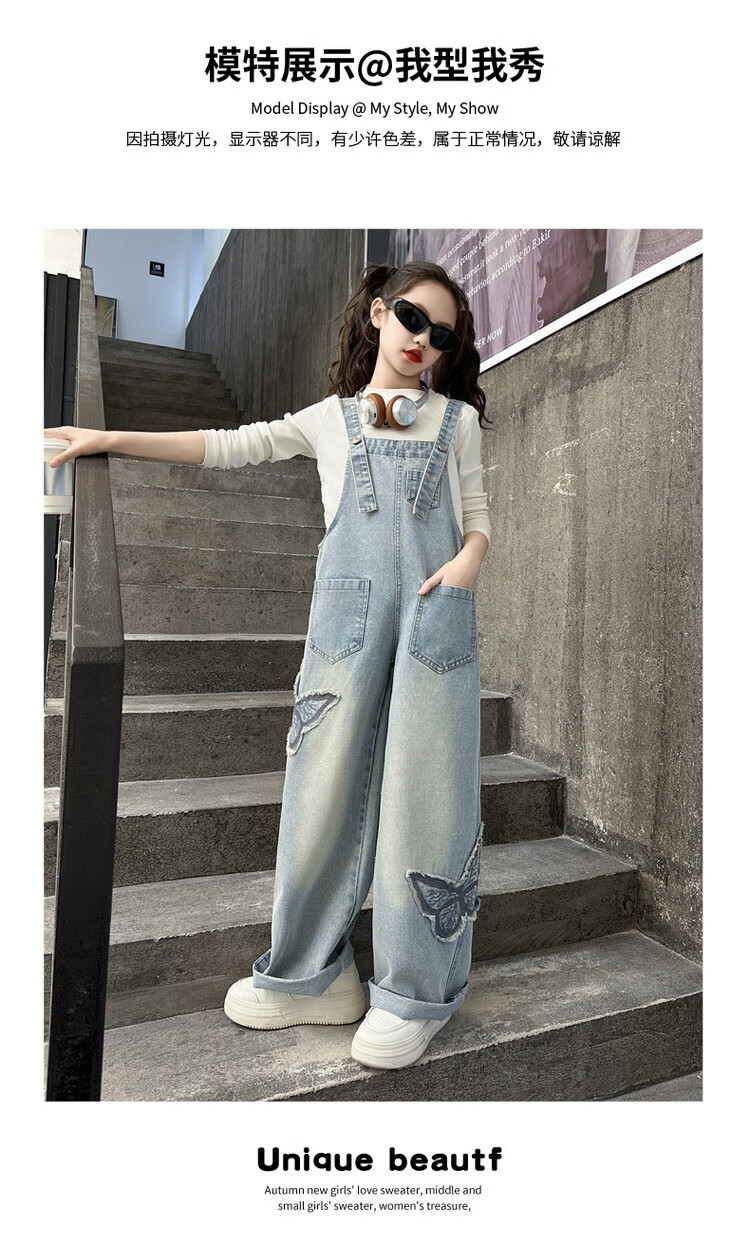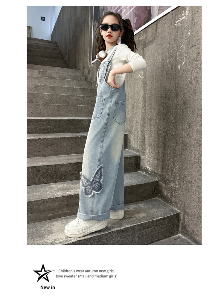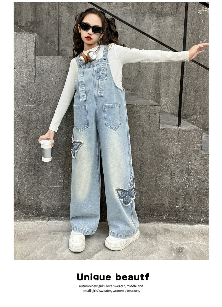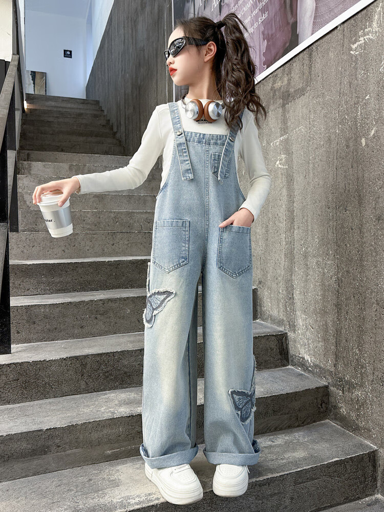 Disney (Disney) Girls Spring Pants 2025 New Style Wide Leg Pants Girls Straight Overalls Children's Clothing Spring Middle and Older Children Patch Butterfly Overalls 120 cm
