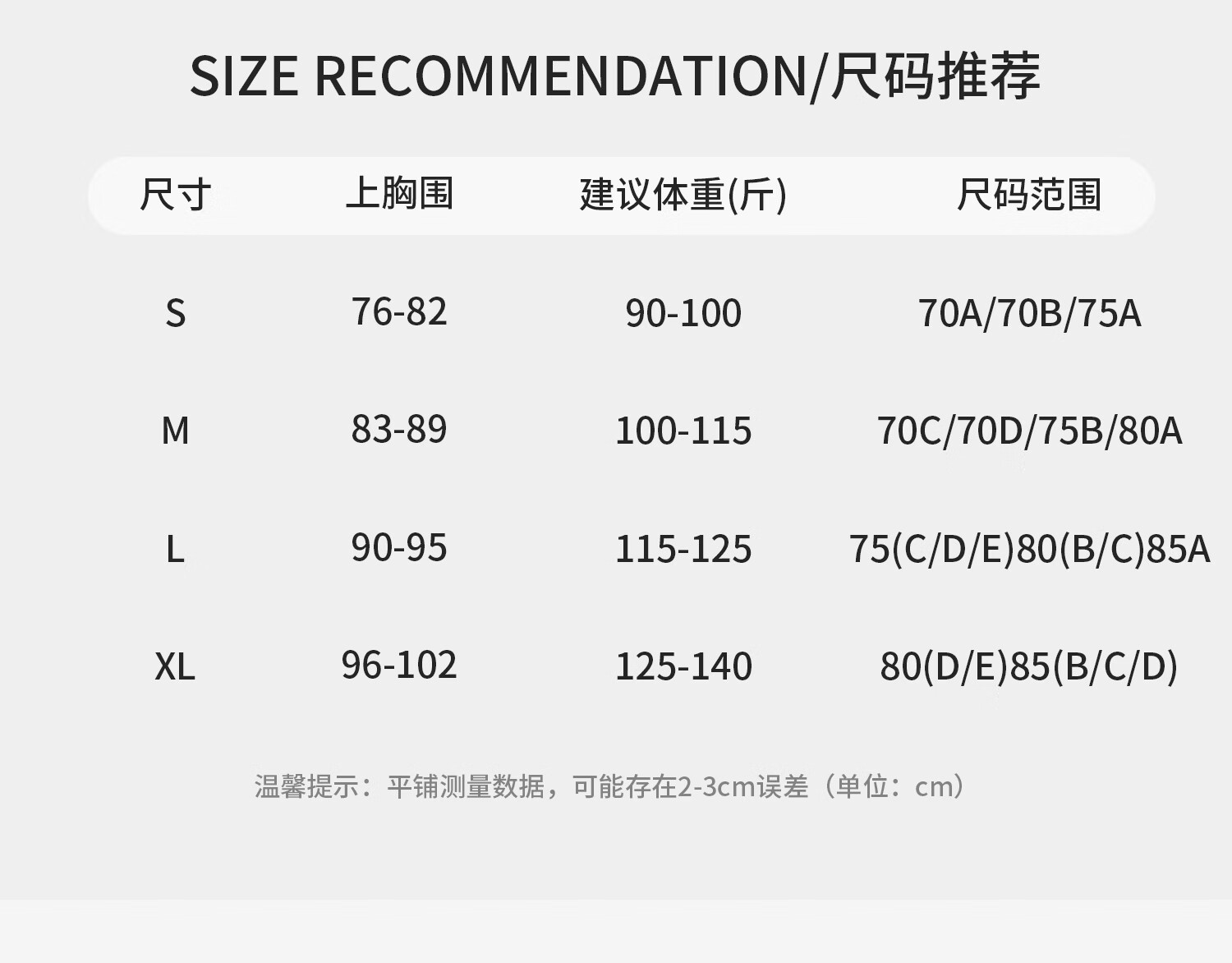 China (cm) 160-165/84-86 165-170 / 88-90 167-172 / 92-96 168-173 / 98-102 170-176 / 106-110