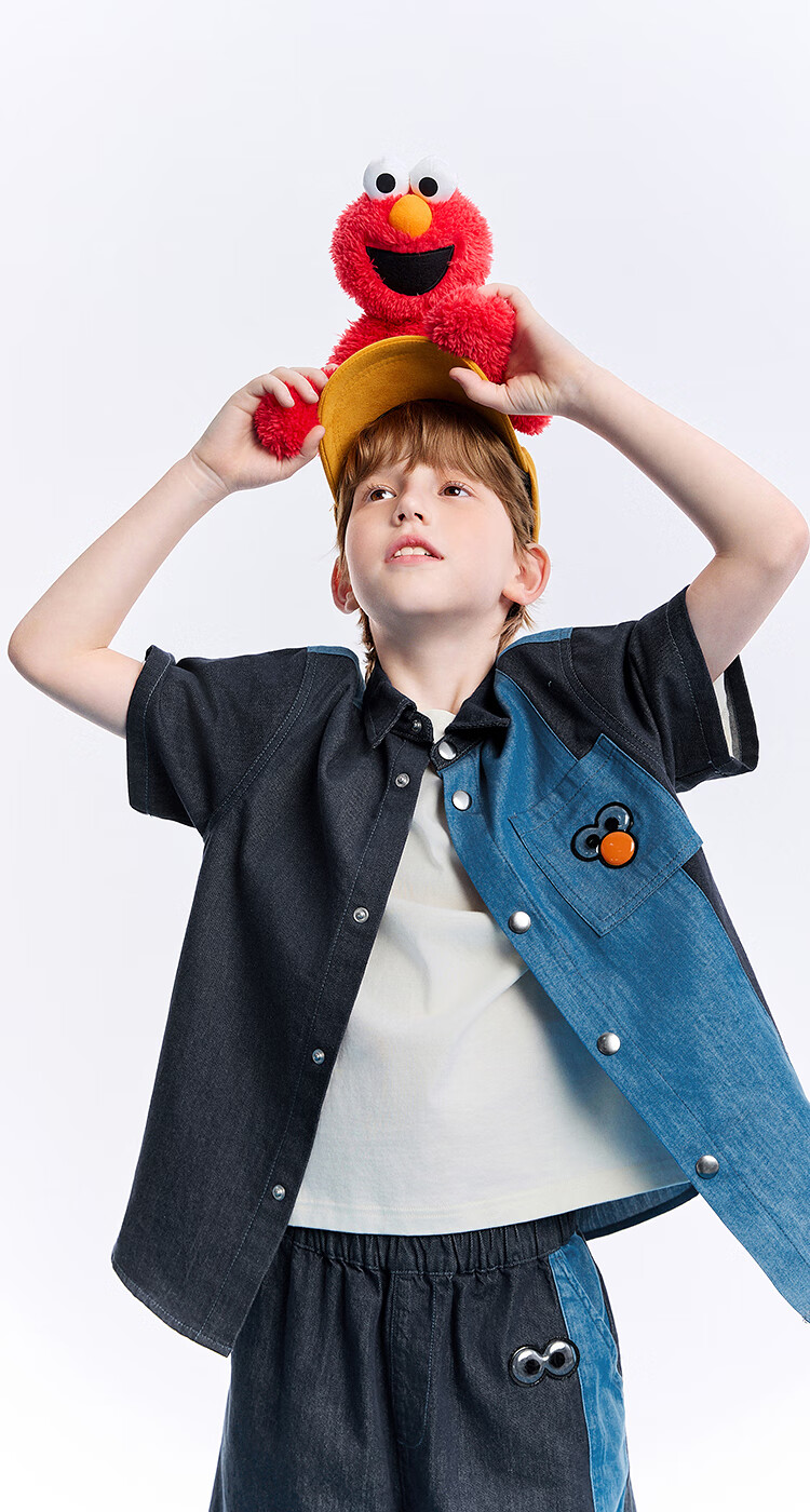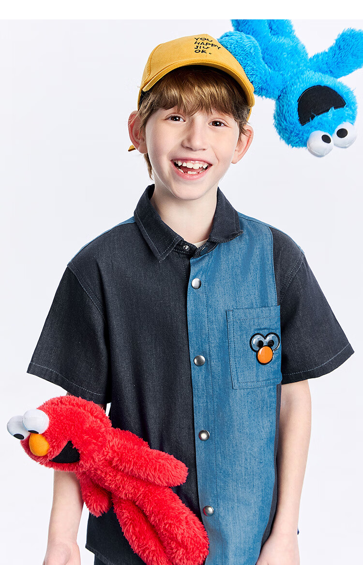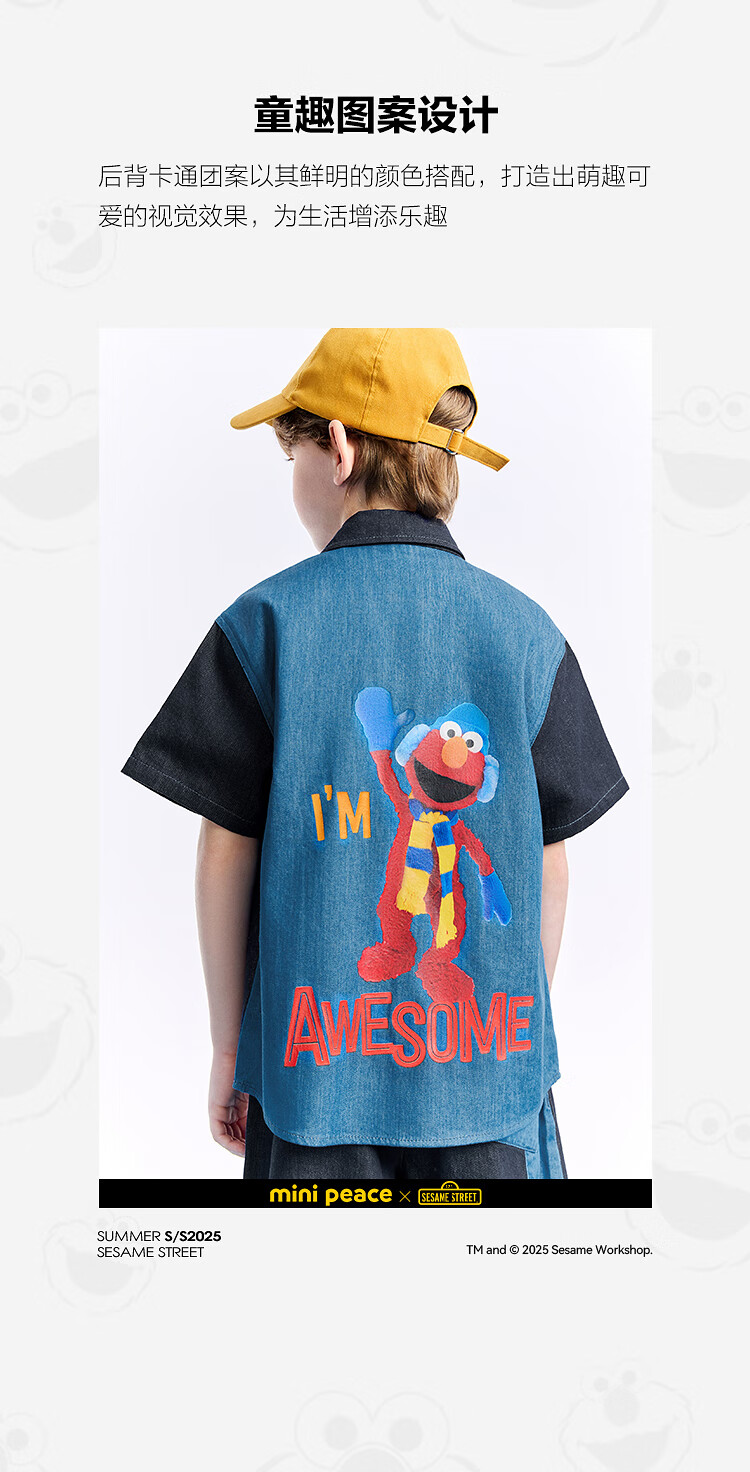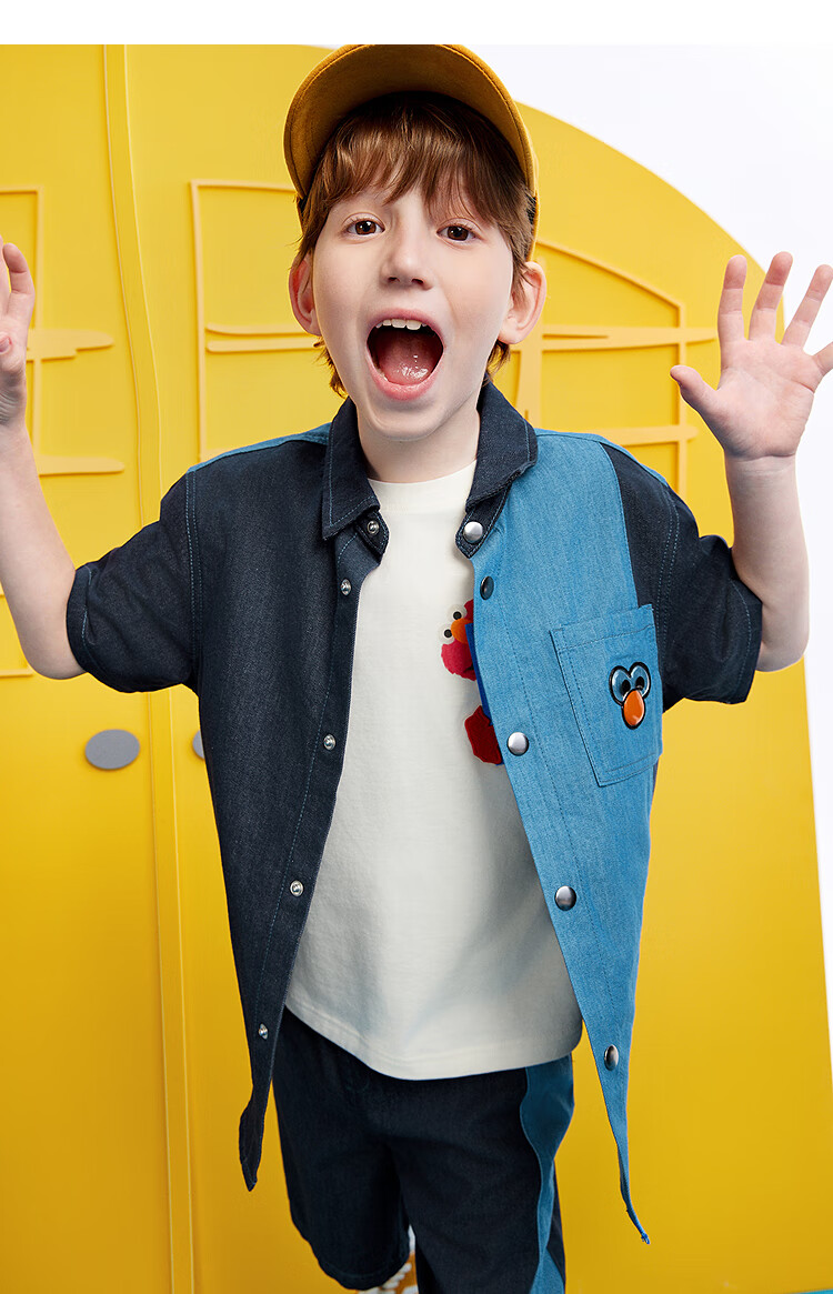 MiniPeace Sesame Street co-branded Peacebird children's clothing boys' comfortable denim shirt jacket short-sleeved summer dress denim dark blue 140