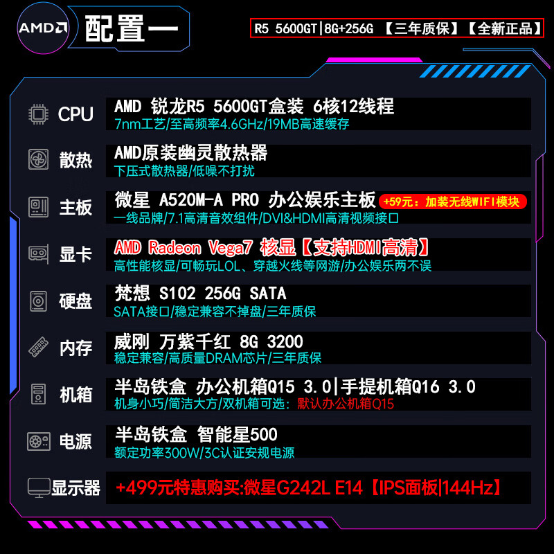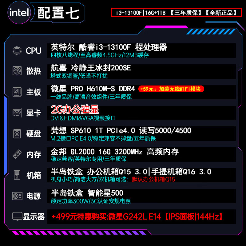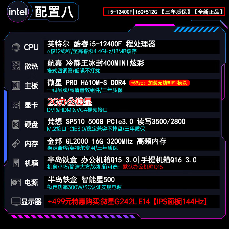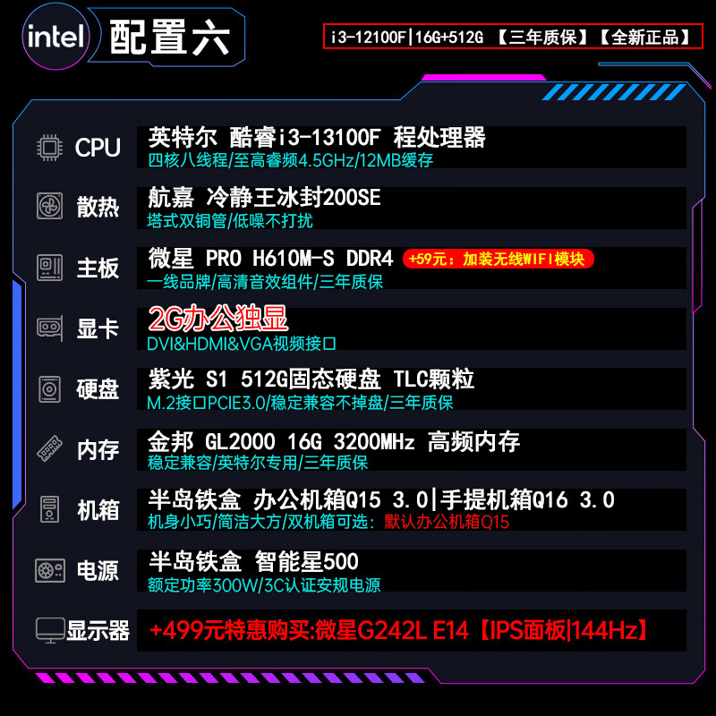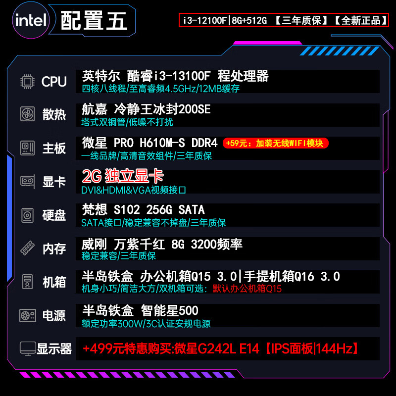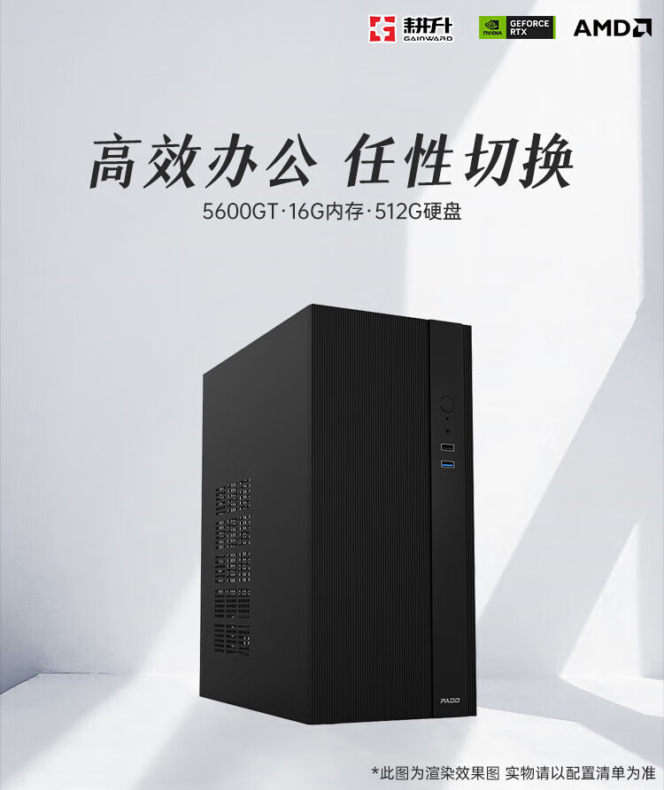 GAINWARD Intel Core i3 13100f/i5 12400/225 boxed assembly desktop office computer 5600gt commercial amd host online class LOL game home desktop computer configuration three boxed 5600GT丨16G+512G