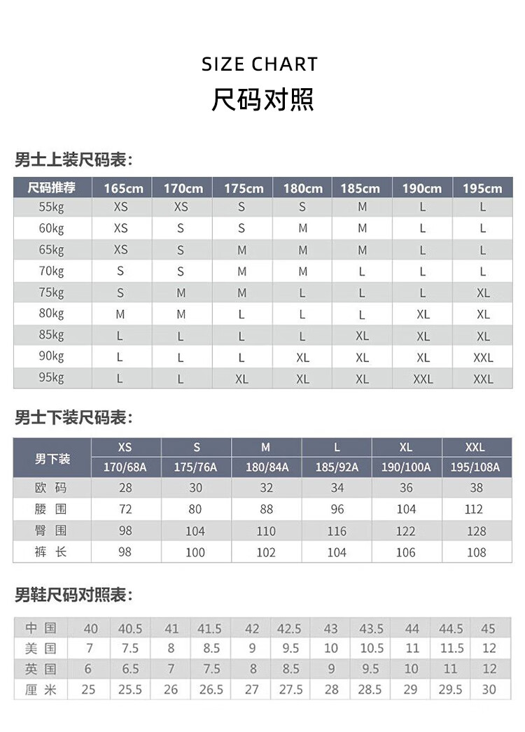 China (cm) 165 / 88-90 170 / 96-98 175 / 108-110 180 / 118-122 185 / 126-130