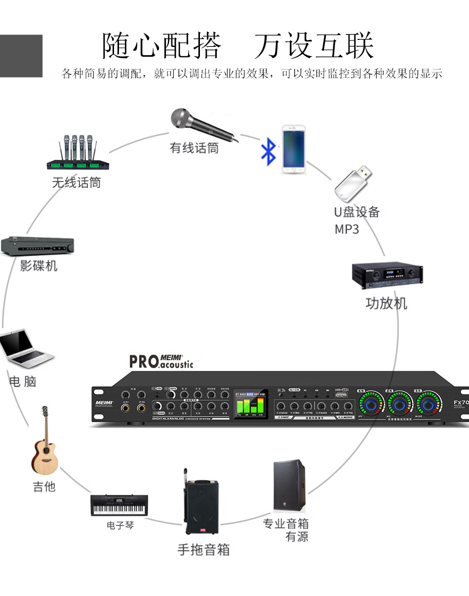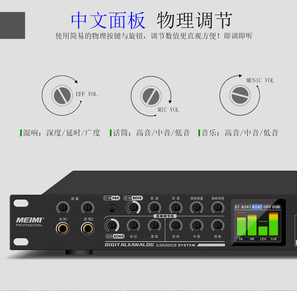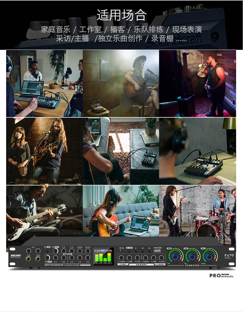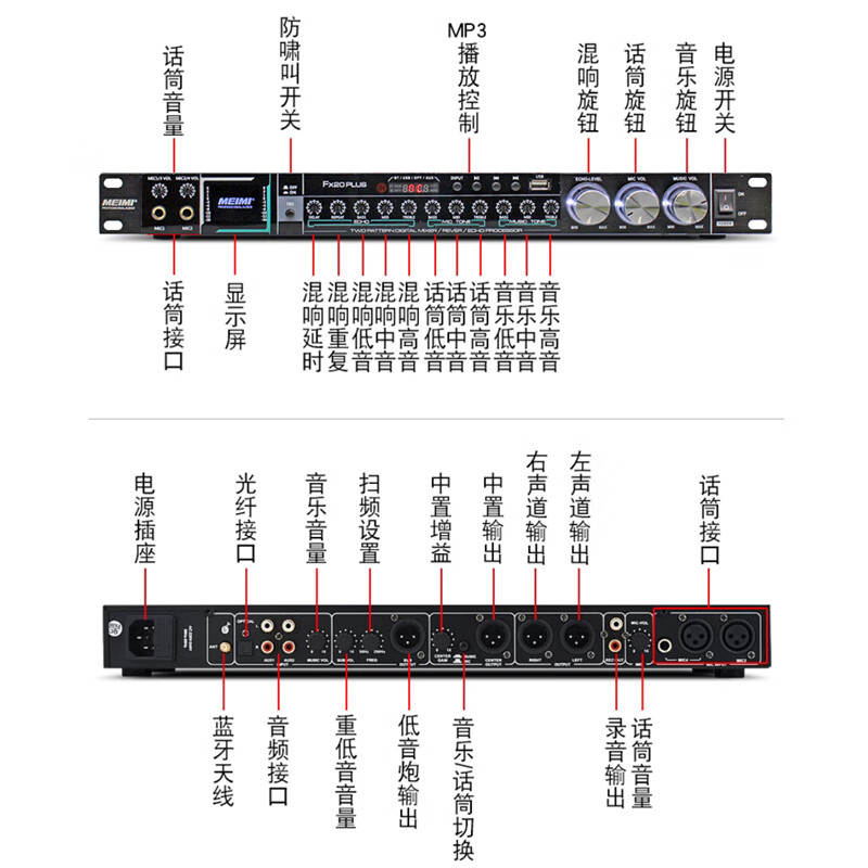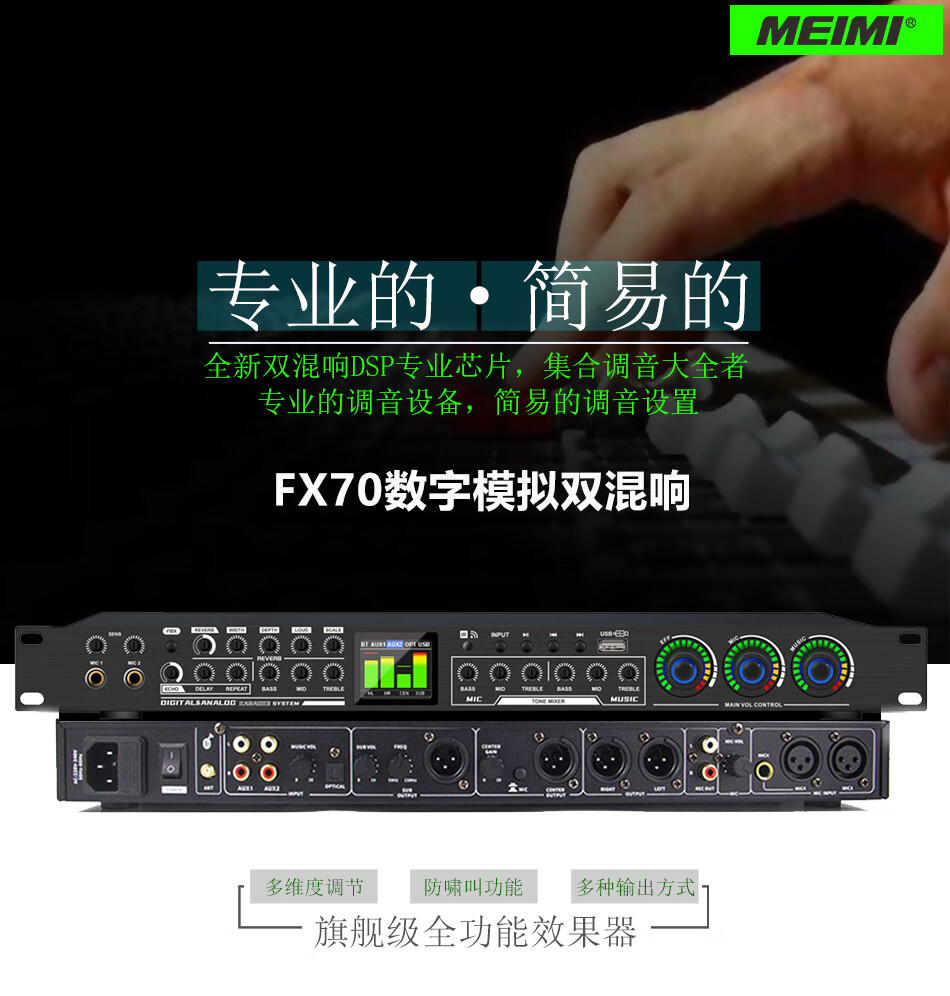 MEIMI FX70 pre-amp effector professional stage home KTV conference microphone anti-howling reverberation audio processor ktv stage Bluetooth player sound card decoder FX20 black color screen level-standard power cord remote control