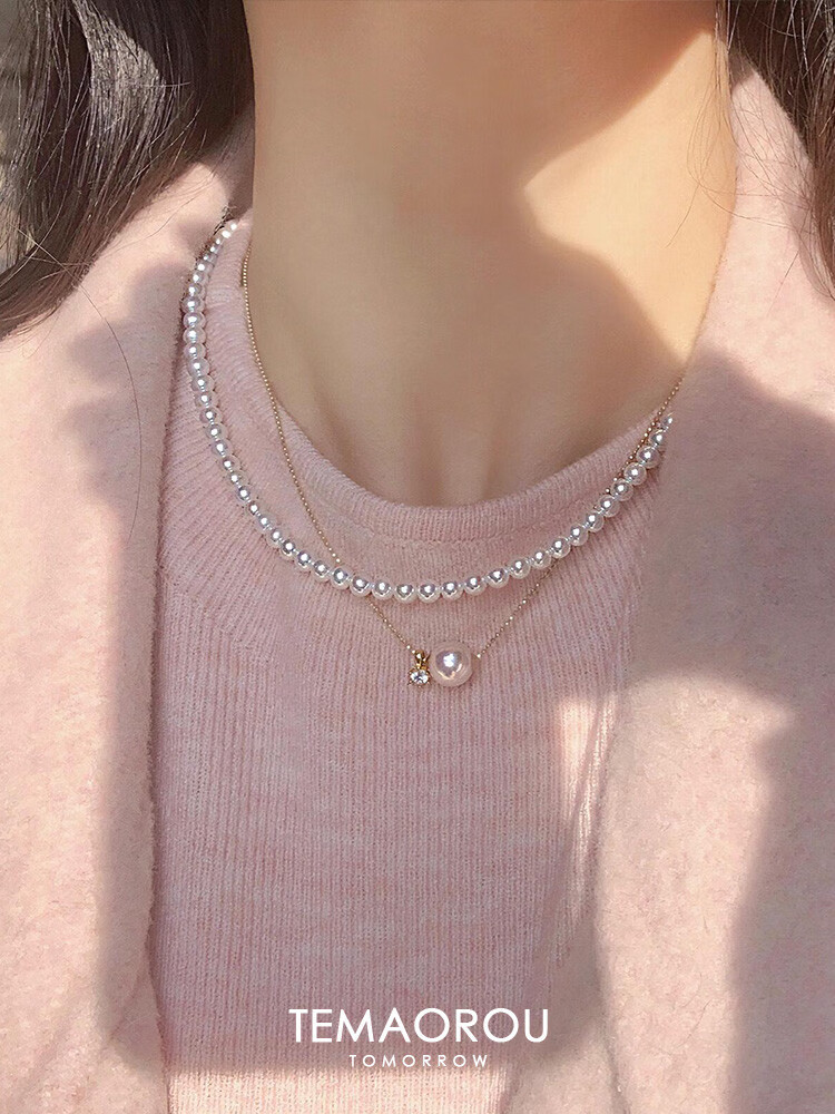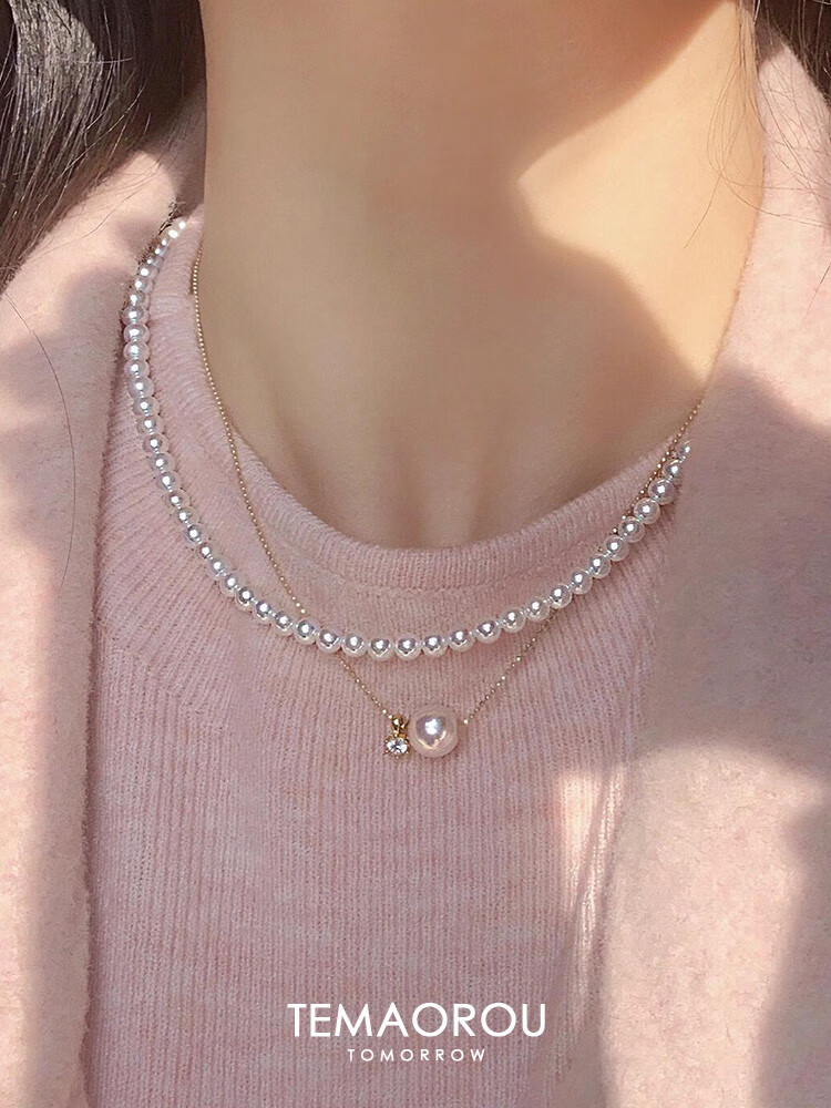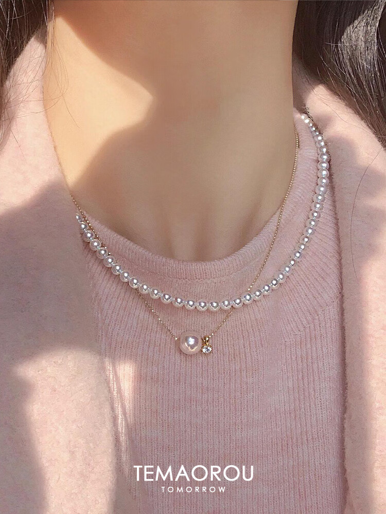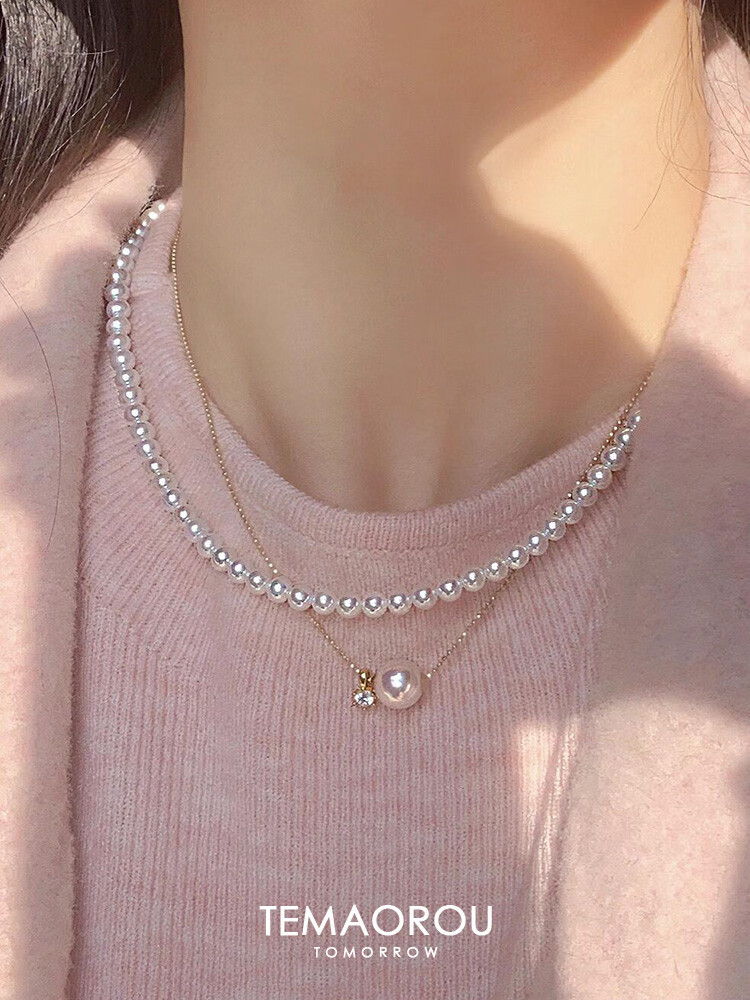 Pop Spring Stacked Pearl Pendant Necklace Women's Light Luxury Niche High-Class Clavicle Chain Light Luxury Niche Accessory Necklace A Pearl Necklace Clavicle Chain Pearl Diameter Approximately 4m