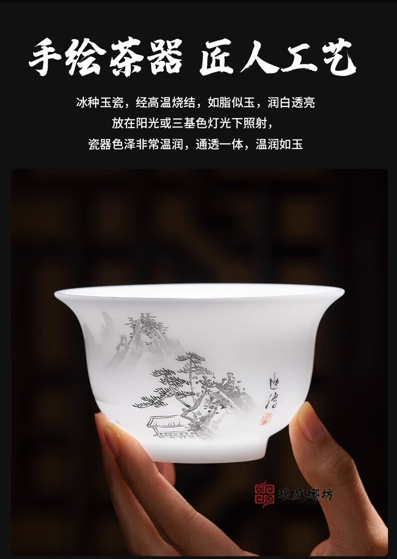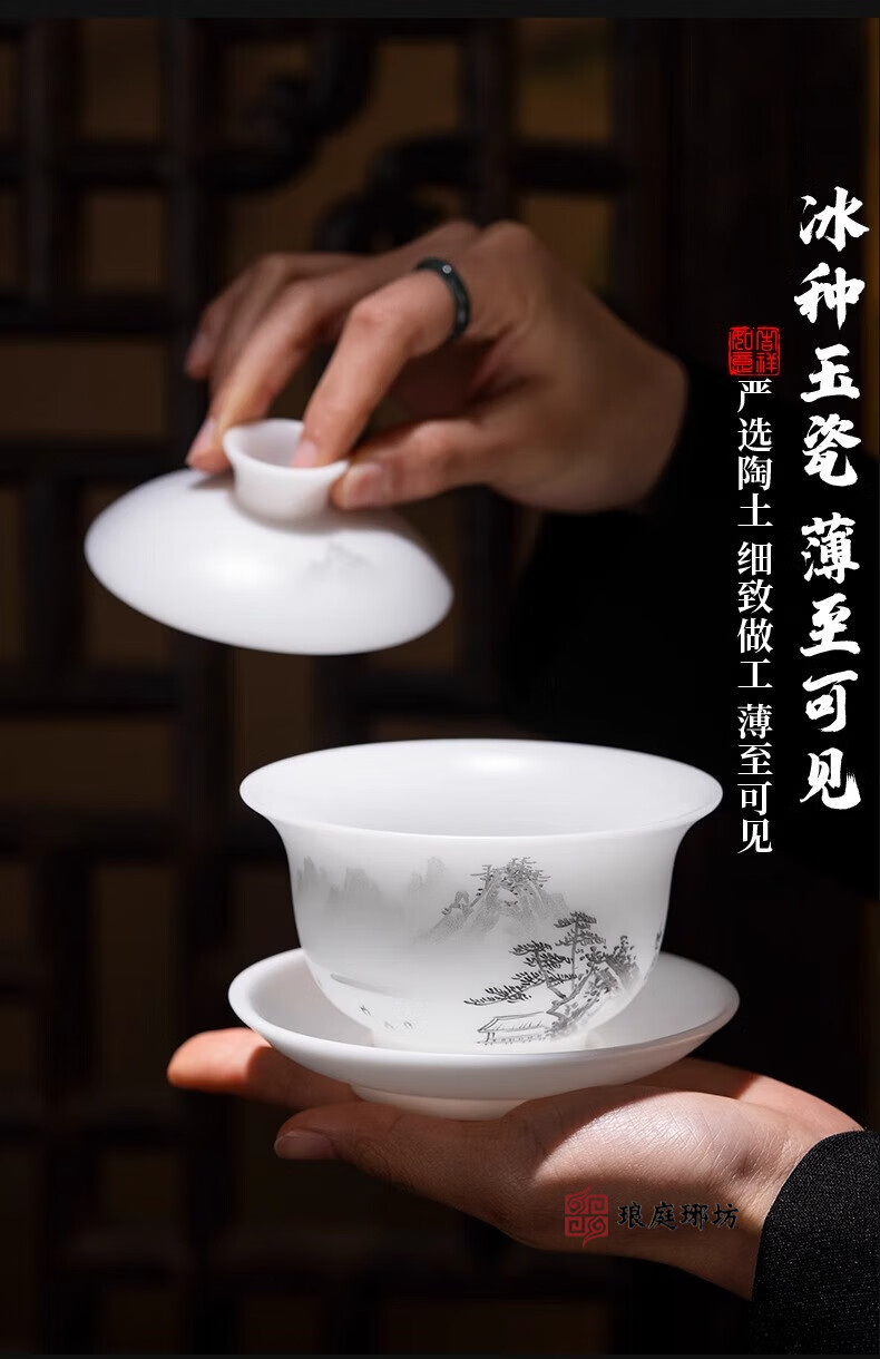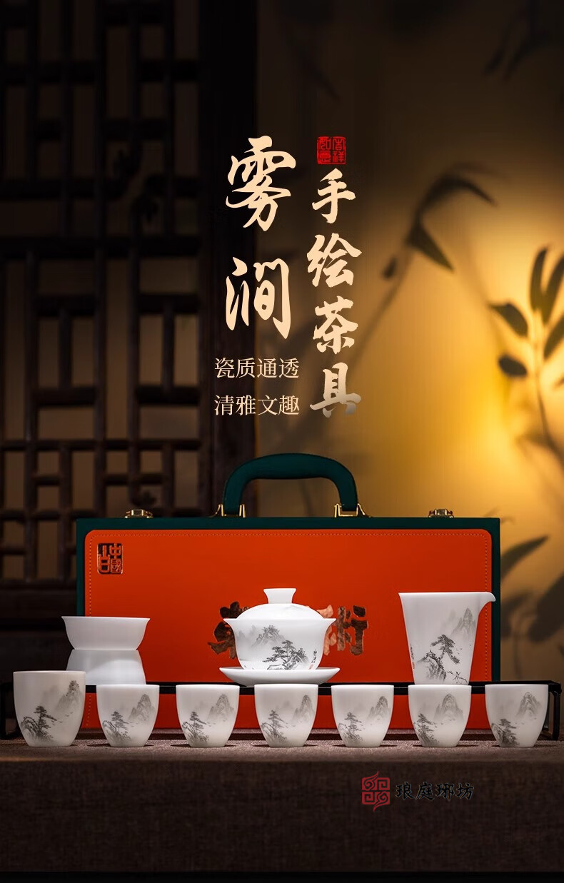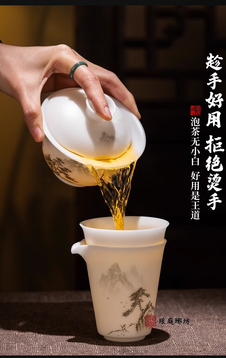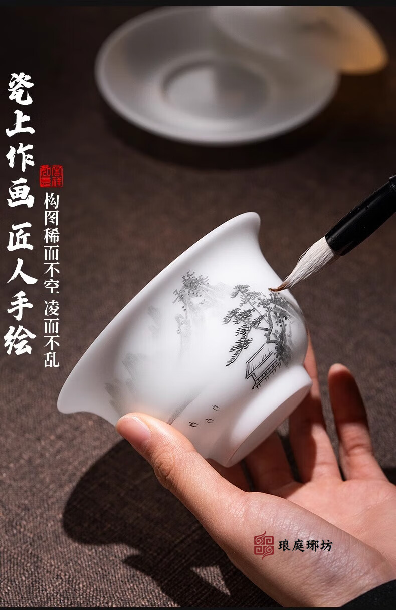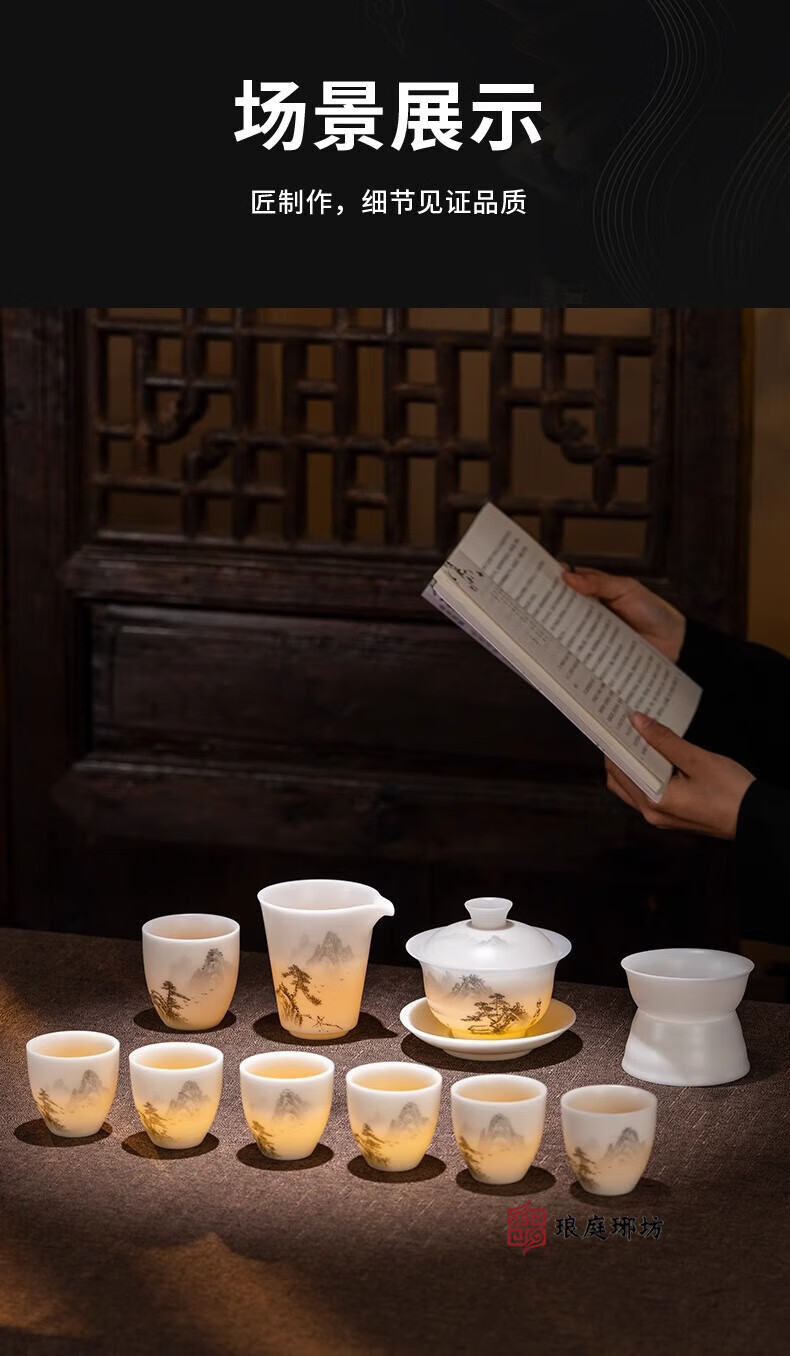 Langting Yafang ice seed mutton fat jade Kung Fu tea set pure hand-painted household cover bowl light luxury ceramic high-end tea cup high-end Wujian hand-painted tea set 1 piece