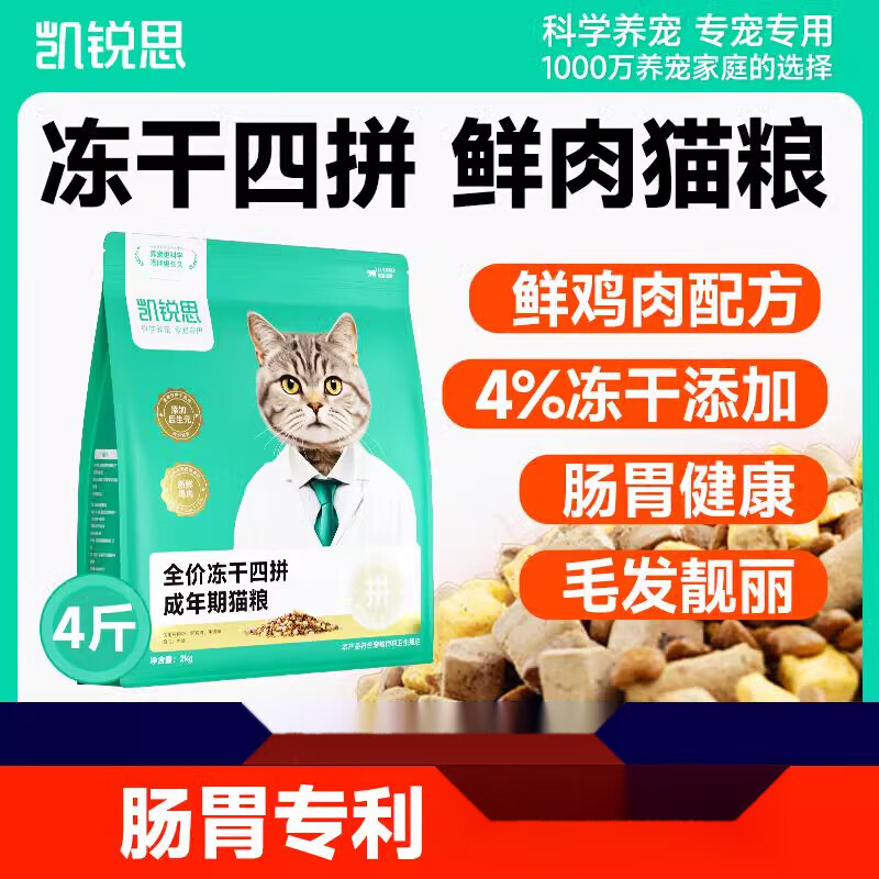 Kai Rui Si cat food fresh meat freeze-dried adult cats and kittens care for the gastrointestinal fattening and gill growth cat staple food Kai Rui Si freeze-dried four-piece cat food 4Jin Jin is equal to 0.5 kg 2kg
