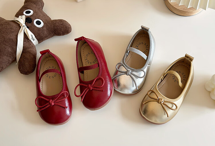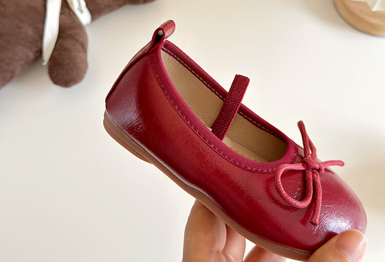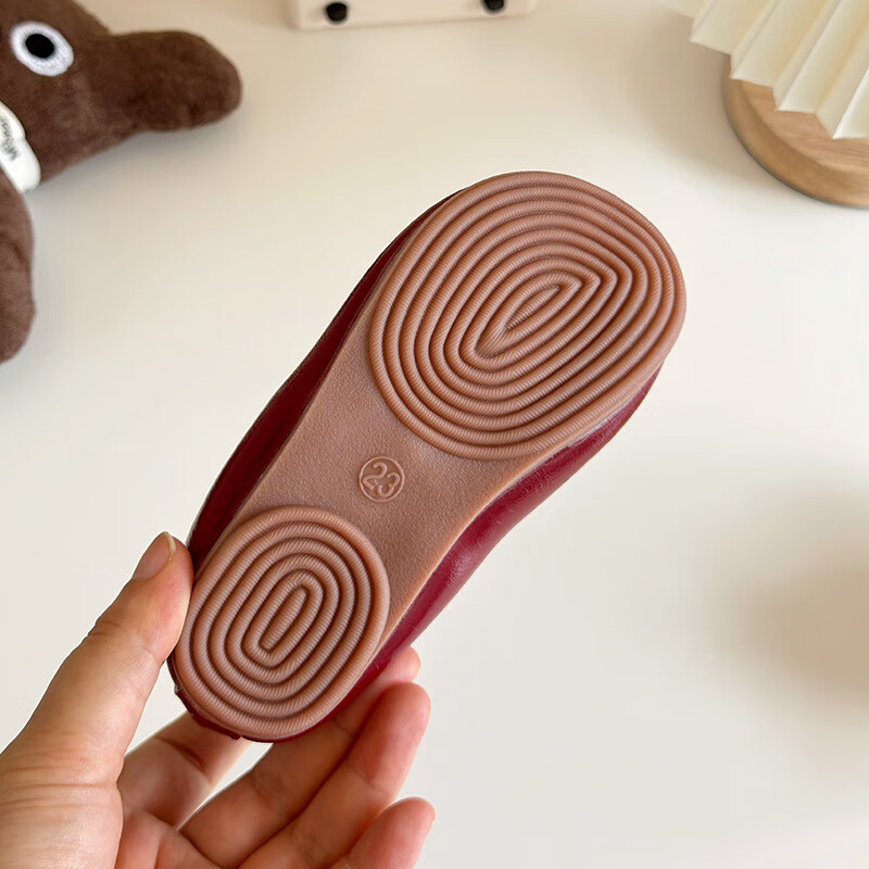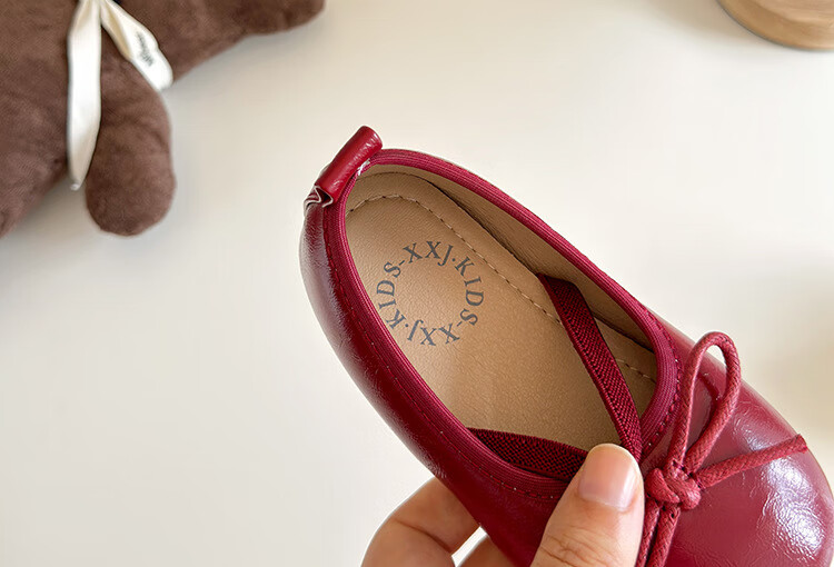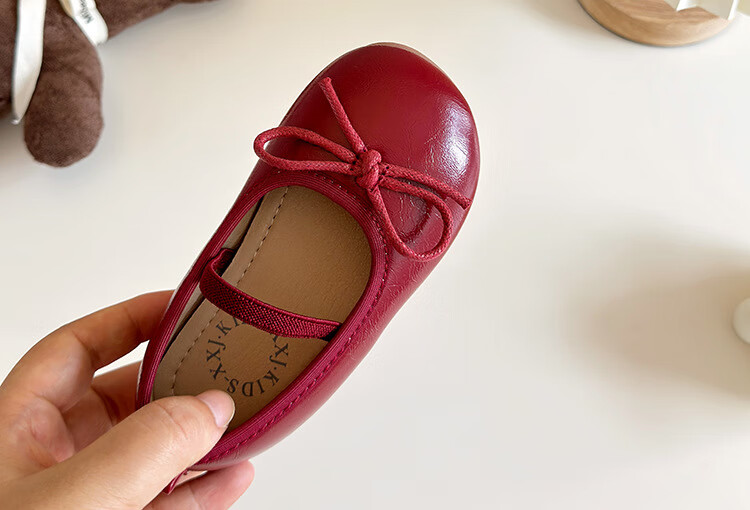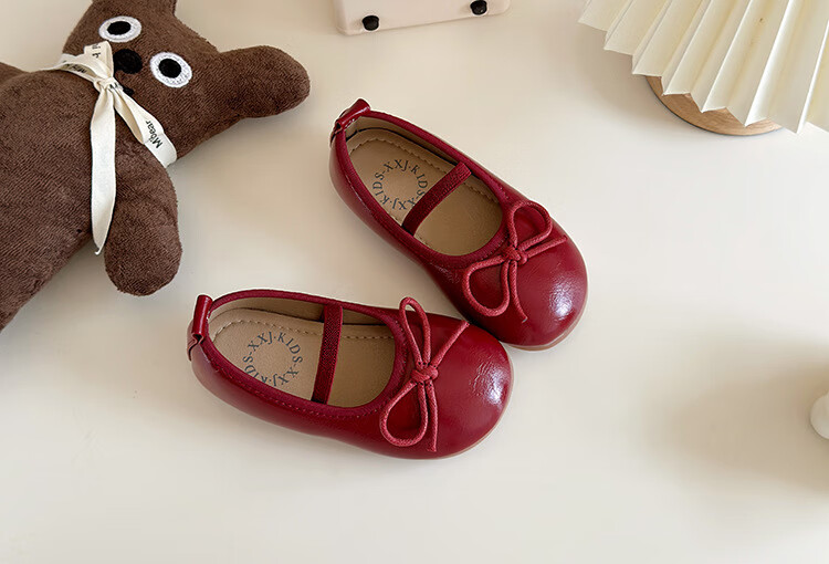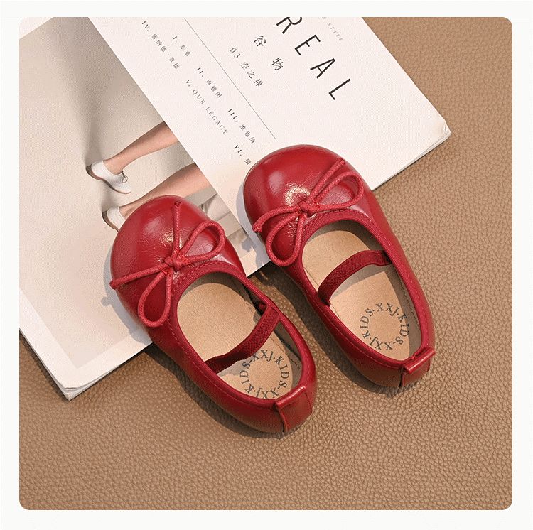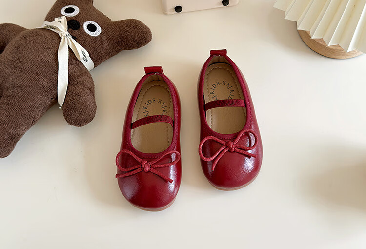 Ershanji 2025 Spring and Summer New Girls' Leather Shoes with Bow Knot Children's Shoes Little Girls Princess Shoes Soft Sole Peas Shoes Shallow Mouth Single Shoes Bow Knot Leather Shoes Wine Red Size 32 Inner Length 19.2cm