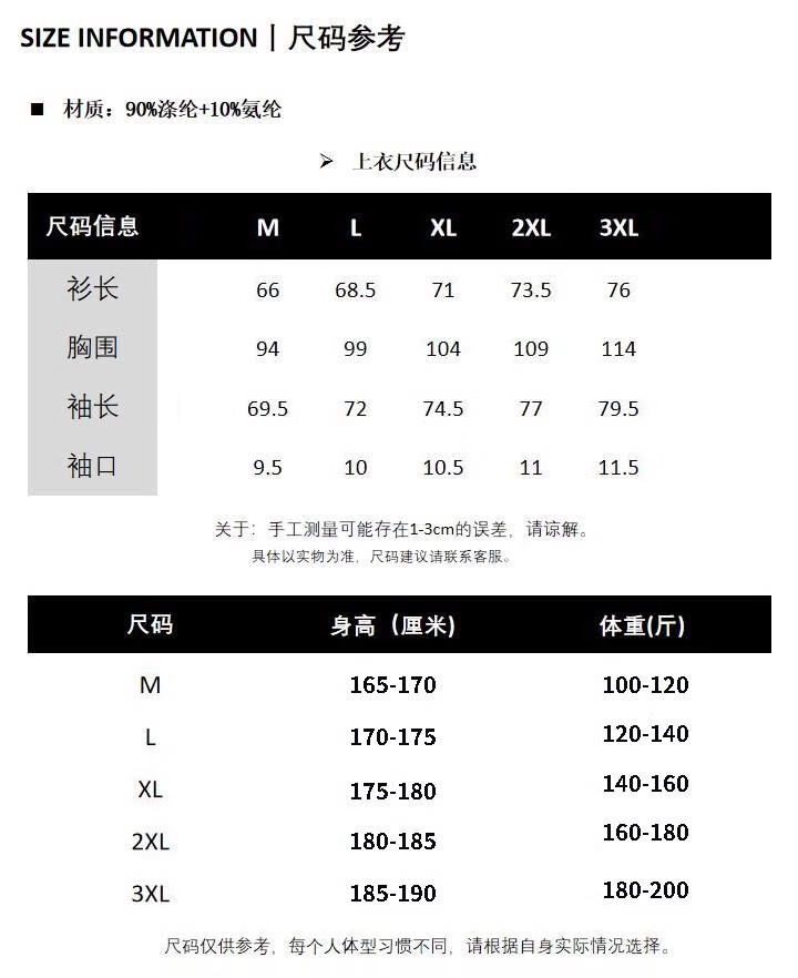 China (cm) 165 / 88-90 170 / 96-98 175 / 108-110 180 / 118-122 185 / 126-130