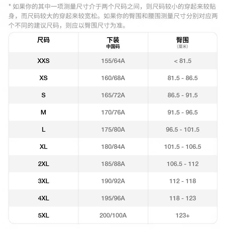 China (cm) 160-165/84-86 165-170 / 88-90 167-172 / 92-96 168-173 / 98-102 170-176 / 106-110