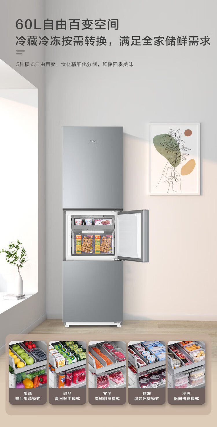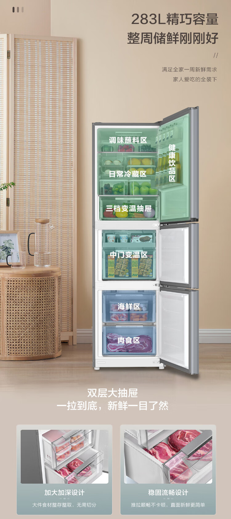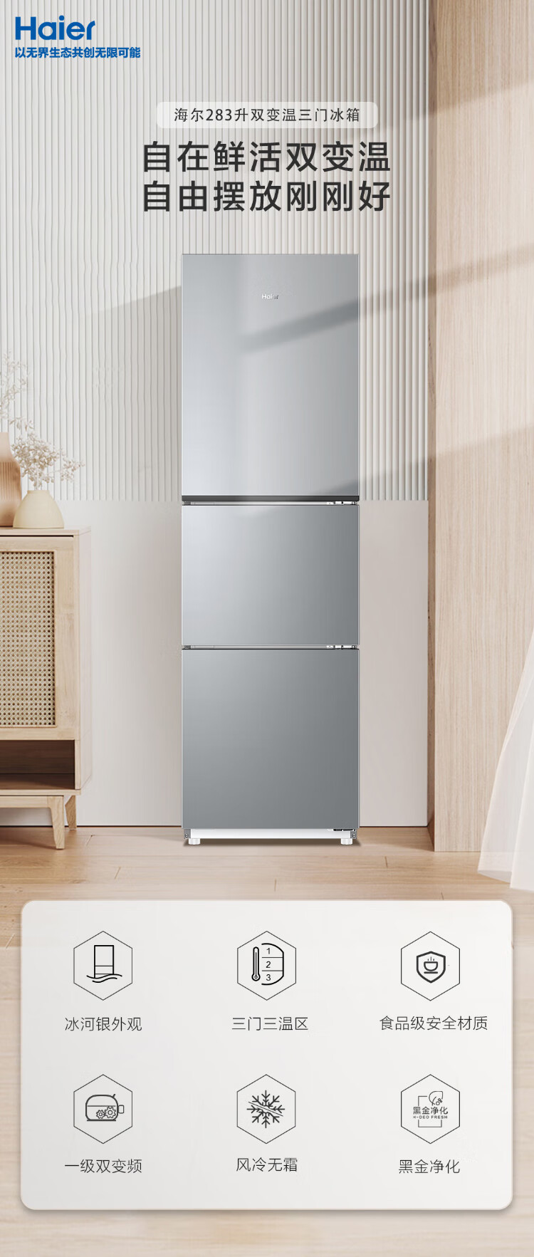 Haier three-door refrigerator, air-cooled, frost-free 283, upgraded to one level, dual-variable, energy-saving, minus-30 degrees deep-freezing, quick-freezing, household small-sized, high-looking refrigerator, small, adjustable left and right doors + food-grade safety materials + energy-saving, level 1 energy efficiency