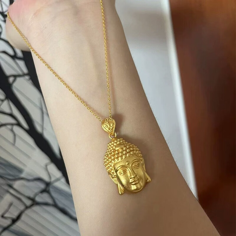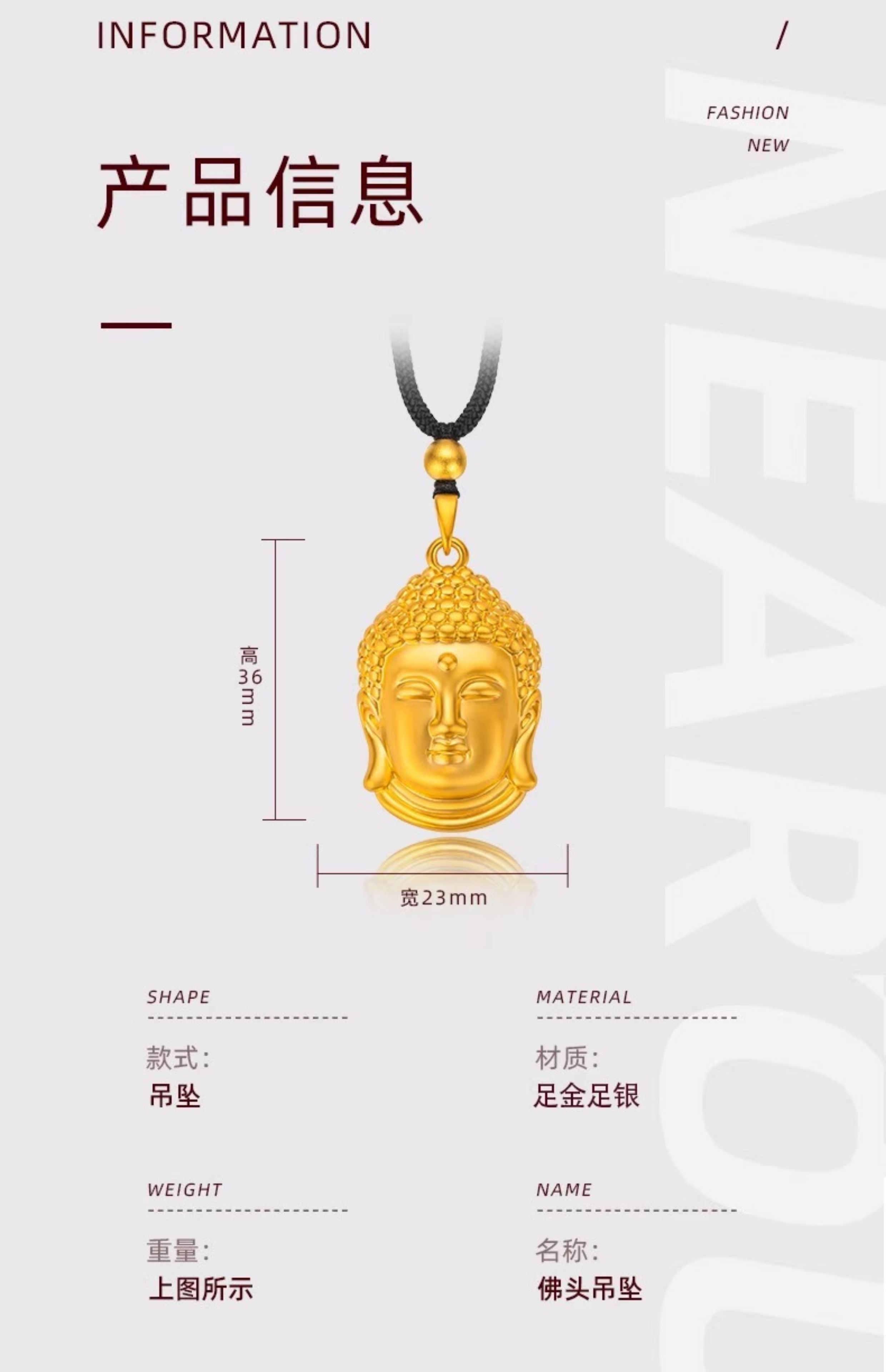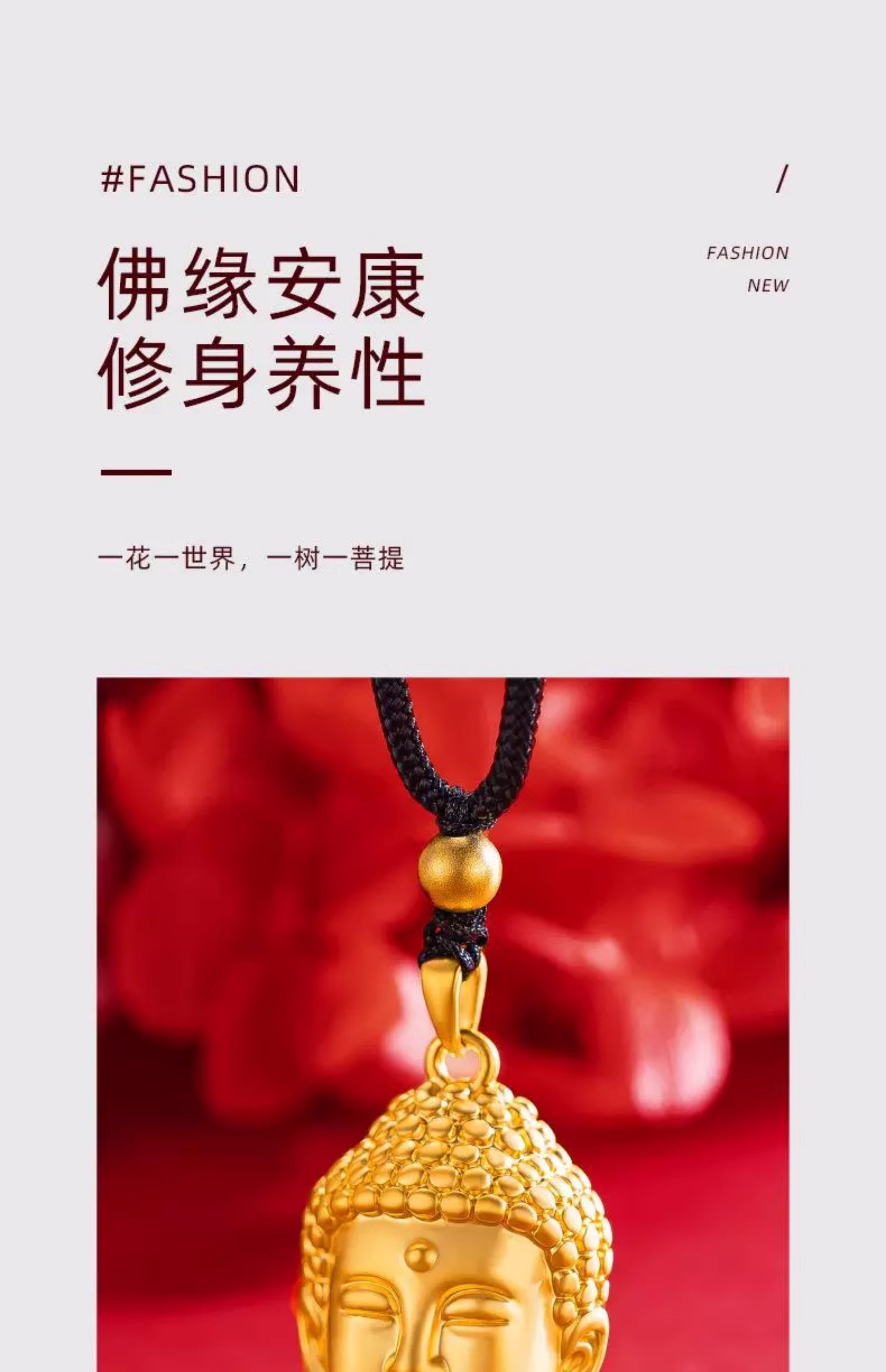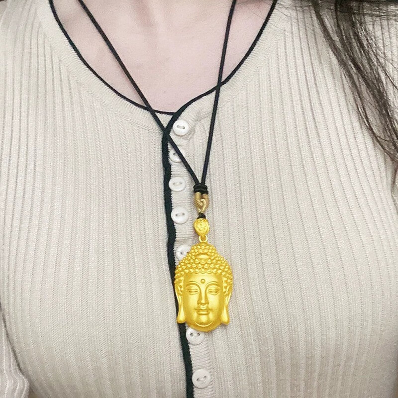 Popu's new Buddha head pendant gold-plated silver pendant 18K gold solid simulation natal Buddha head necklace for men and women Buddha head pendant + gold beads black rope