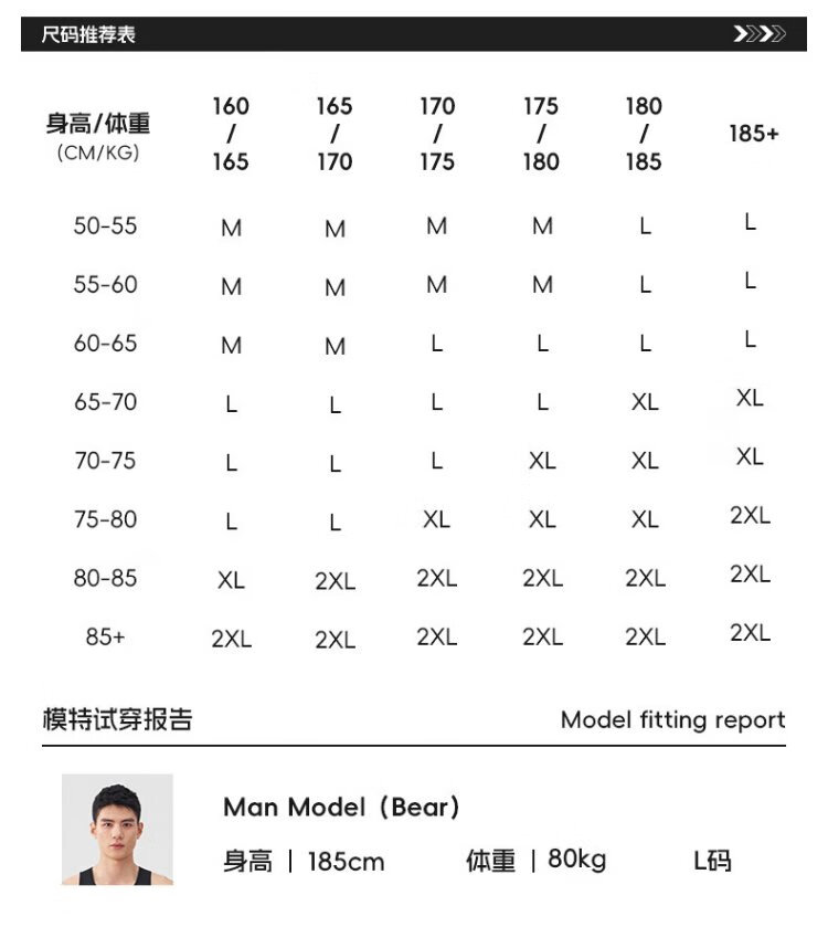 China (cm) 165 / 88-90 170 / 96-98 175 / 108-110 180 / 118-122 185 / 126-130