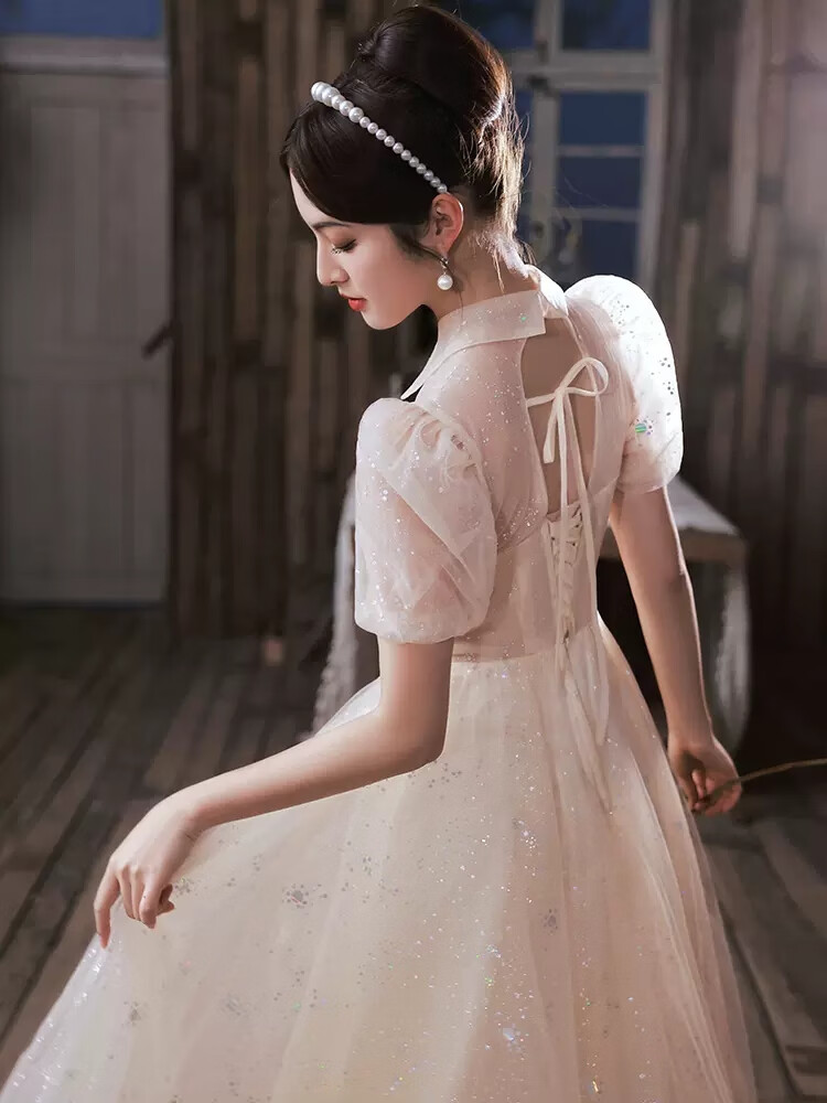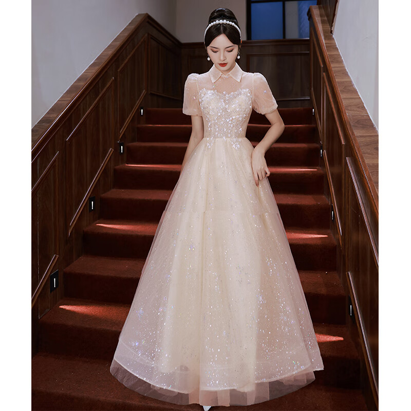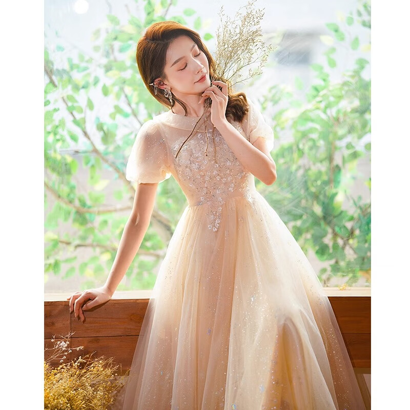 Zhufan music student art exam dress piano performance fairy evening girl vocal banquet adult ceremony dignified and elegant middle school student champagne color long sleeves long zipper style 2XL