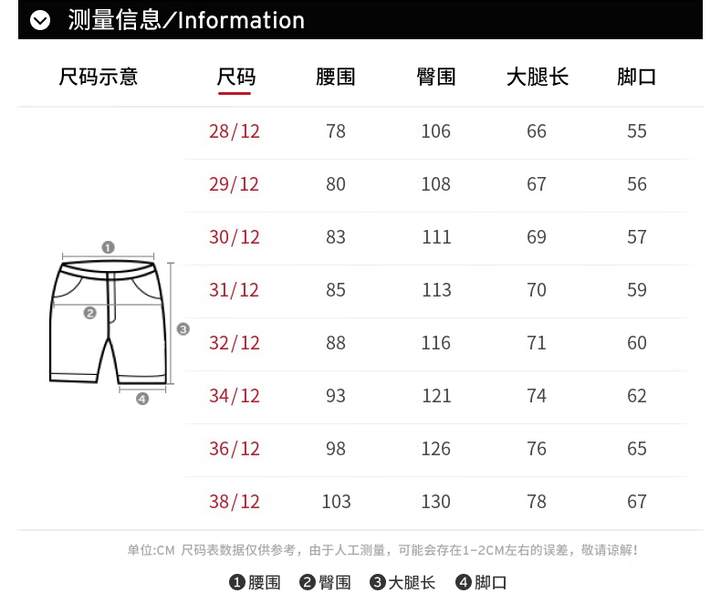 USA(inch) 28-30 30-32 32-34 34-38 38-42