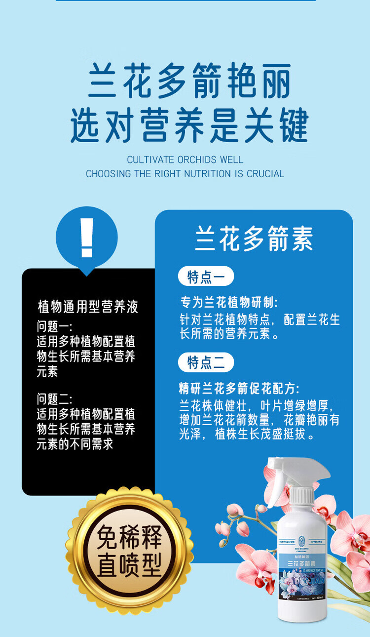 Special fertilizer for orchids, butterfly orchids and flower arrowroots. Multi-sword bursting buds and multi-arrow orchid spirit king nutrient solution. Orchid arrowroots 300ML*3 bottles (1 nozzle)
