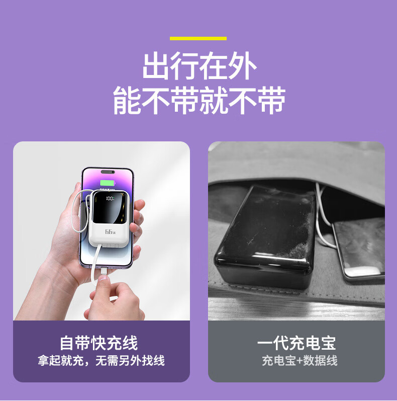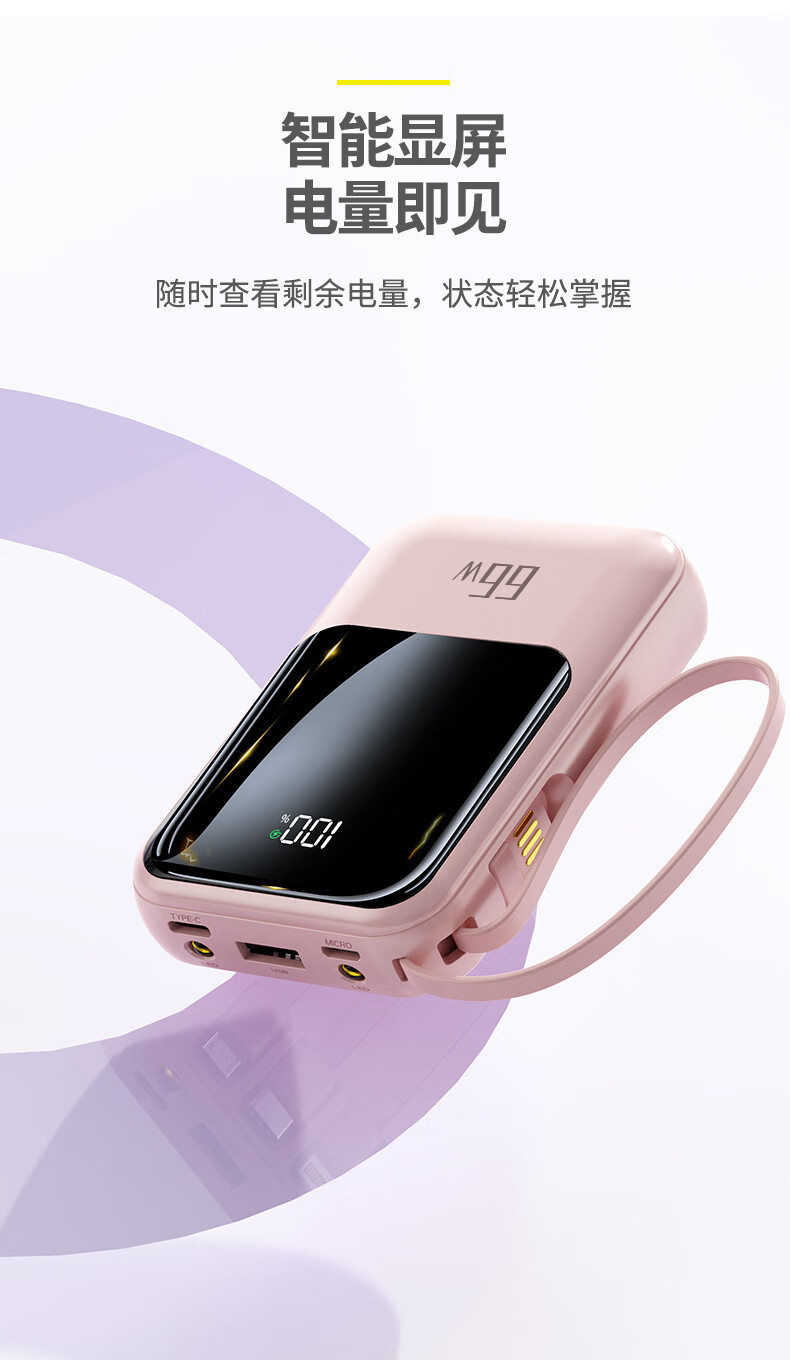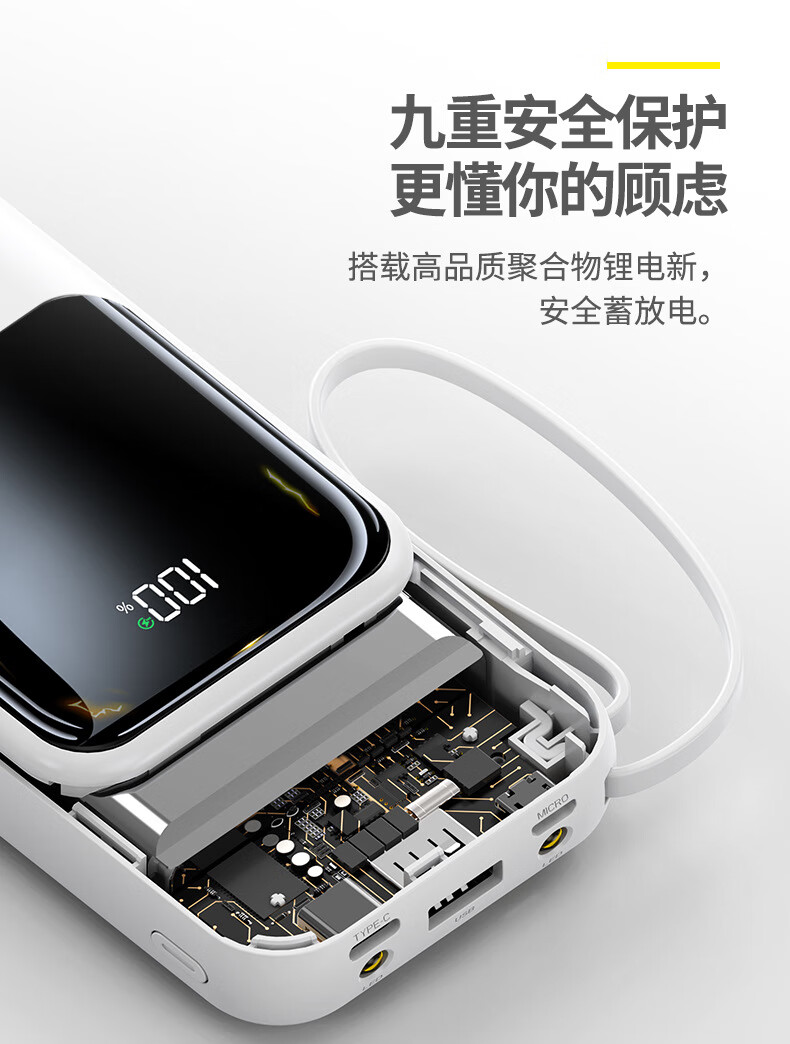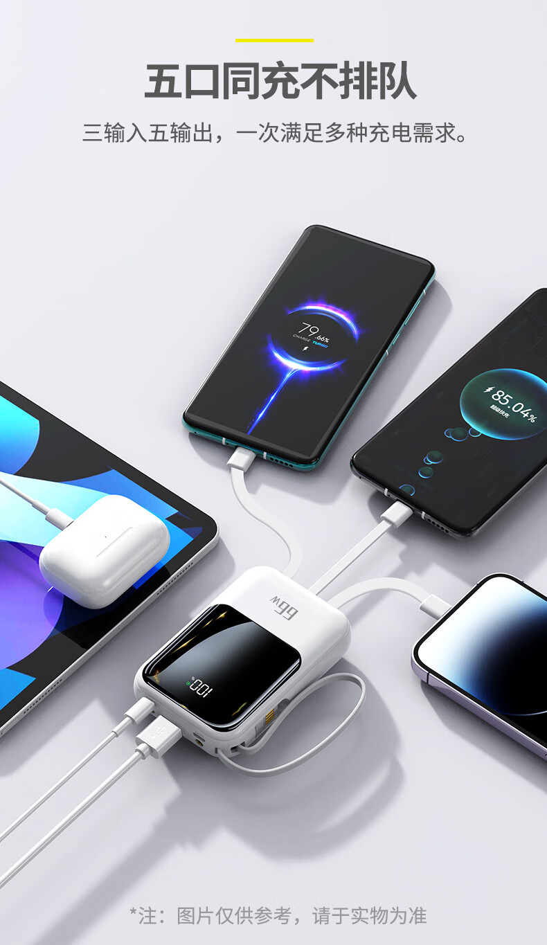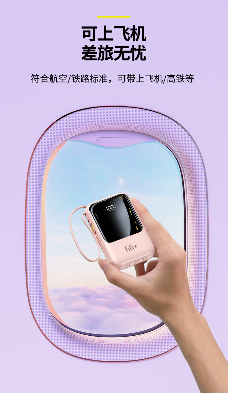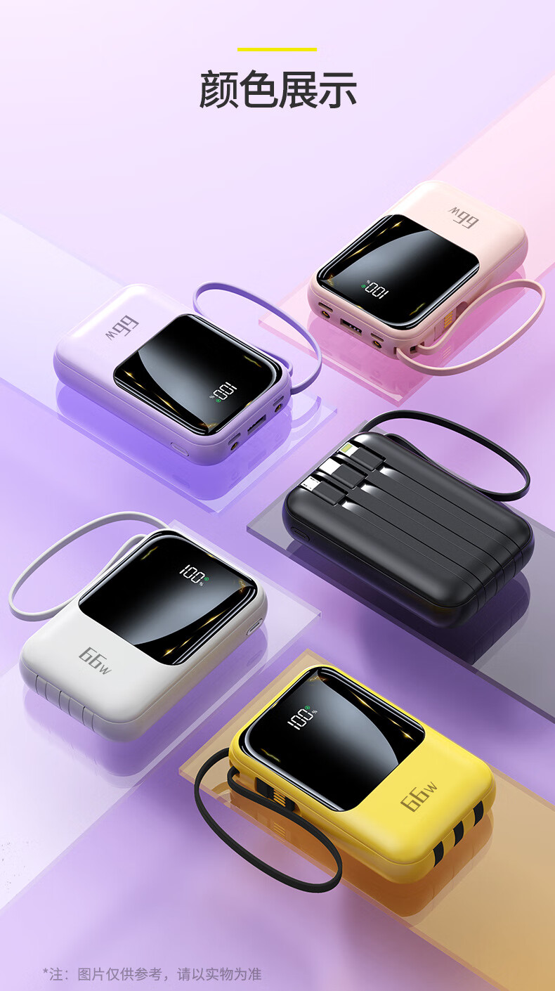 3C certified power bank 20000 mAh outdoor with built-in cable for super fast charging, suitable for Xiaomi and Huawei on airplanes. Upgraded version. Super fast charging 66w increased by 2999%. Real standard 20000 mAh. If you get a fake one, you will lose three.