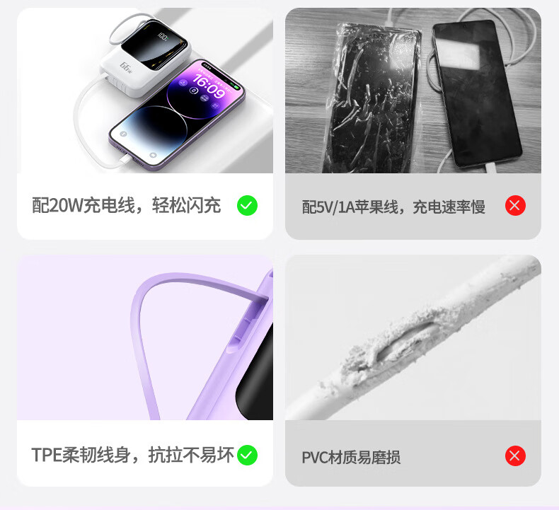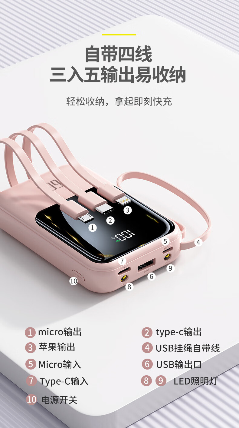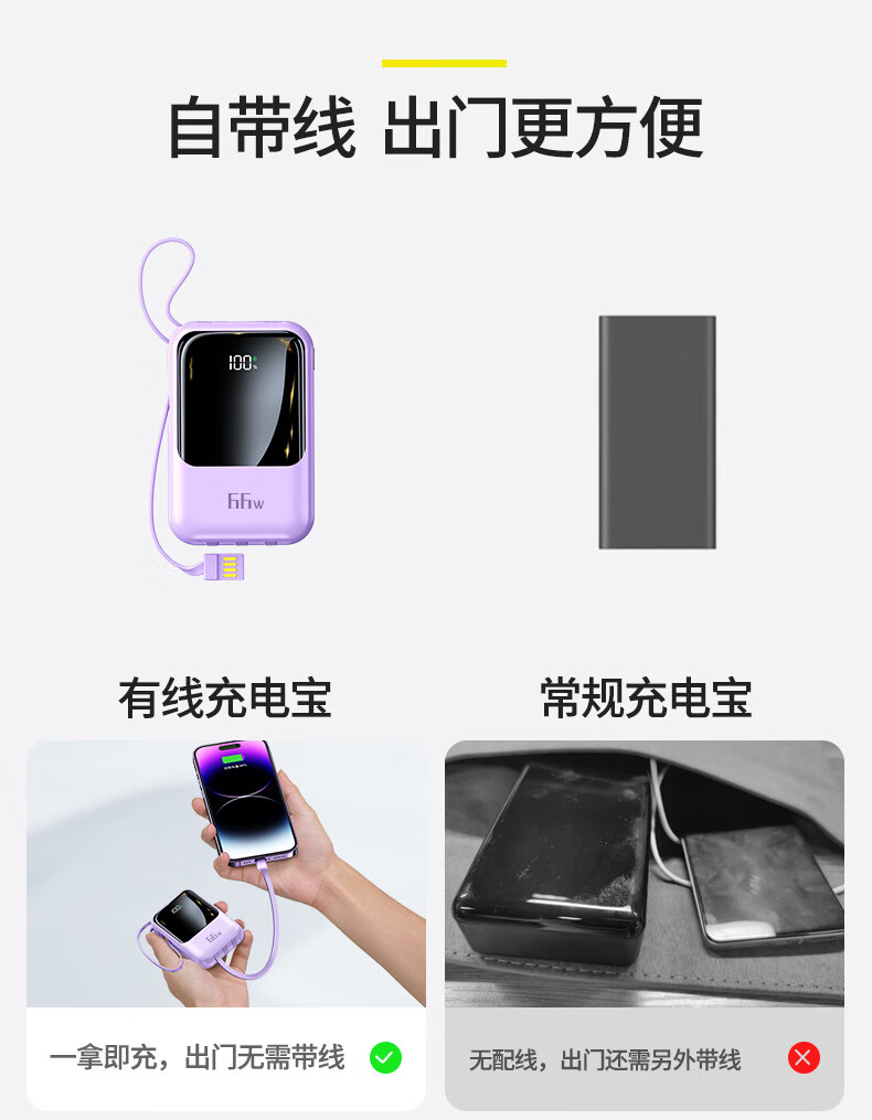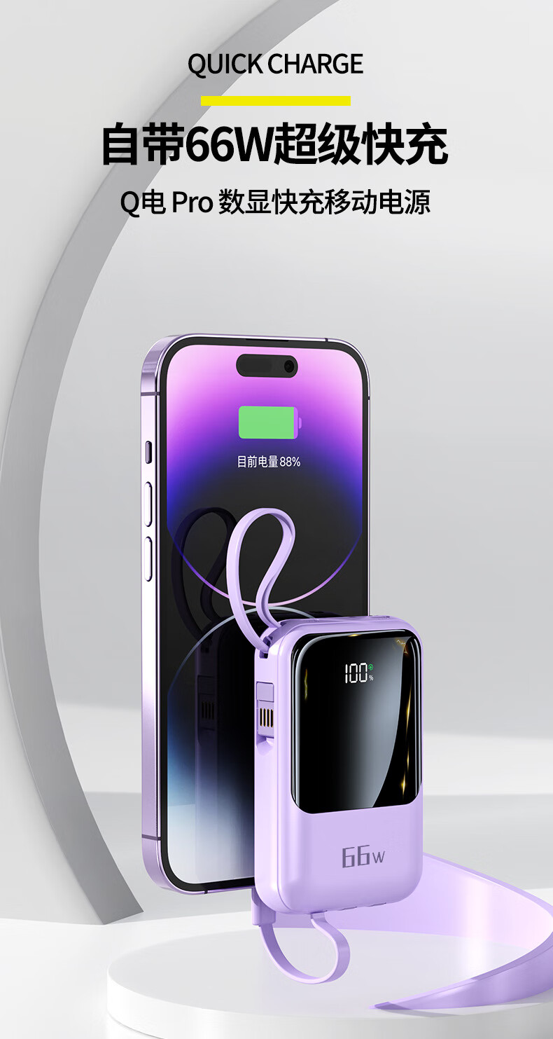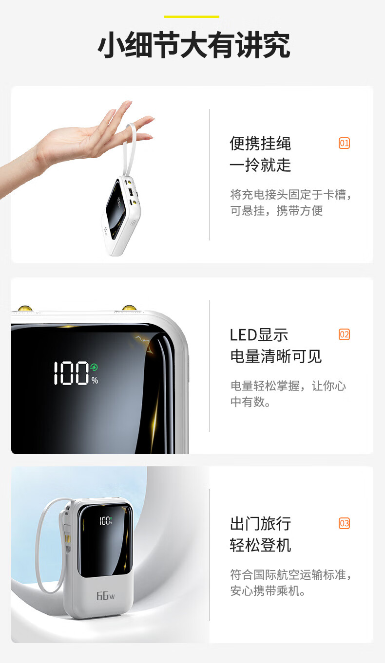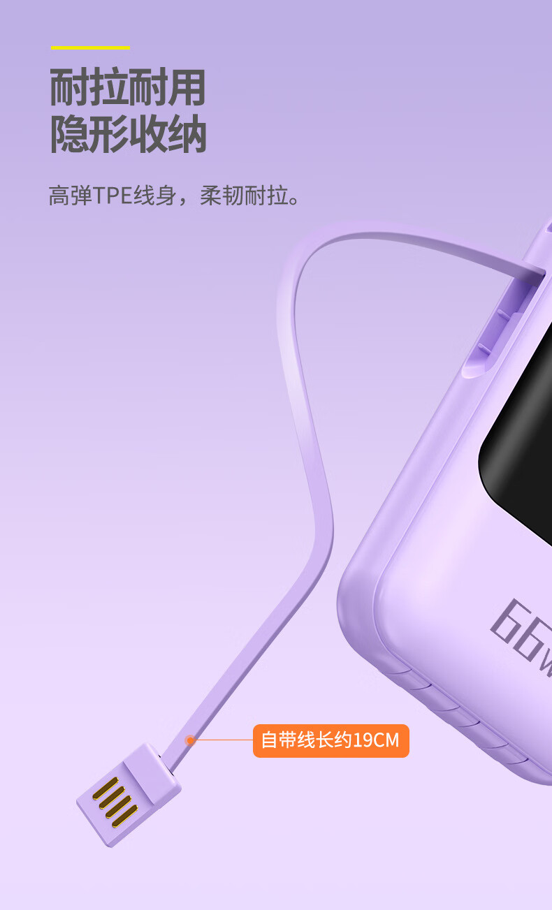 3C certified power bank 20000 mAh outdoor with built-in cable for super fast charging, suitable for Xiaomi and Huawei on airplanes. Upgraded version. Super fast charging 66w increased by 2999%. Real standard 20000 mAh. If you get a fake one, you will lose three.