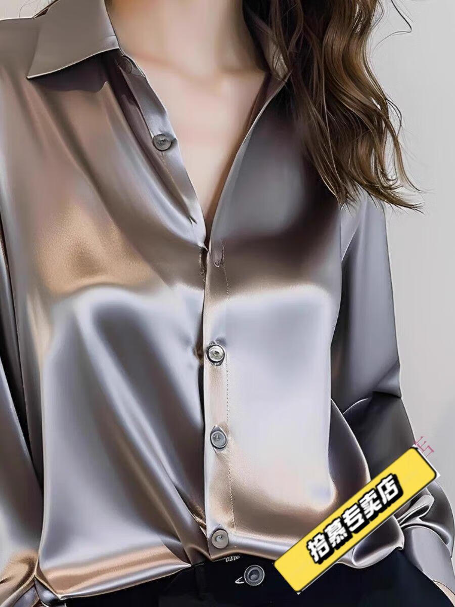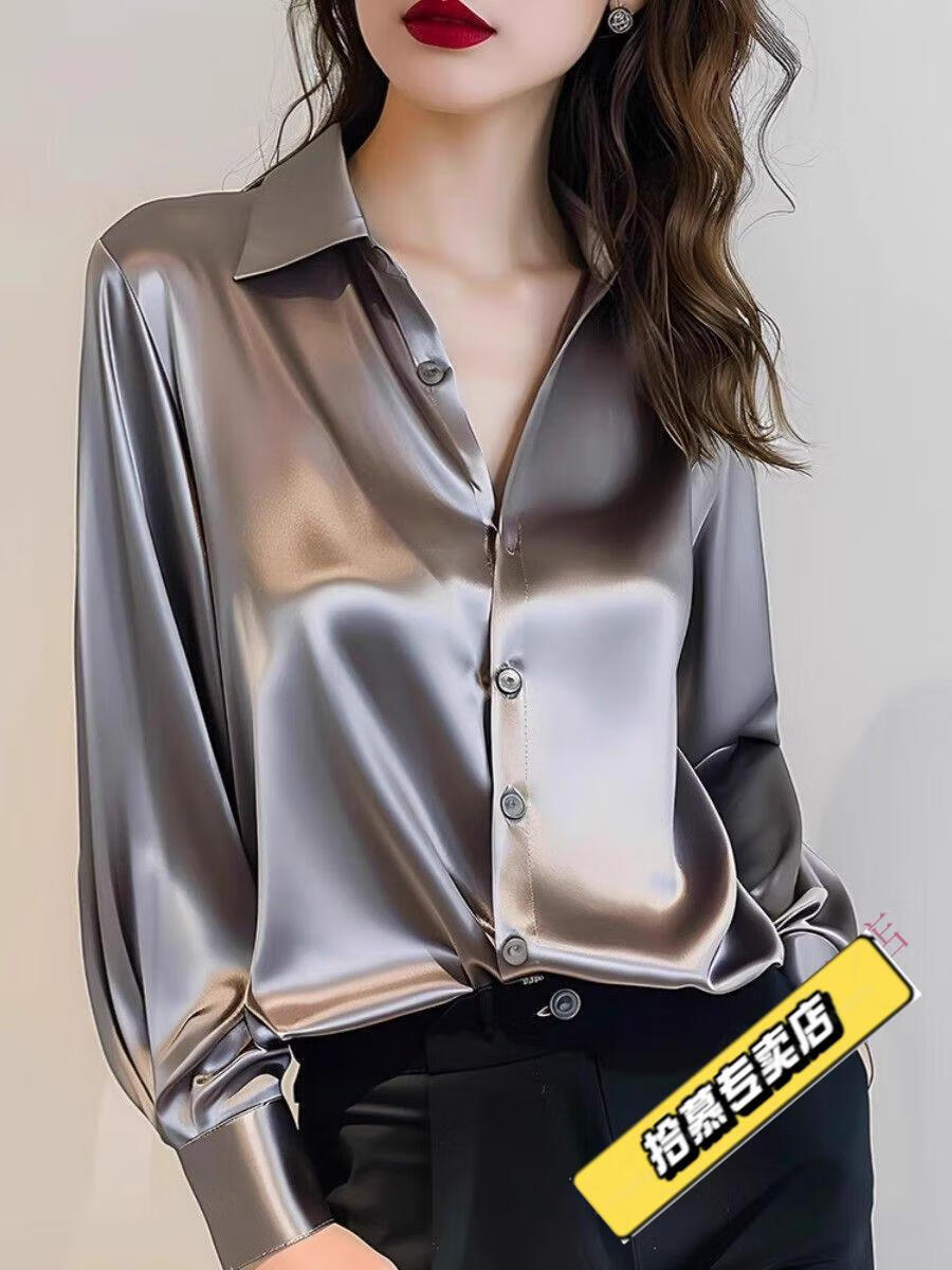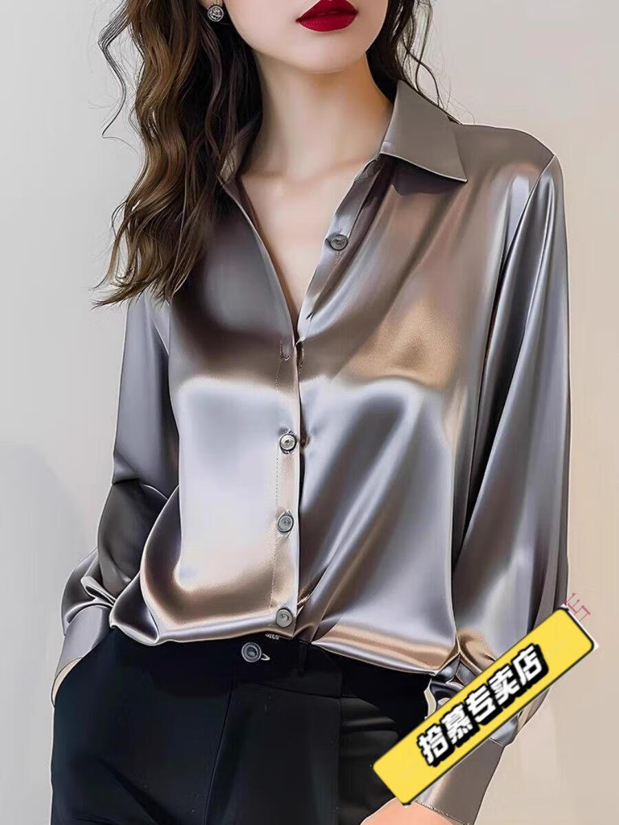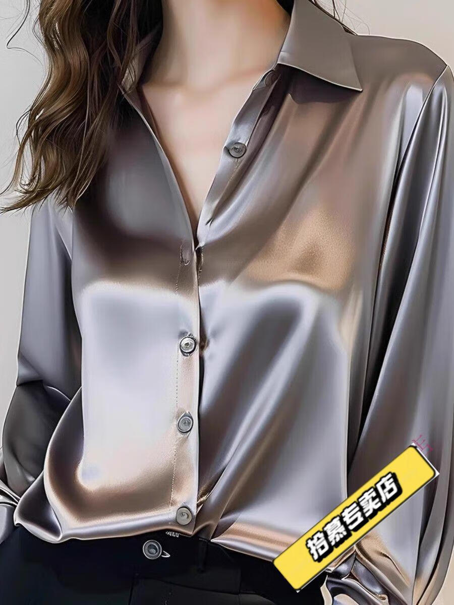 ROMON 2025 Spring and Autumn New Style Gray Acetate Silk Shirt Women's Long Sleeve Chic French Silk Professional Shirt Gray M