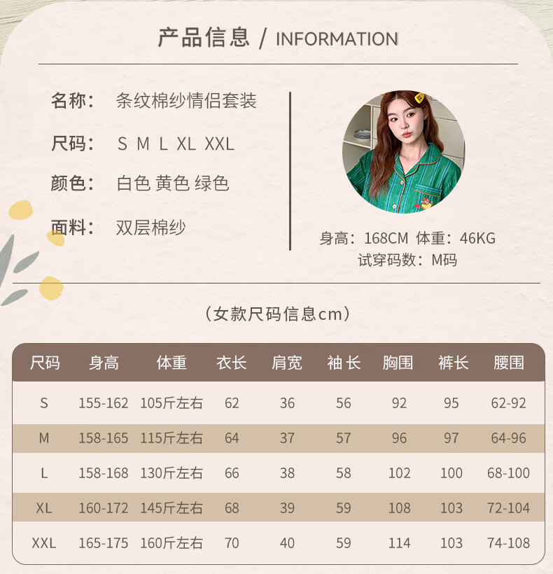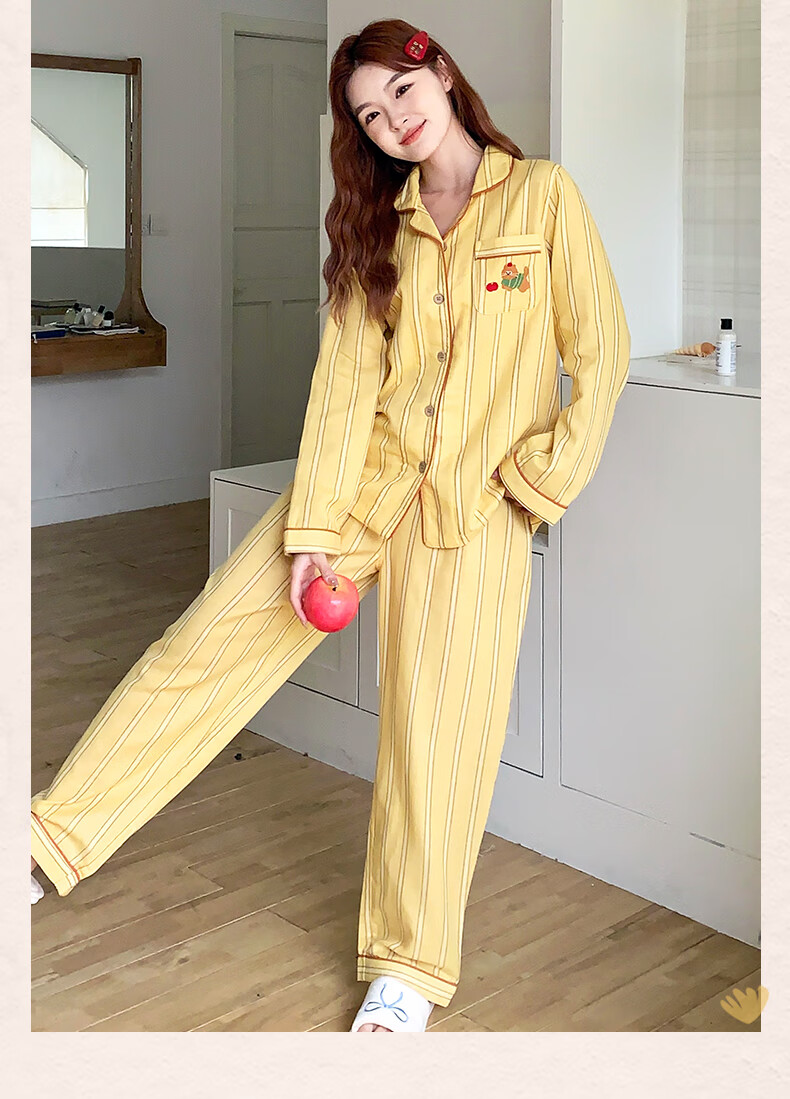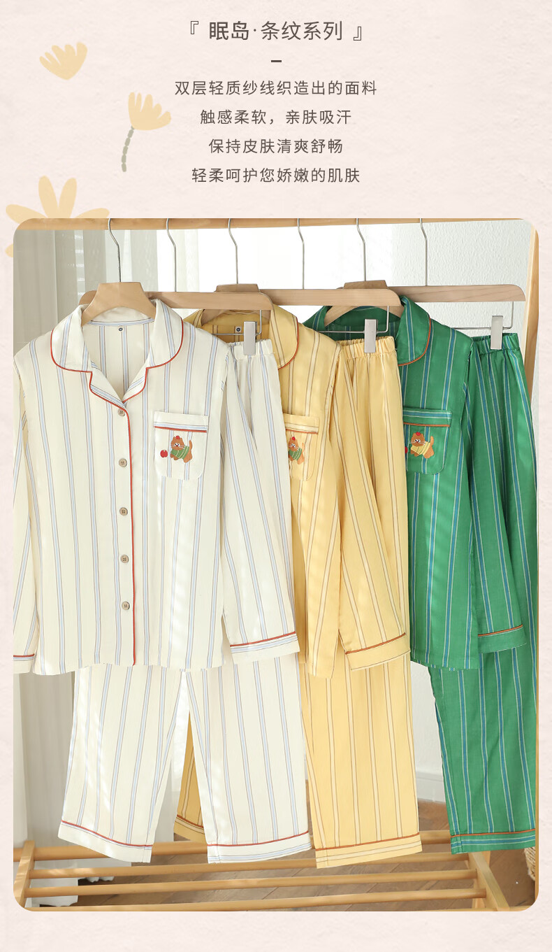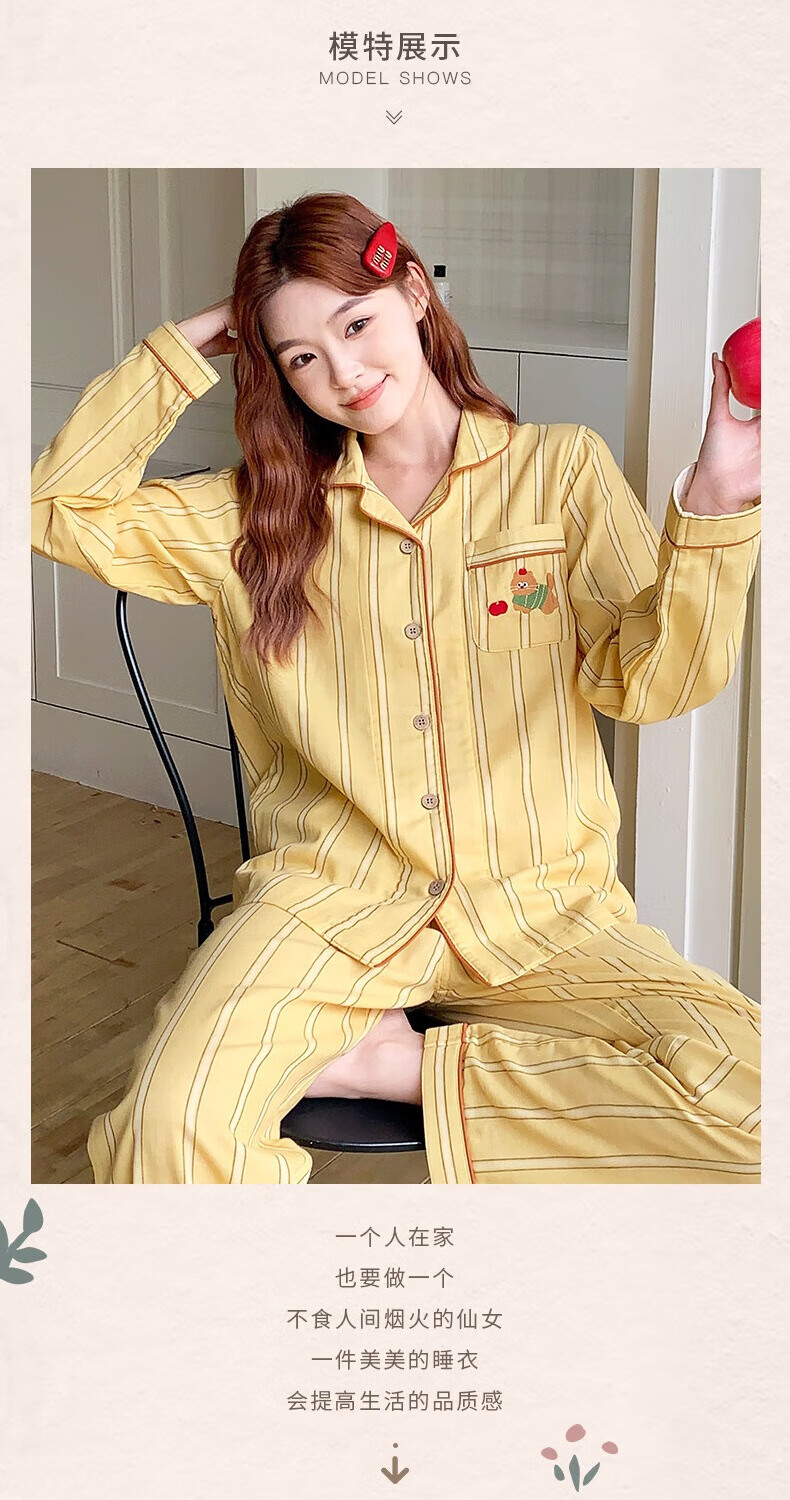 Miandao couple pajamas spring and summer pure cotton gauze long-sleeved suit simple striped men and women can wear outside home clothes yellow strip (women's style) L