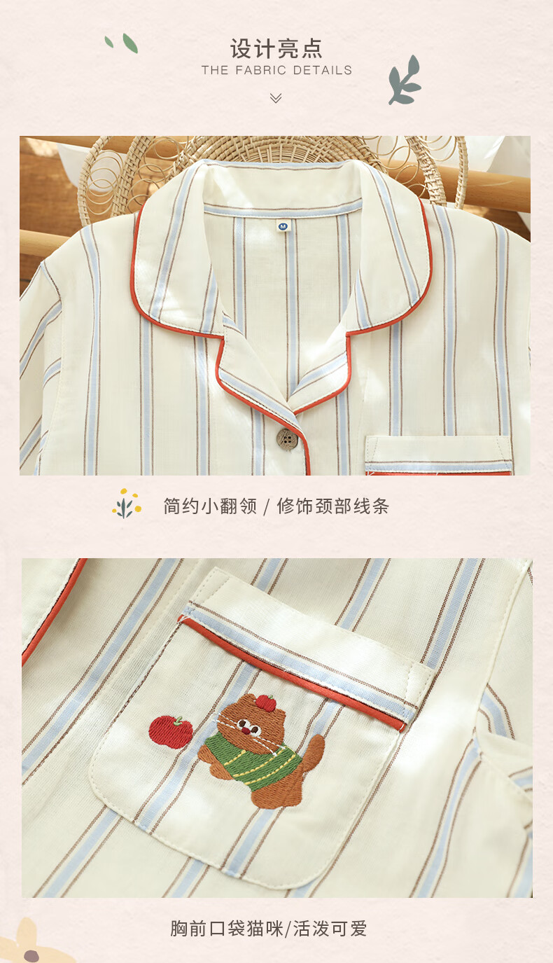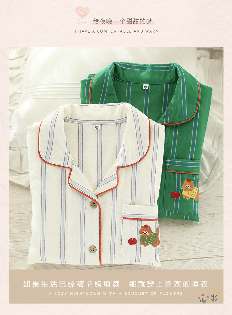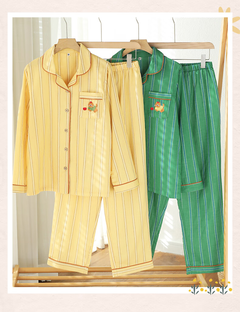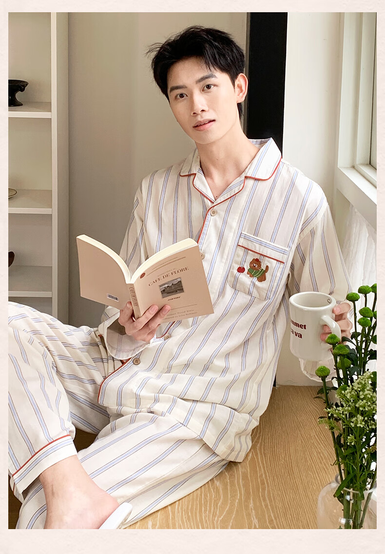 Miandao couple pajamas spring and summer pure cotton gauze long-sleeved suit simple striped men and women can wear outside home clothes yellow strip (women's style) L