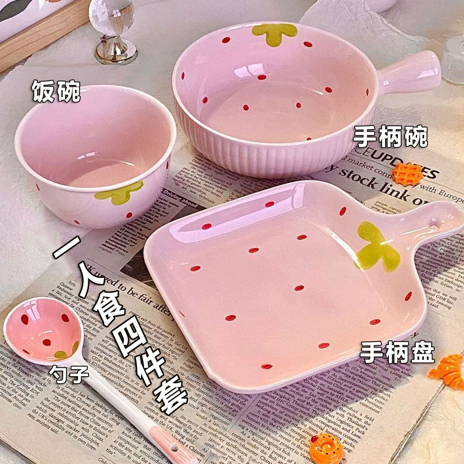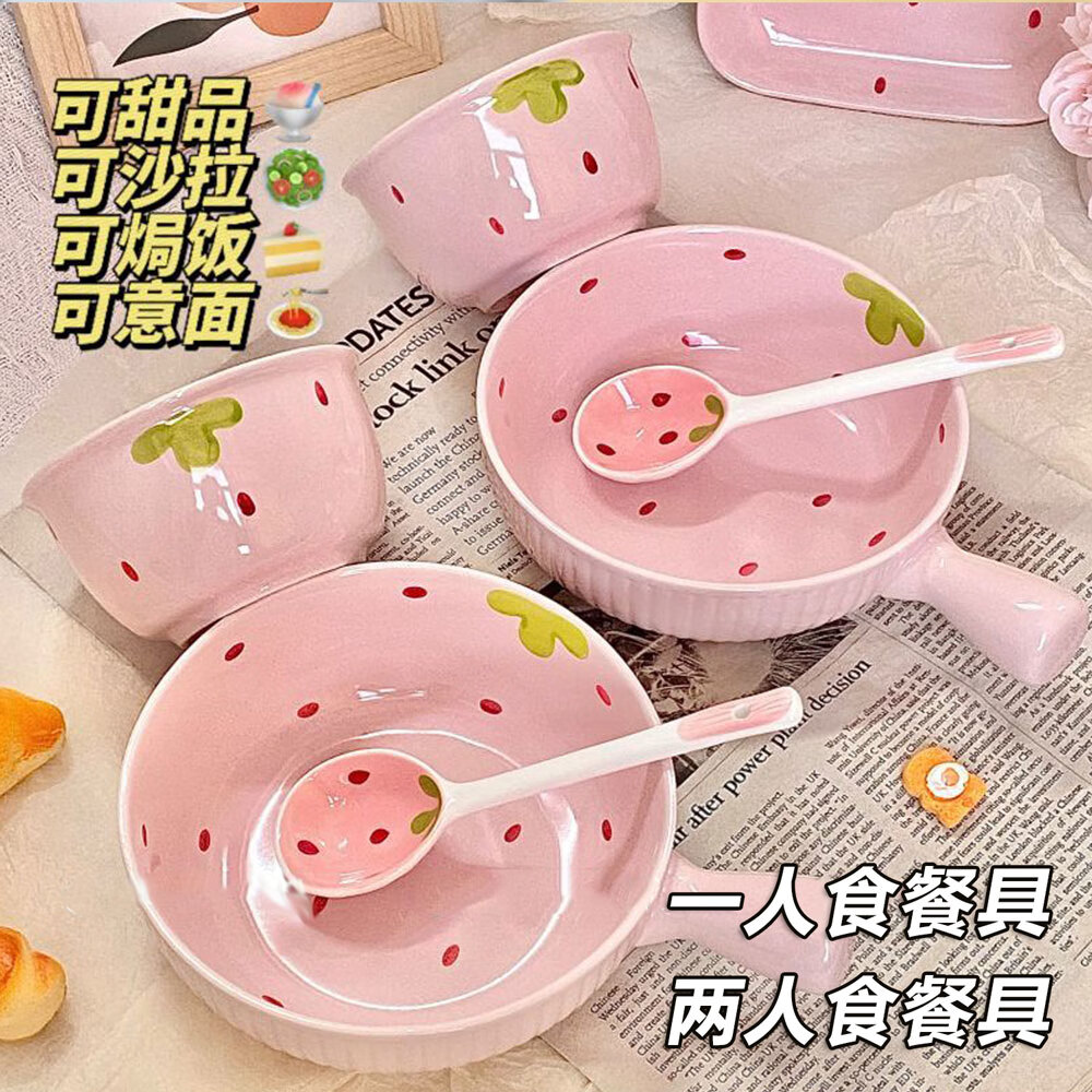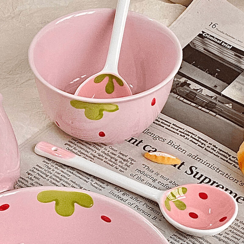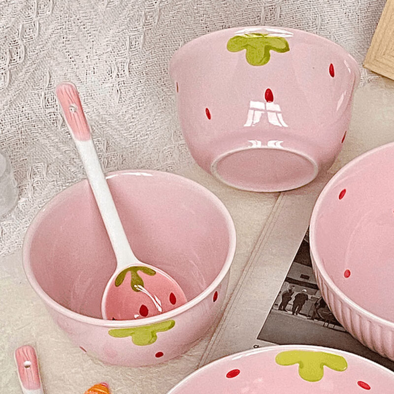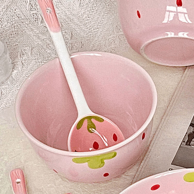 Strawberry ceramic bowl and spoon for home high-looking rice bowl girly heart dessert bowl underglaze color tableware set 4-piece set light pink strawberry 2 bowls 2 spoons