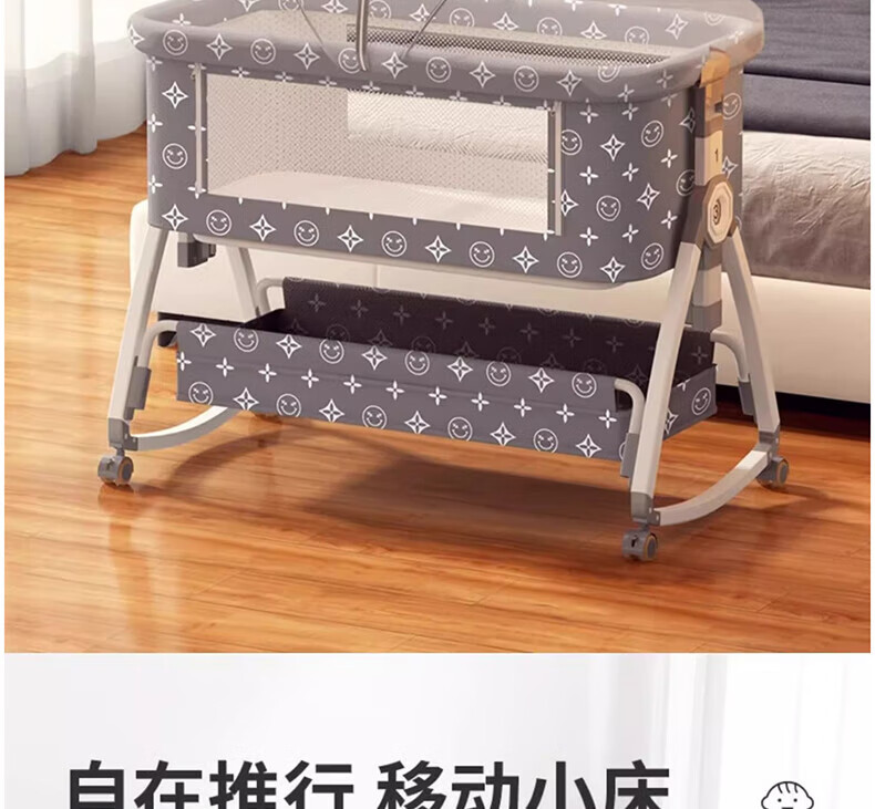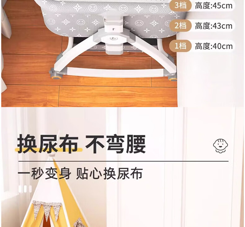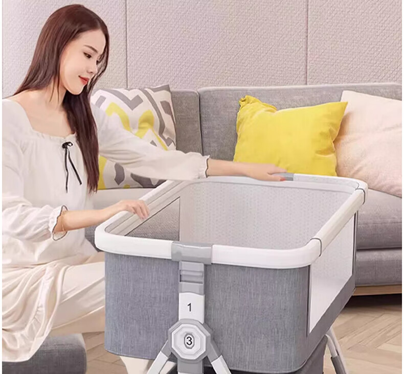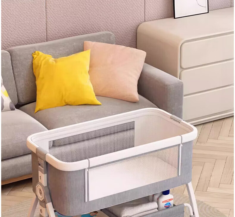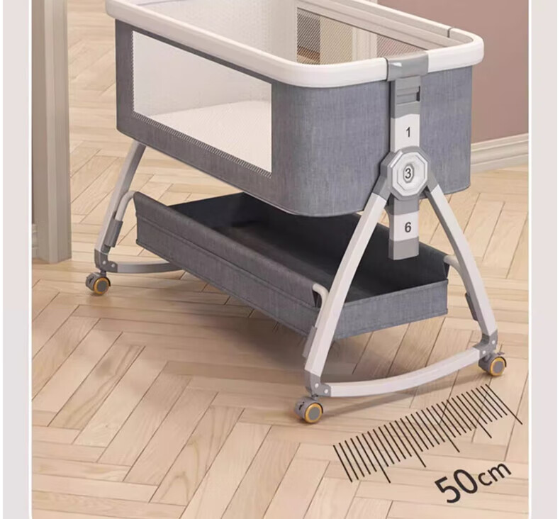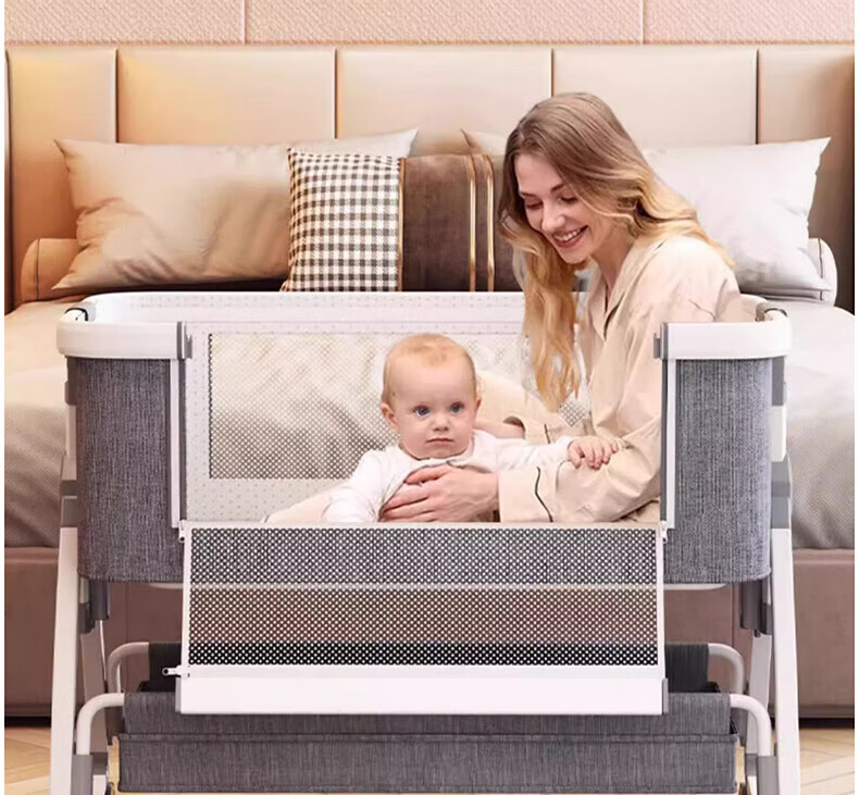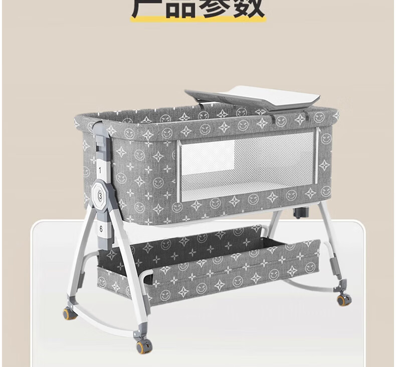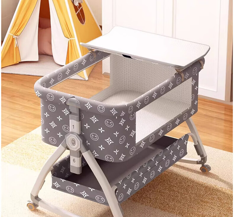 LISM Newborn Crib Multifunctional Bed with Diaper Table, Splicable Bed, Foldable Baby Shaker, Movable High Carbon Steel - Cloud Gray, With Mosquito Net + Diaper Table, Folding Three-in-One Sleeping Device