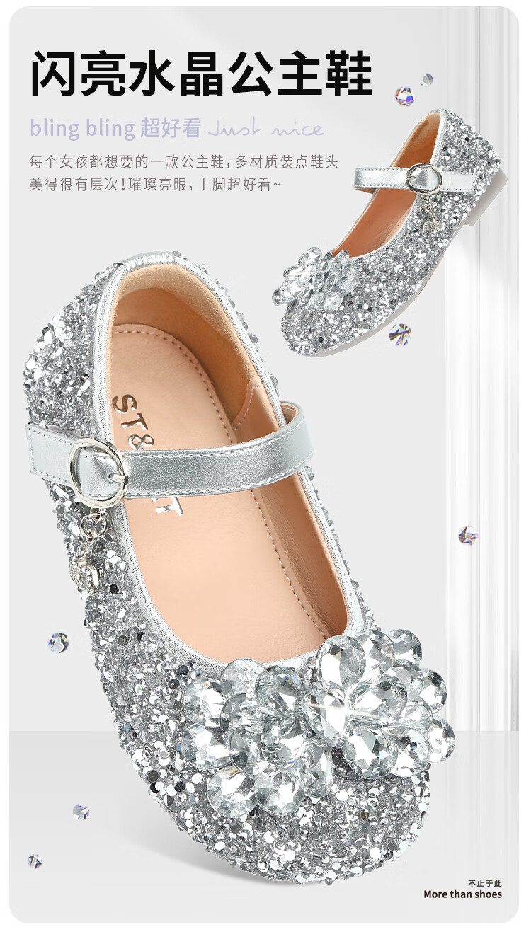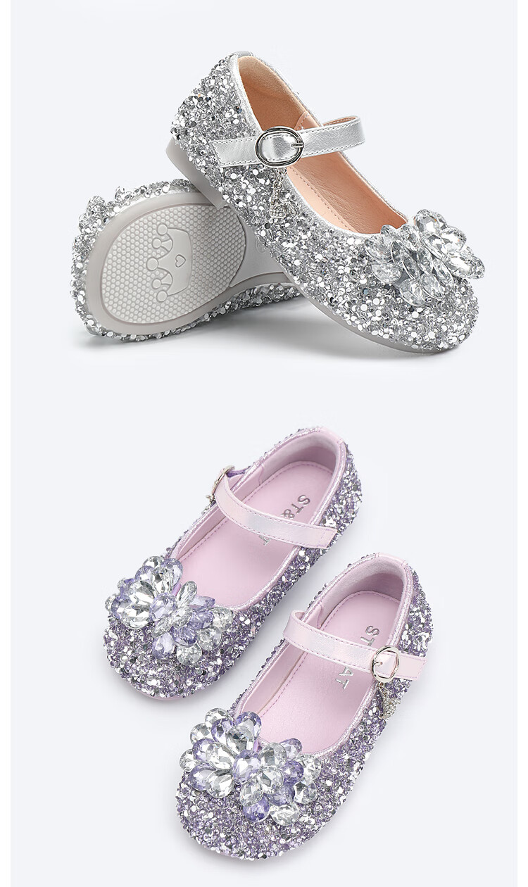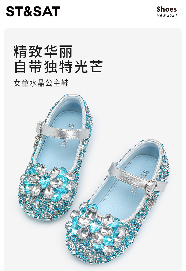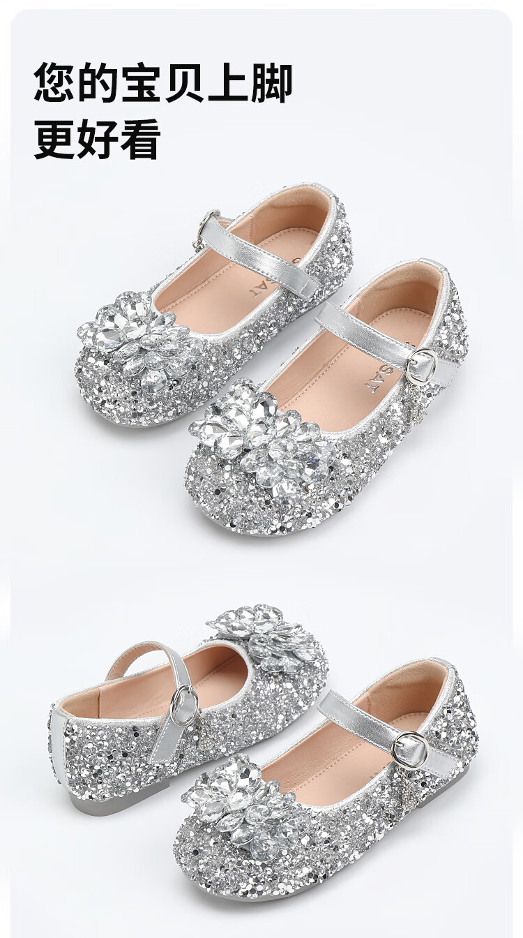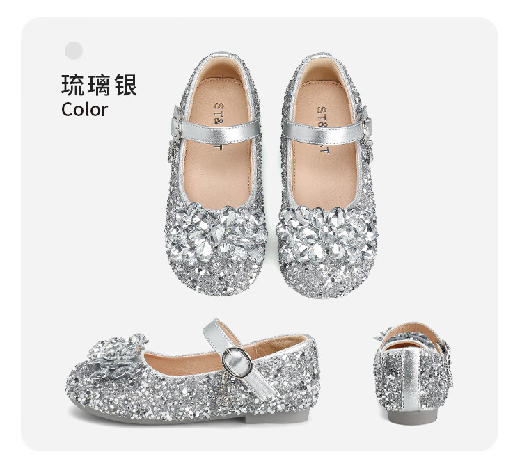 Saturday (St&Sat) children's shoes, girls' shoes, children's fashion small leather shoes, new spring and autumn girls' performance flat crystal shoes, glazed silver 31, inner length about 19.4cm