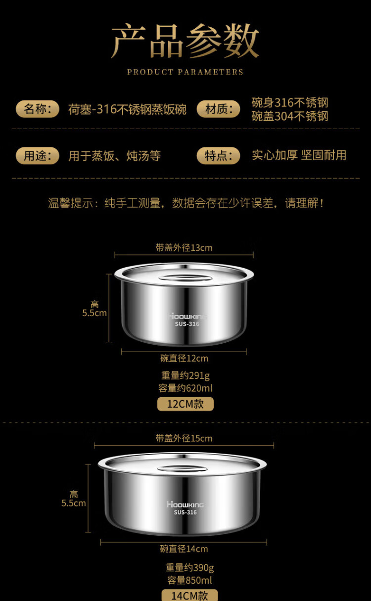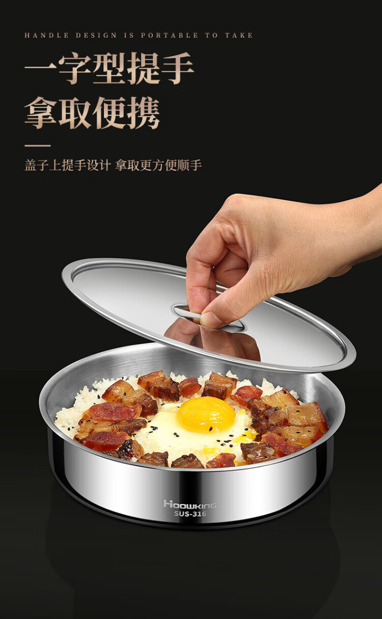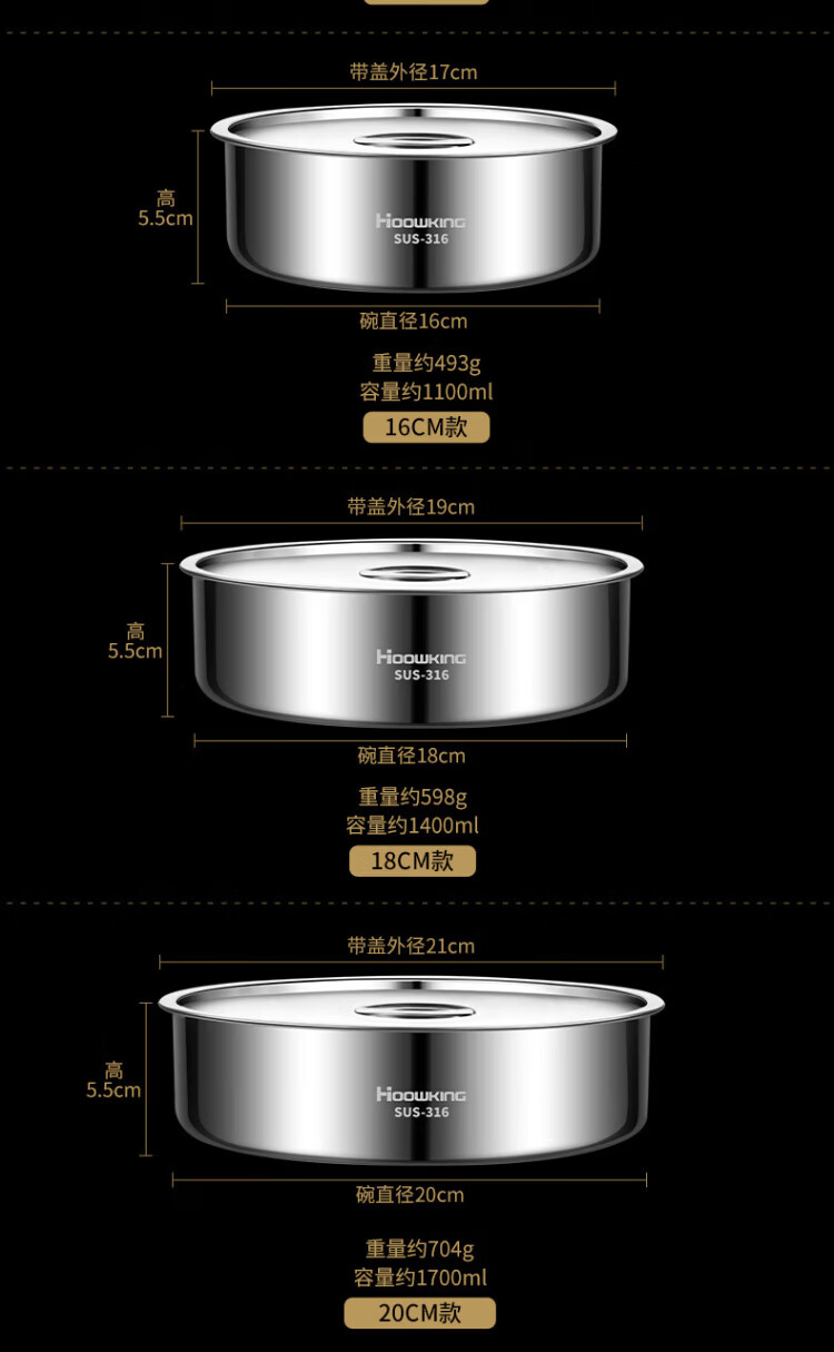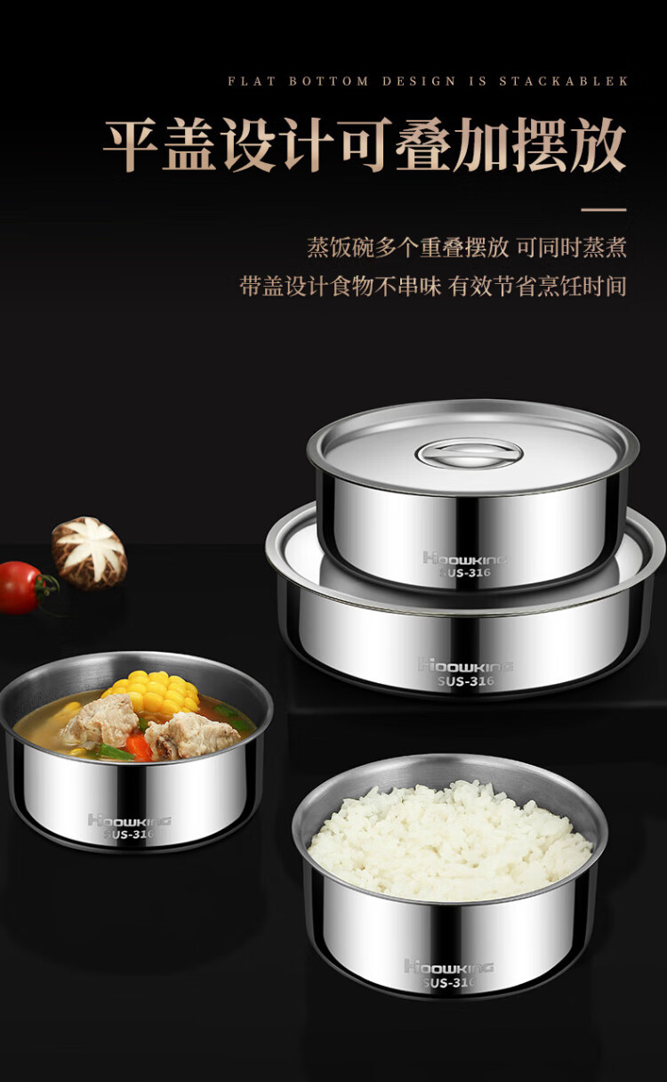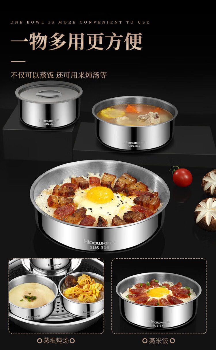 Heqing 316 stainless steel steamed rice bowl, large capacity, household steamed vegetable and egg custard stew pot with lid, thickened soup bowl with lid, steaming bowl, large size 18CM 316 stainless steel