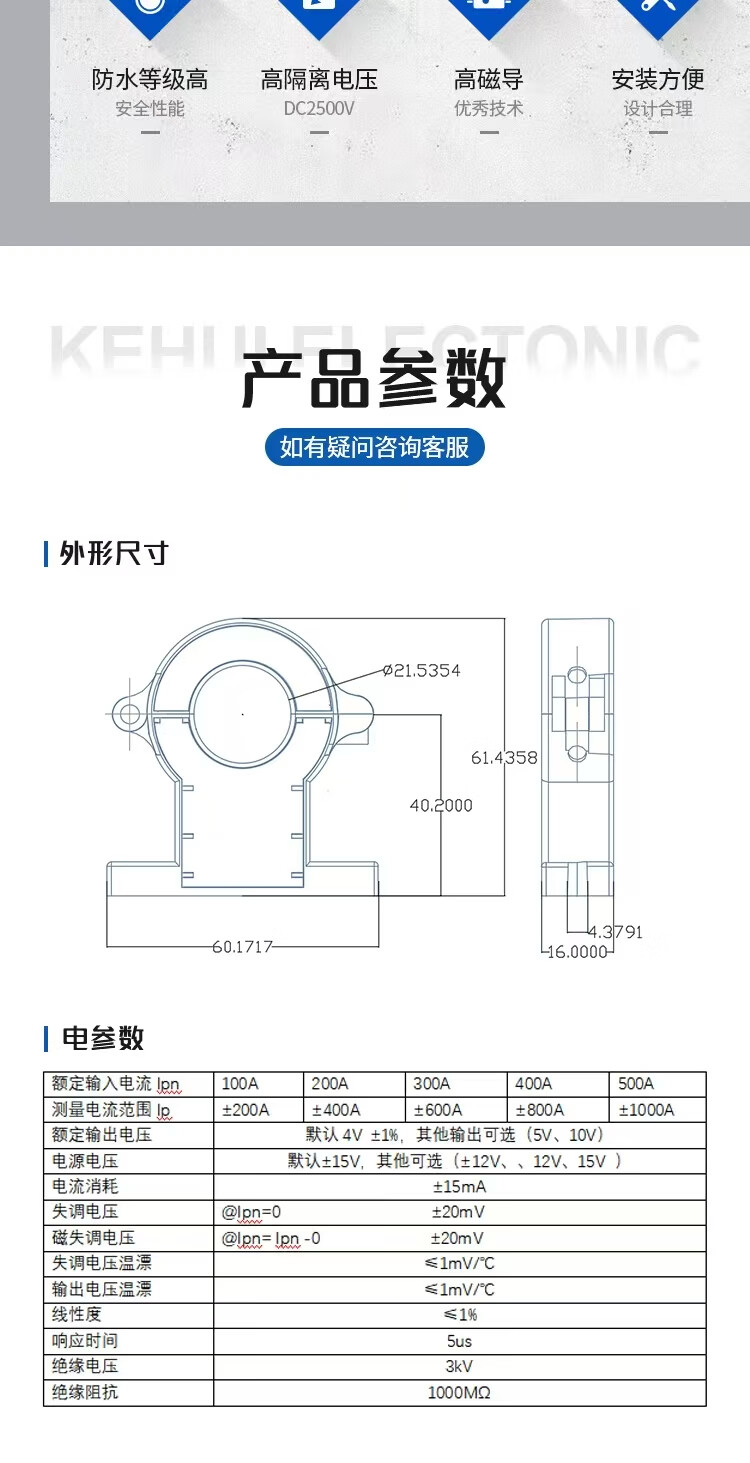 KH/CGQ92 series open open loop closed loop magnetic balance Hall DC current sensor transmitter hole 29mm (DC50A-600A) 5V/10V