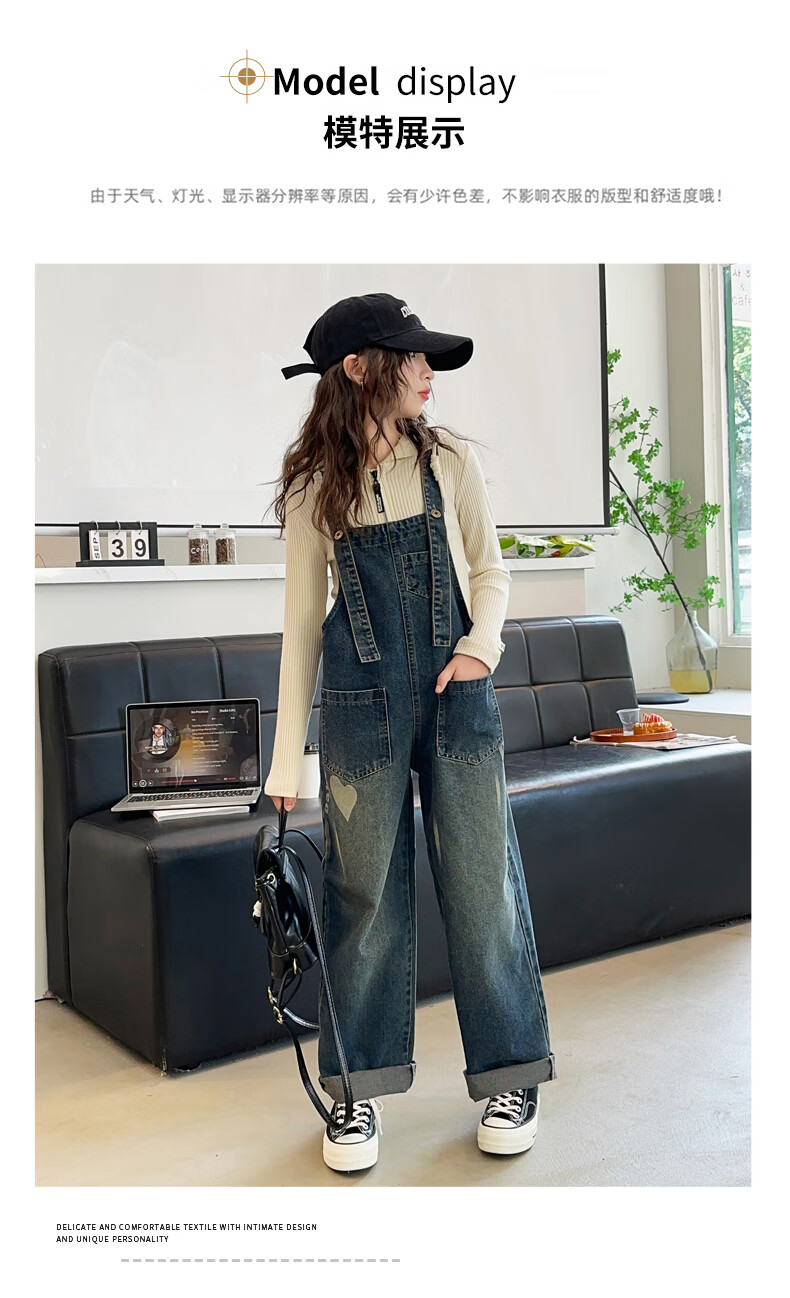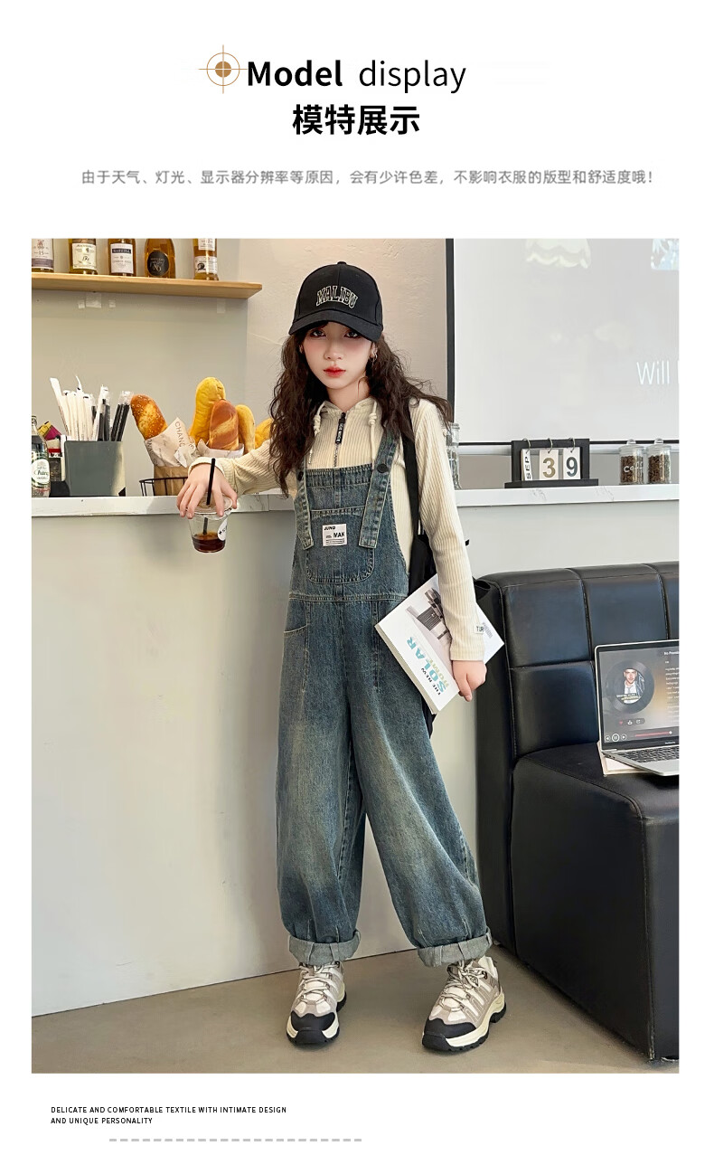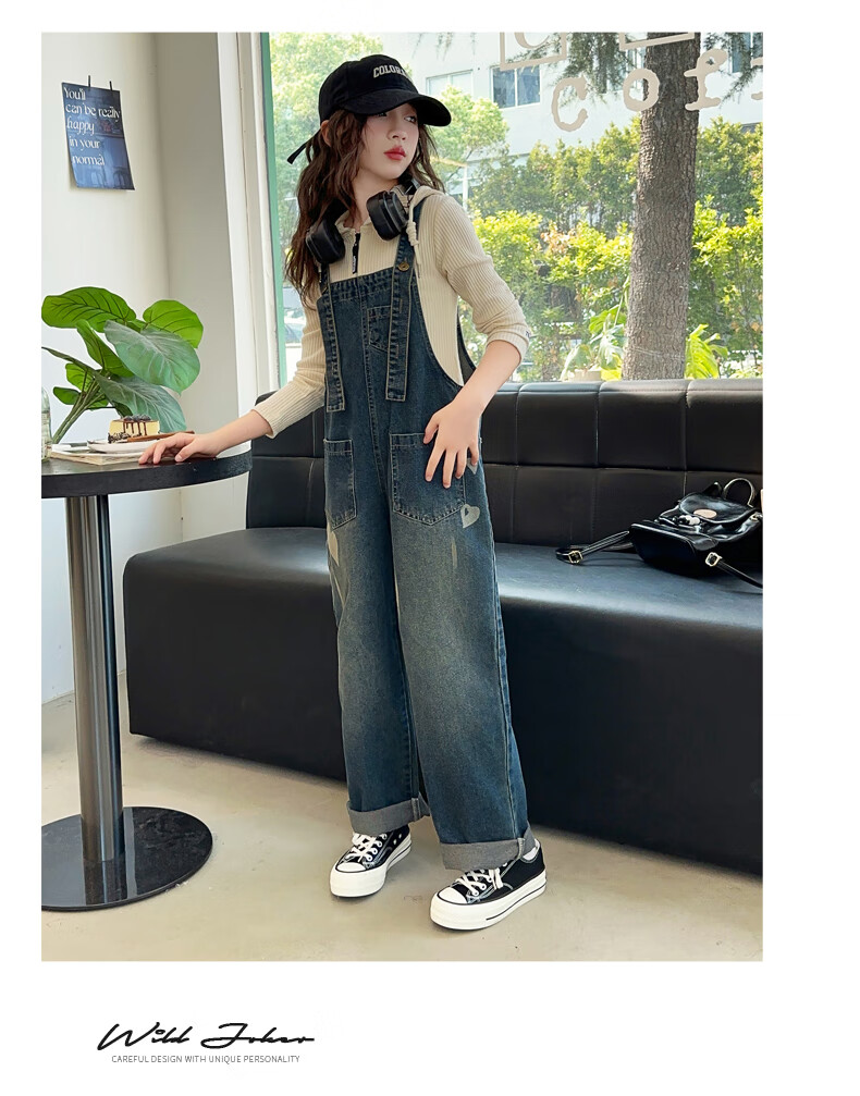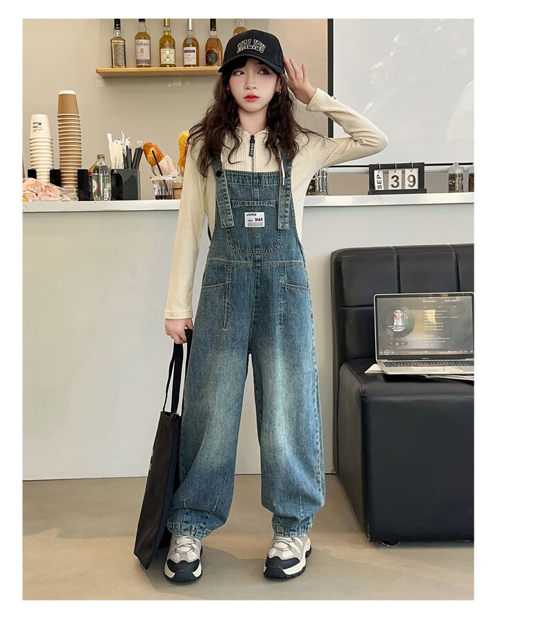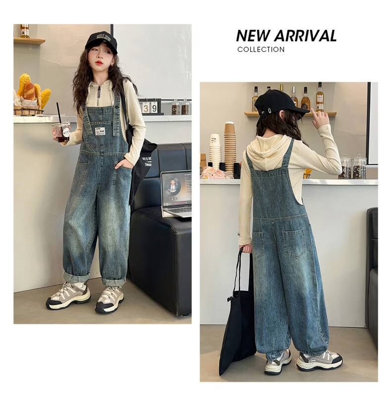 Maidou Xiong Girls Internet Celebrity Overalls Set New Spring and Autumn Clothing Medium and Large Children's Fashionable Denim Overalls Two-piece Set Single-piece Overalls Front Pocket Style 150