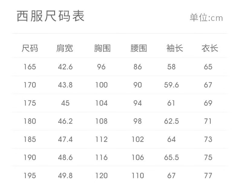 China (cm) 160-165/84-86 165-170 / 88-90 167-172 / 92-96 168-173 / 98-102 170-176 / 106-110