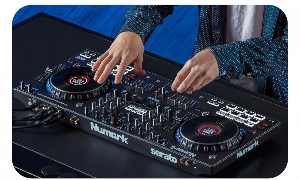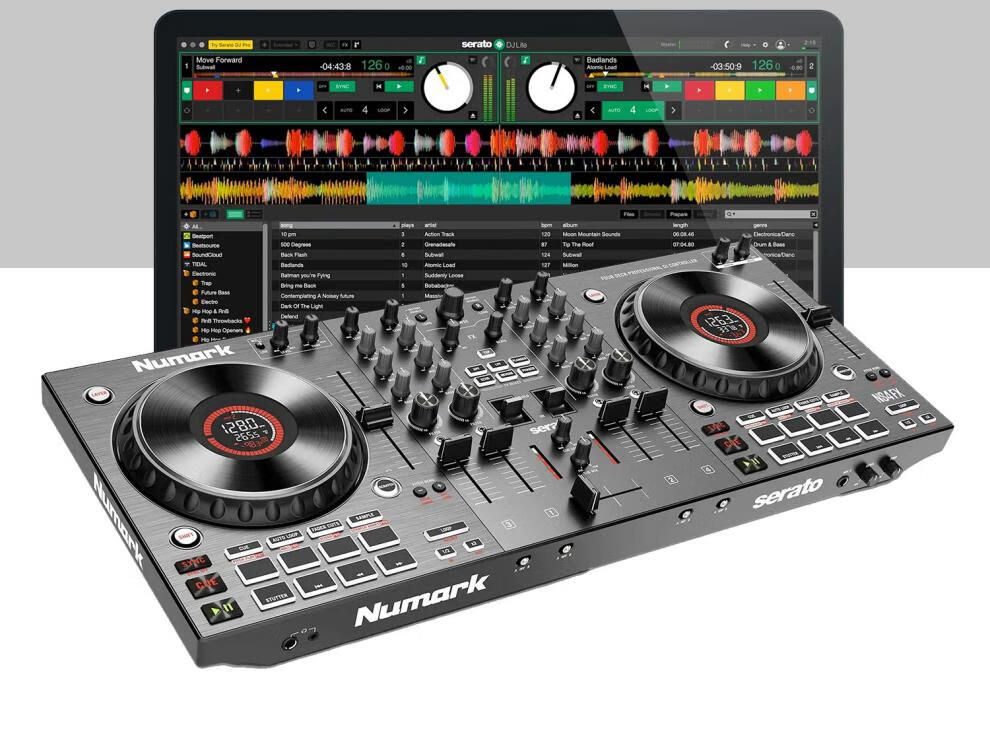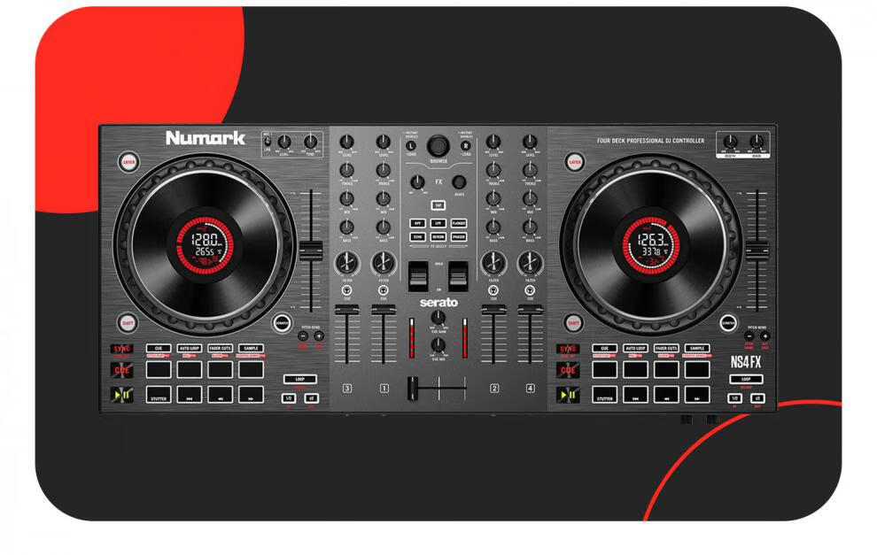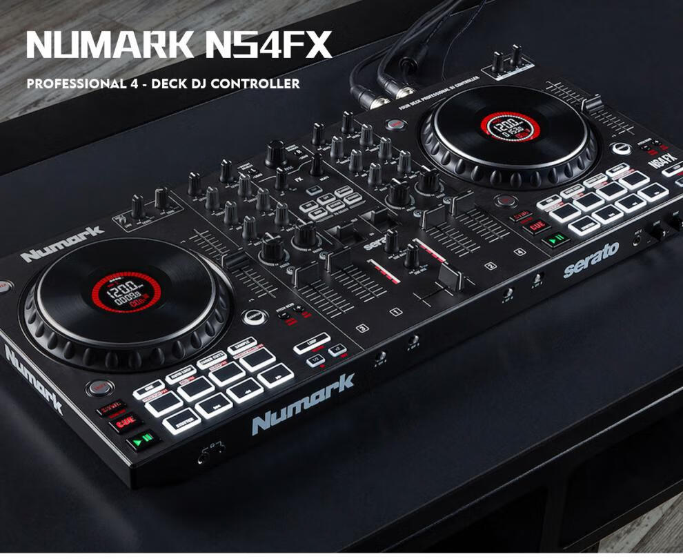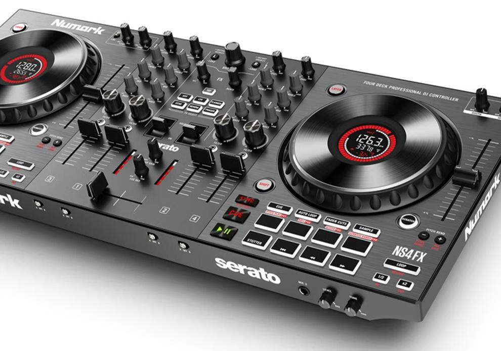 Numark/Luma NS4FX four-channel DJ controller box commercial performance DJ player Serato Lite dark gray