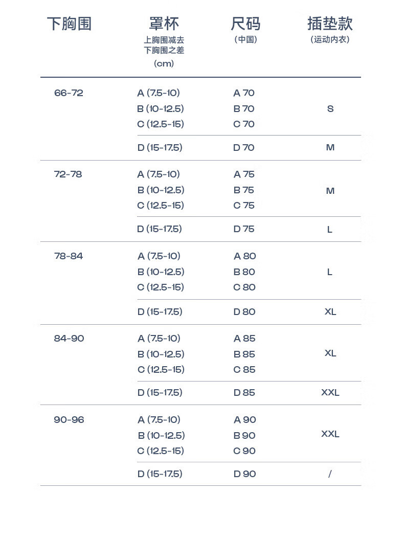 China (cm) 160-165/84-86 165-170 / 88-90 167-172 / 92-96 168-173 / 98-102 170-176 / 106-110