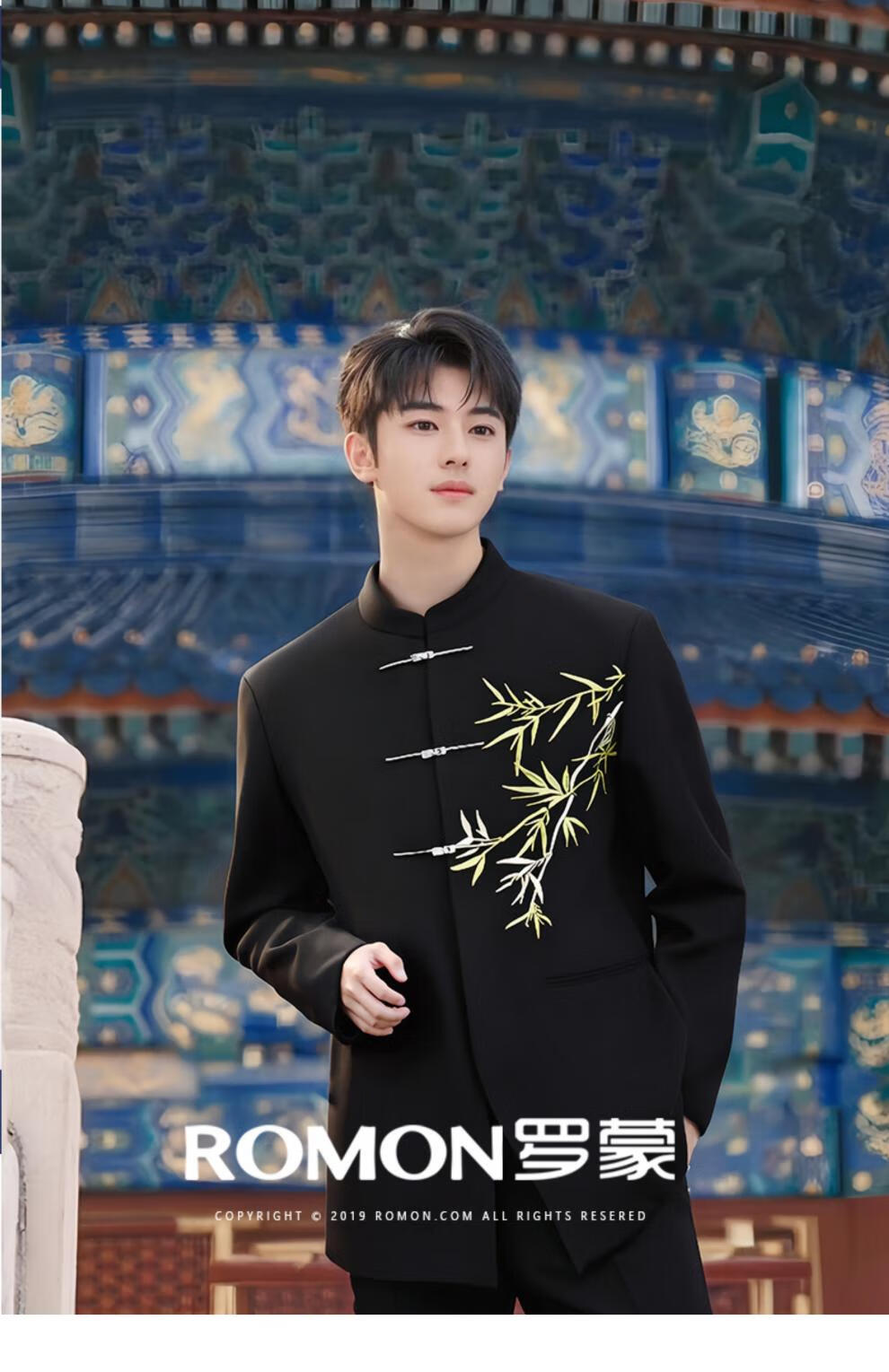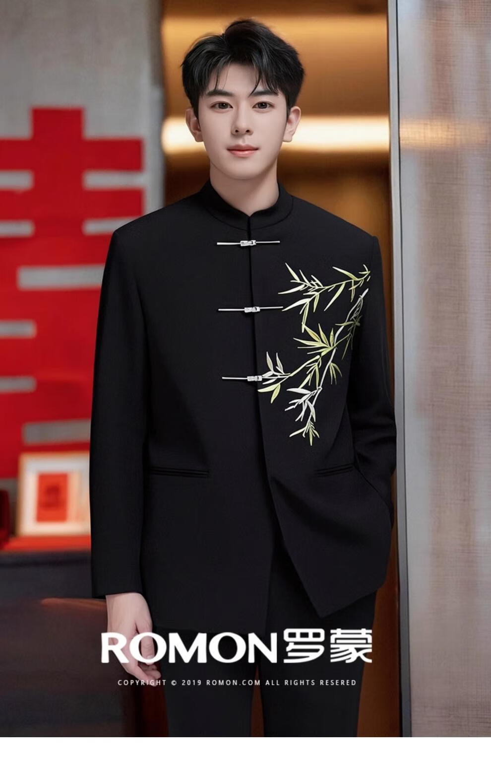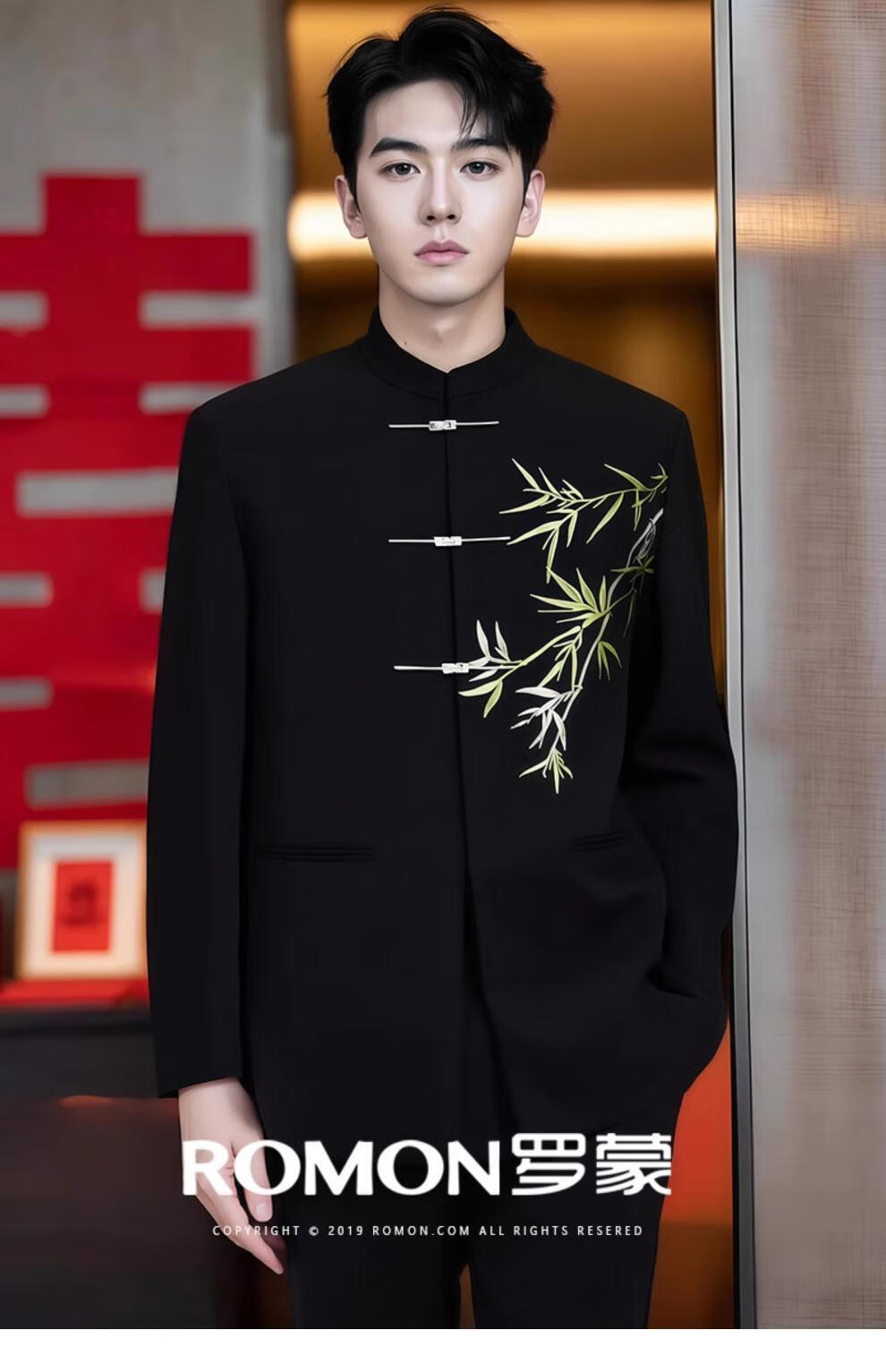 ROMON New Chinese Style Engagement Suit for Men Spring and Autumn New Embroidered Mao Suit Toast Suit Men's Dress Groom's Suit Black Suit XL (161Jin Jin equals 0.5kg -180Jin Jin equals 0.5kg)