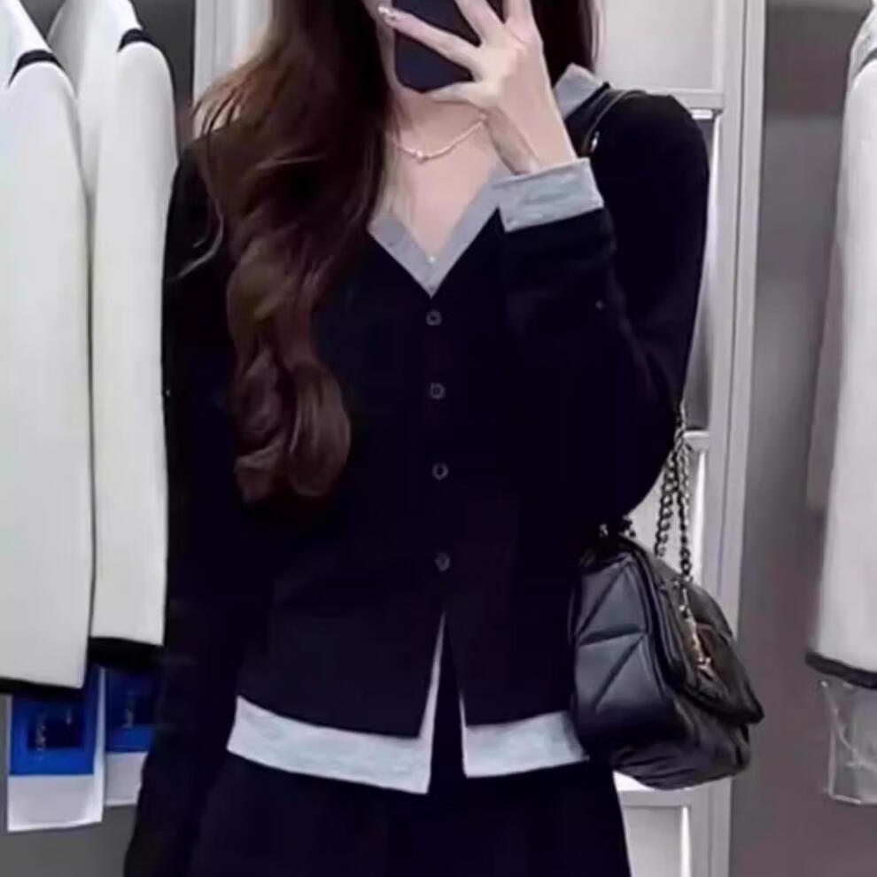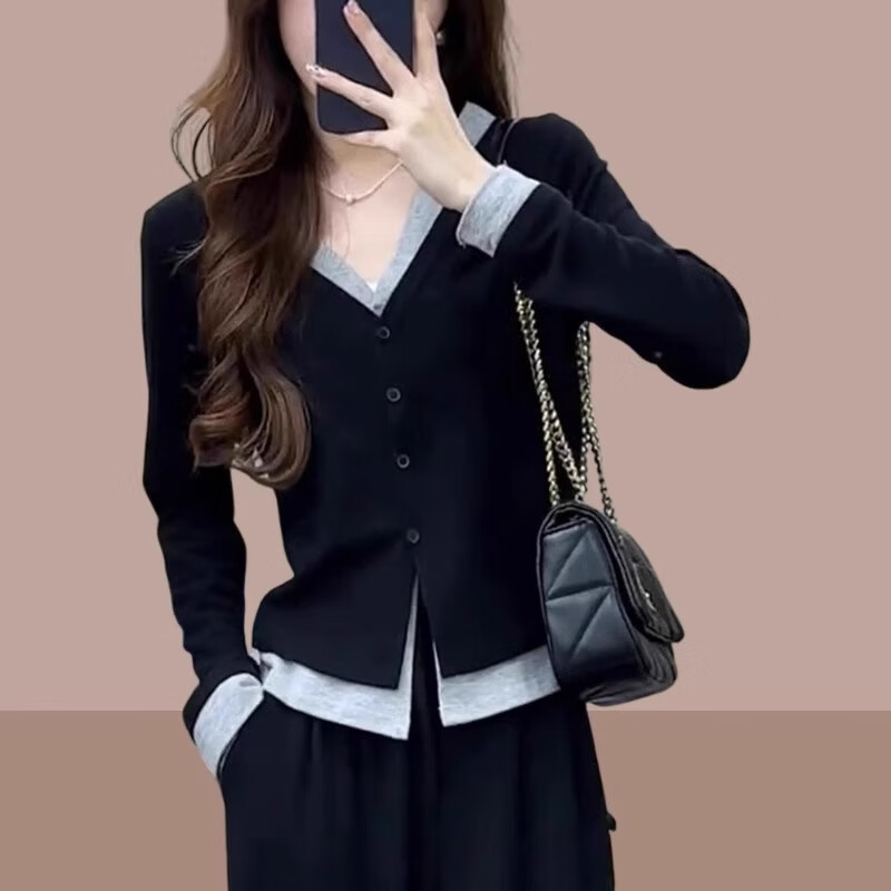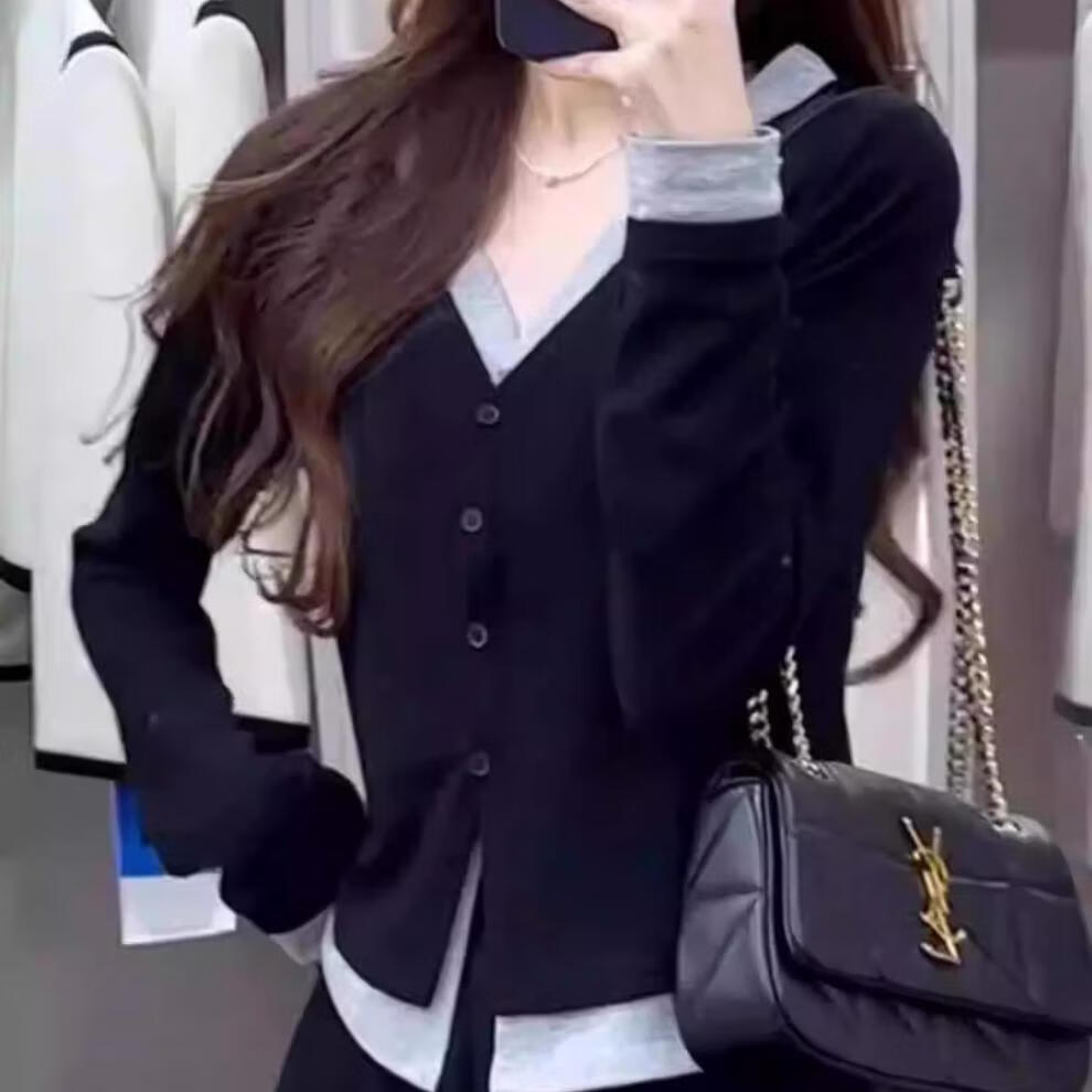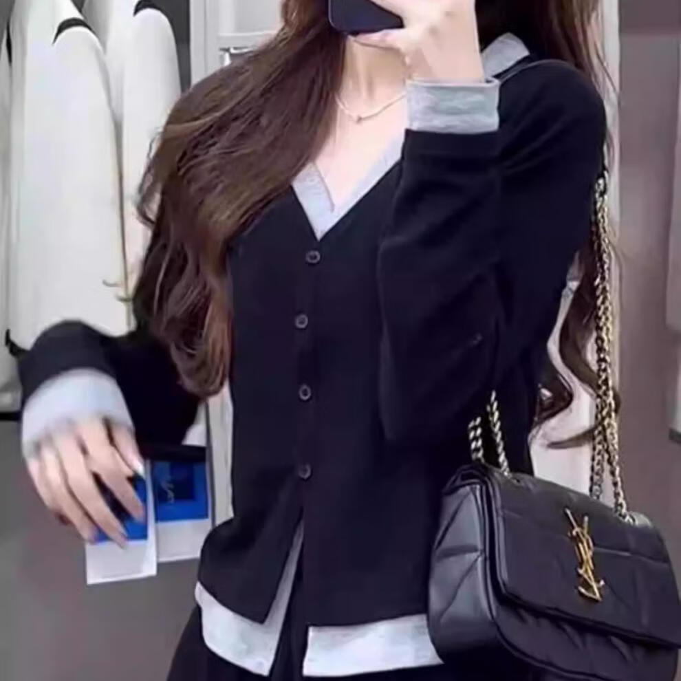 Woodpecker (TUCANO) large size fake two-piece V-neck long-sleeved T-shirt for women in spring and autumn fat MM slim-fitting bottoming shirt slimming cardigan new top Picture color L Recommended 100Jin Jin is equal to 0.5kg -120Jin Jin is equal to 0.5kg