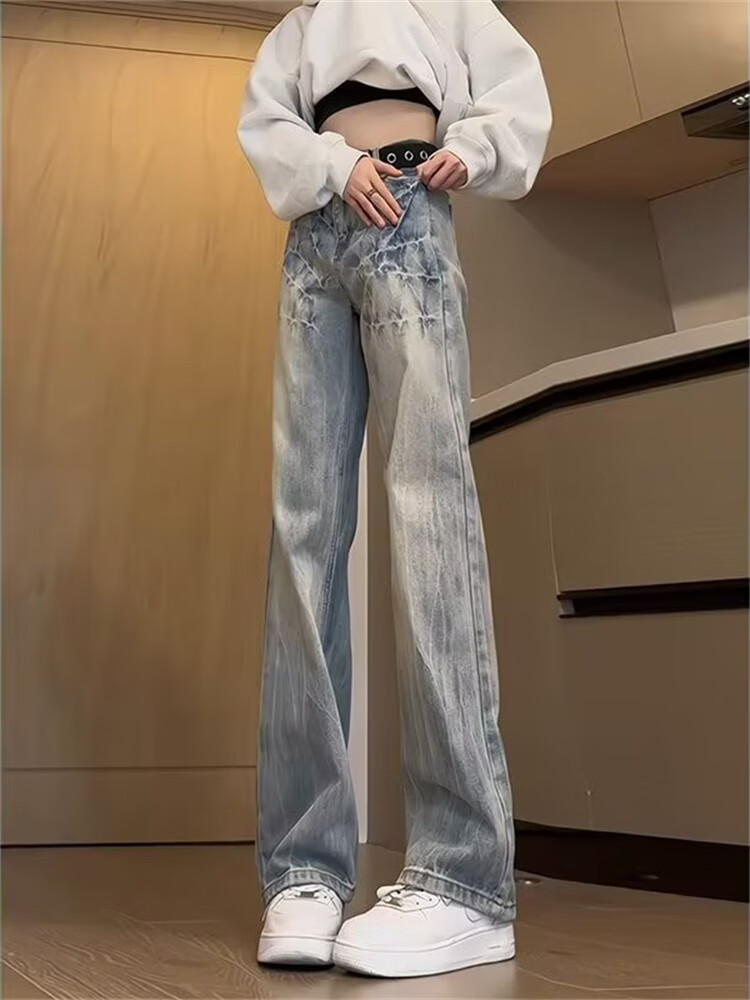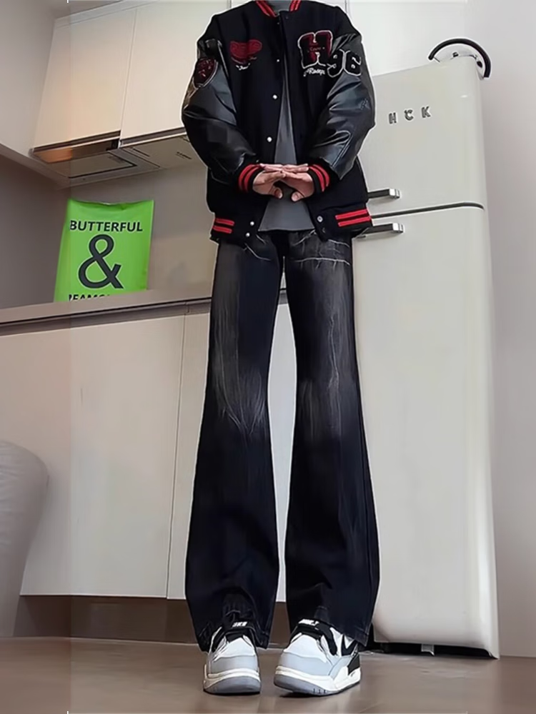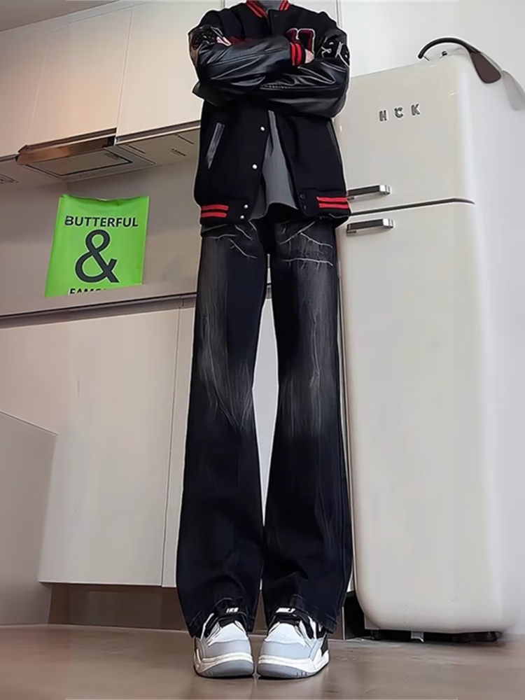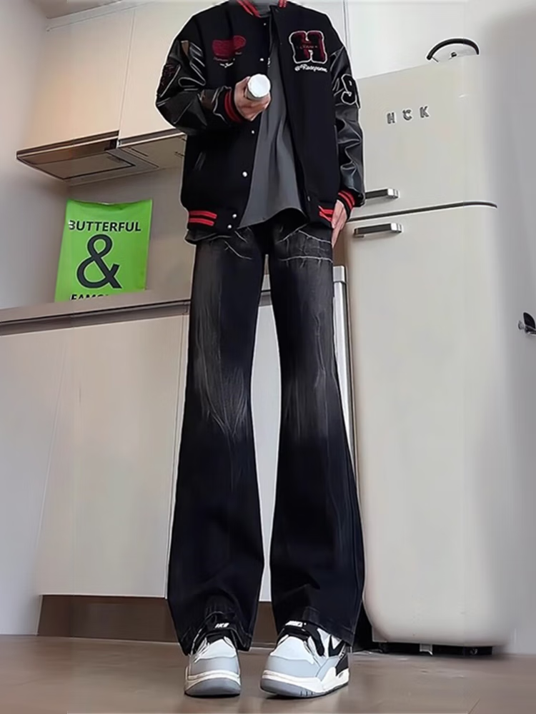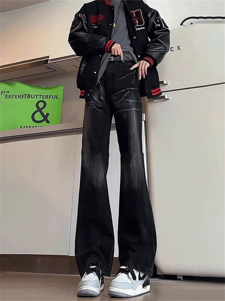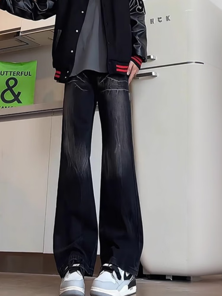 Yiran presents jeans for men with slightly flared autumn and winter style, lightning pattern, handsome design, American high street scimitar straight pants for men, black L recommended 105-125 Jin Jin equals 0.5 kg
