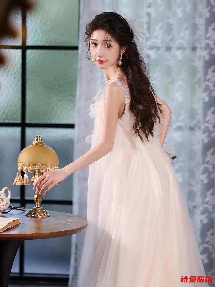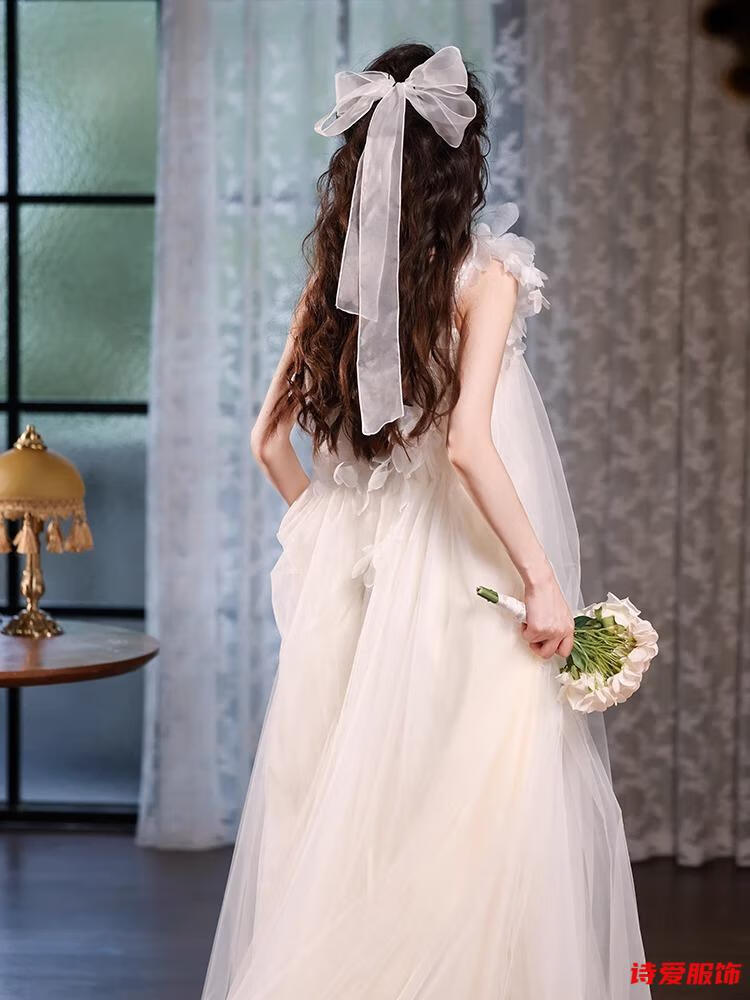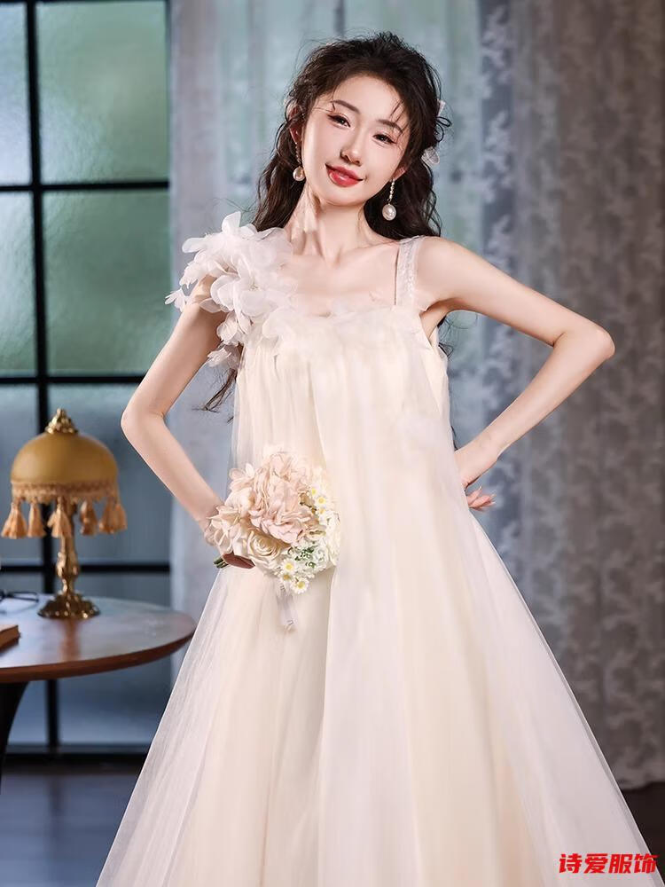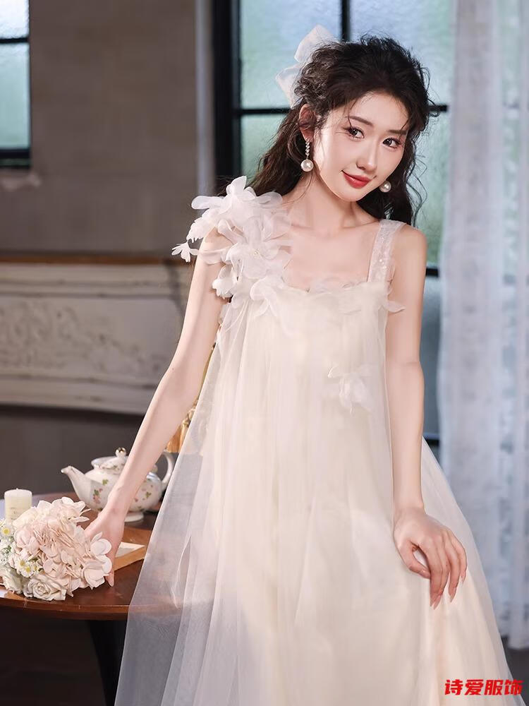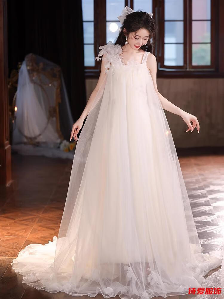 Dongyan dressing gown female bride wedding fairy suspender engagement dress new style French travel photography light wedding dress small white M