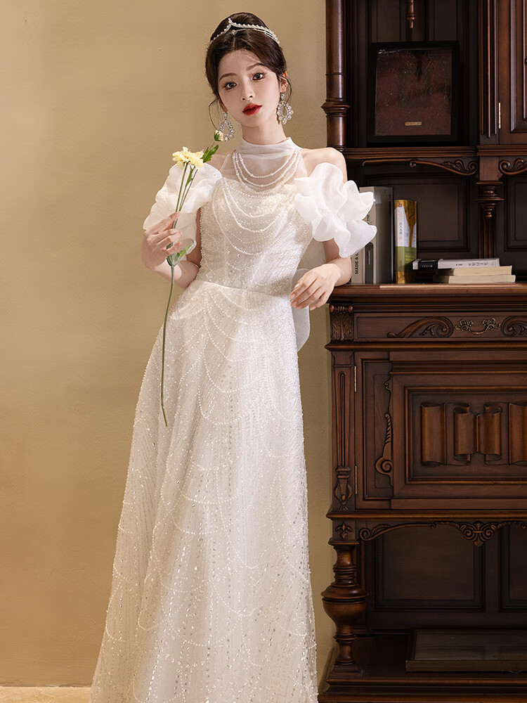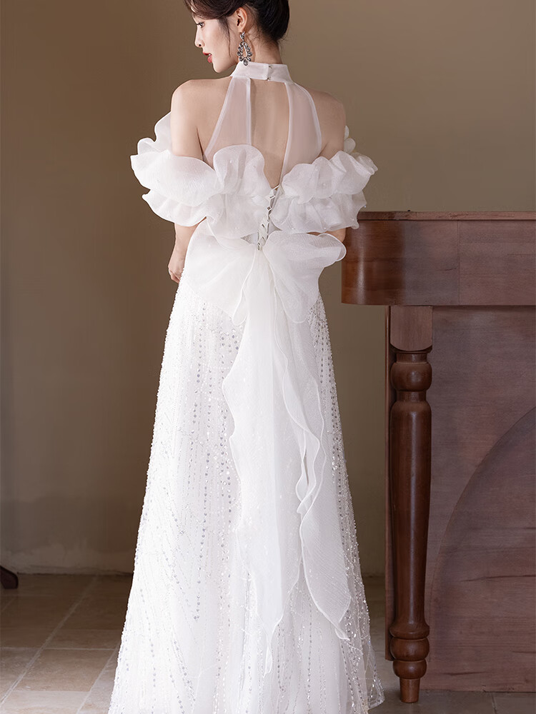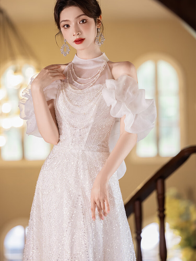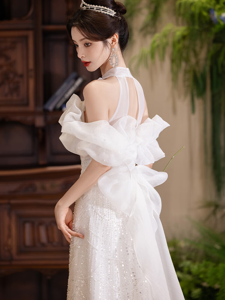 Wutuo white halterneck slim-fitting evening dress French bridal wedding toast clothing light luxury niche birthday party performance clothing with white ceremony (52412) L
